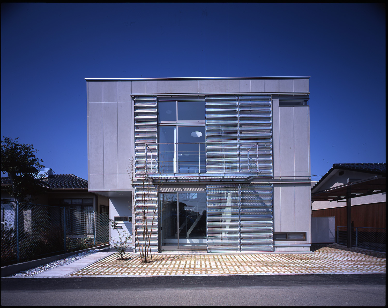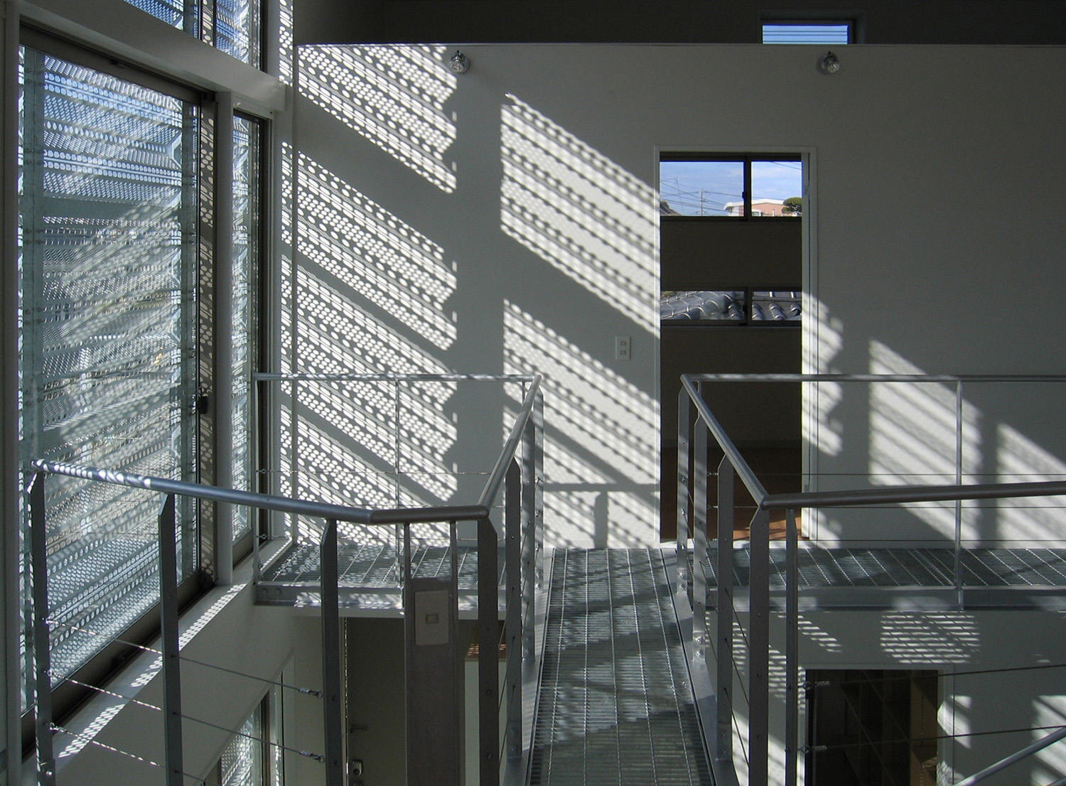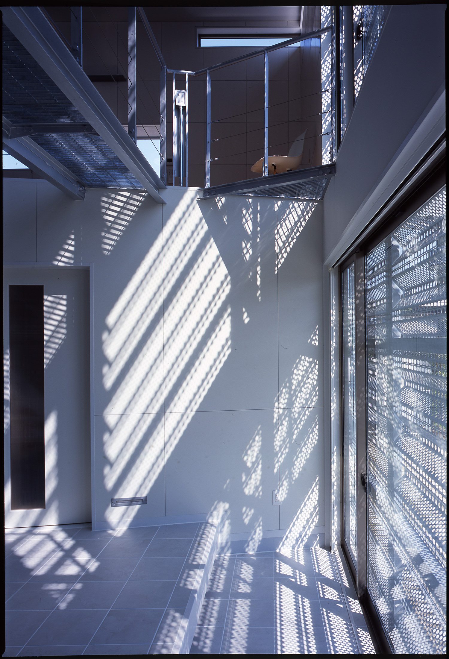 プライバシーやセキュリティを確保しつつ、かつ、空間的に閉鎖的にならないようにという相反する課題について、雨戸をデバイスとして捉え直し、積極的にデザインすることで、問題の解決を試みている。雨戸をフィルターとして機能させるために、面材にはパンチング素材の防雪板を採用している。パンチング素材は閉じていても自然の風を通す。さらに、独特の陰影を生む。そこから生み出される光と影は時間とともに複雑に変化し、室内空間を豊かに彩る。時間も空間に彩りを添える重要な役割と考え計画されている。雨戸を閉じれば、開口部を防御する堅固な覆いとなり、また、全開にすれば外部に対して1Fホールを開放して人を招き入れることもできる。雨戸の開け具合により外部とのつながりの程度を状況に応じて調整できるようになっている。