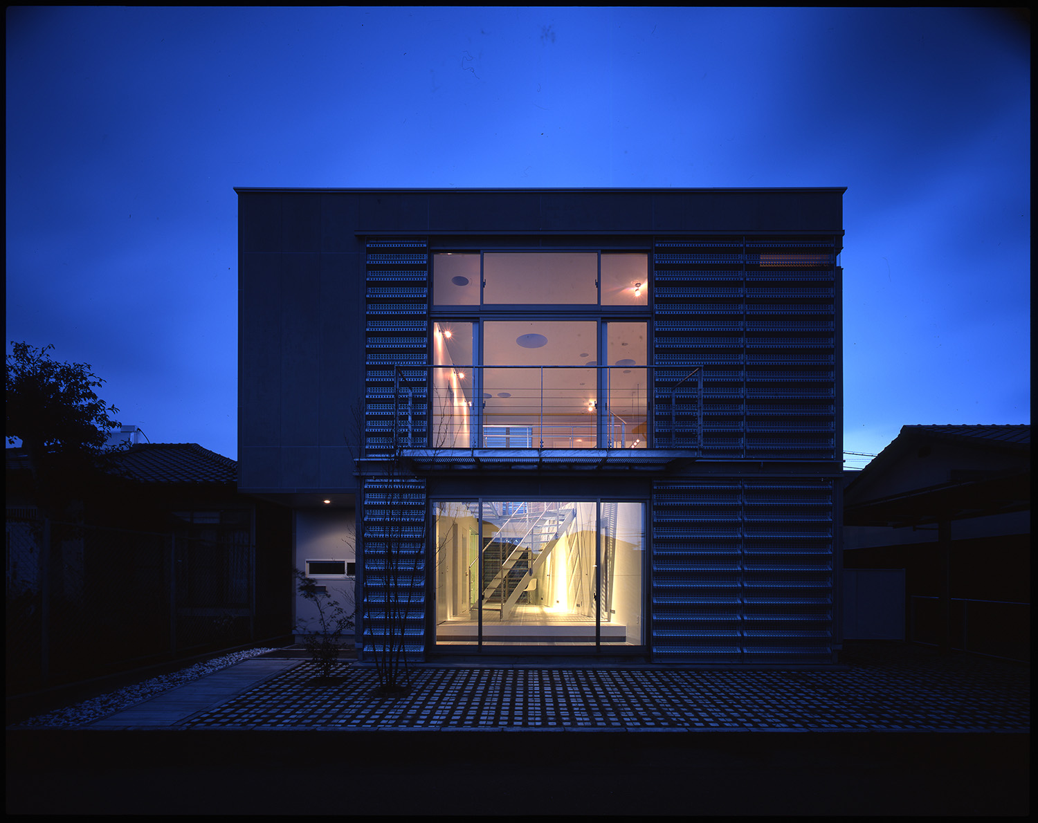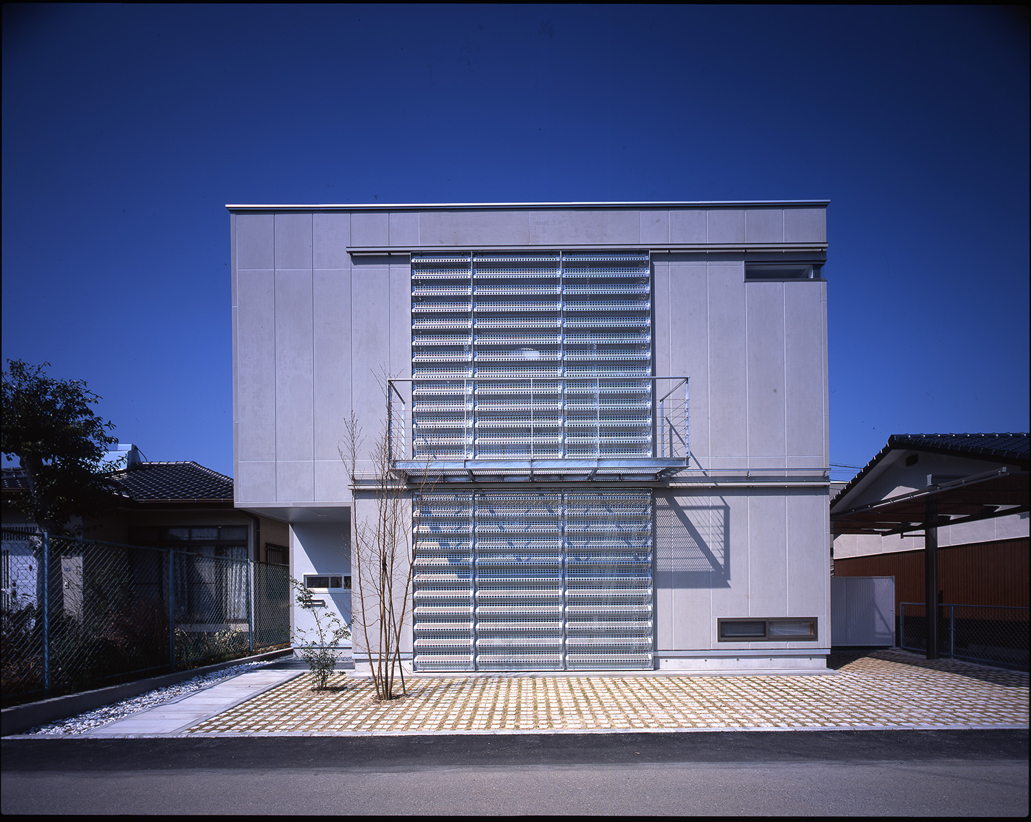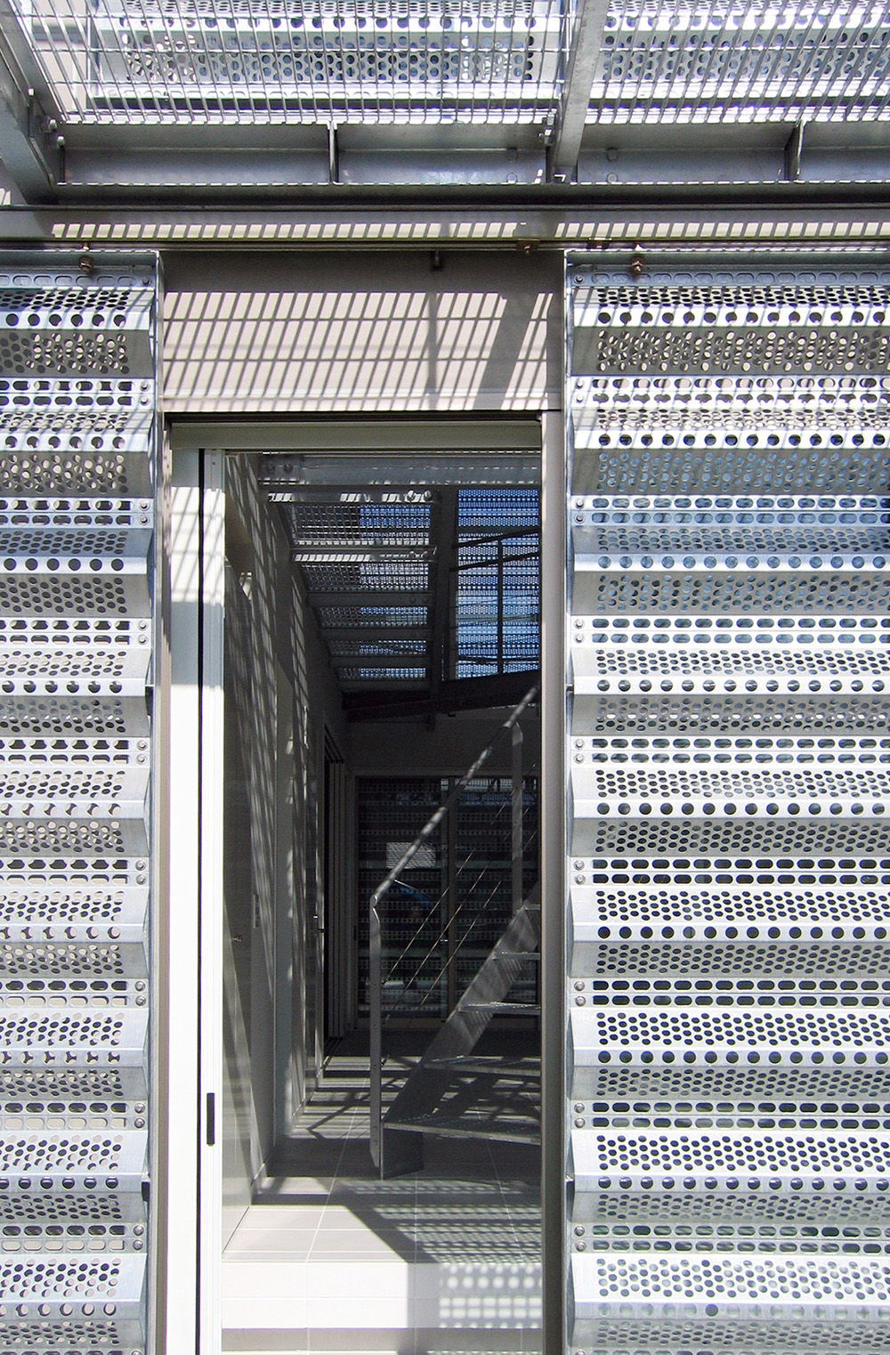 プライバシーやセキュリティを確保しつつ、かつ、空間的に閉鎖的にならないようにという相反する課題について、雨戸をデバイスとして捉え直し、積極的にデザインすることで、問題の解決を試みている。雨戸をフィルターとして機能させるために、面材にはパンチング素材の防雪板を採用している。パンチング素材は閉じていても自然の風を通す。さらに、独特の陰影を生む。そこから生み出される光と影は時間とともに複雑に変化し、室内空間を豊かに彩る。時間も空間に彩りを添える重要な役割と考え計画されている。雨戸を閉じれば、開口部を防御する堅固な覆いとなり、また、全開にすれば外部に対して1Fホールを開放して人を招き入れることもできる。雨戸の開け具合により外部とのつながりの程度を状況に応じて調整できるようになっている。