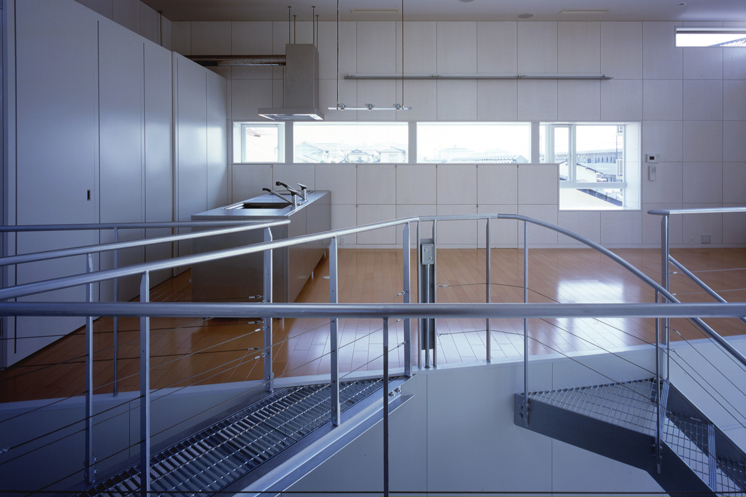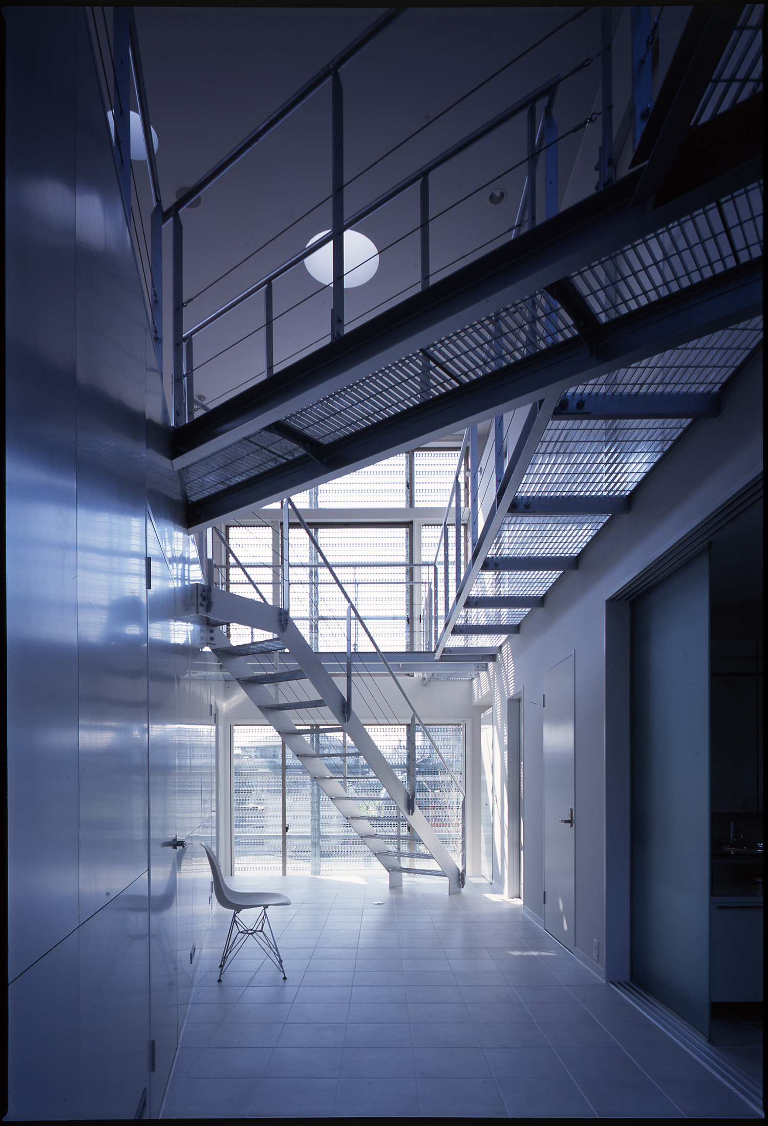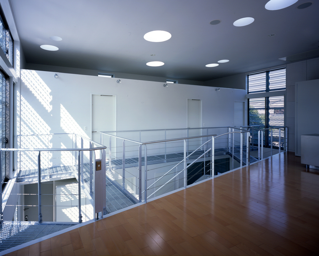 通学路でもある前面道路に面しては土間が設けてあり、1Fホールは土間を介して内部との中間ゾーンとなる。その状態でも生活空間は2階に位置するため、プライバシーは最低限確保されている。子供達にとってホールは外部の延長であり、立体的な空間は格好の遊び場となる。また動線は一見複雑であるが、グレーチングの通路やブリッジは、視線が通ることで軽やかな印象をもち、そこで移動する人自体が空間を構成するひとつの要素となるようデザインされている。 また、オープンでにぎやかな空間とは対照的にベッドルームや子供室、和室といった個室はしっかりとクローズできるように配慮している。日常的に静と動の二つの性格の空間がホールによって連結され、快適な距離感を生み出すよう意図している。