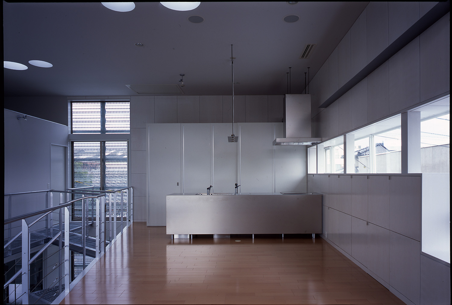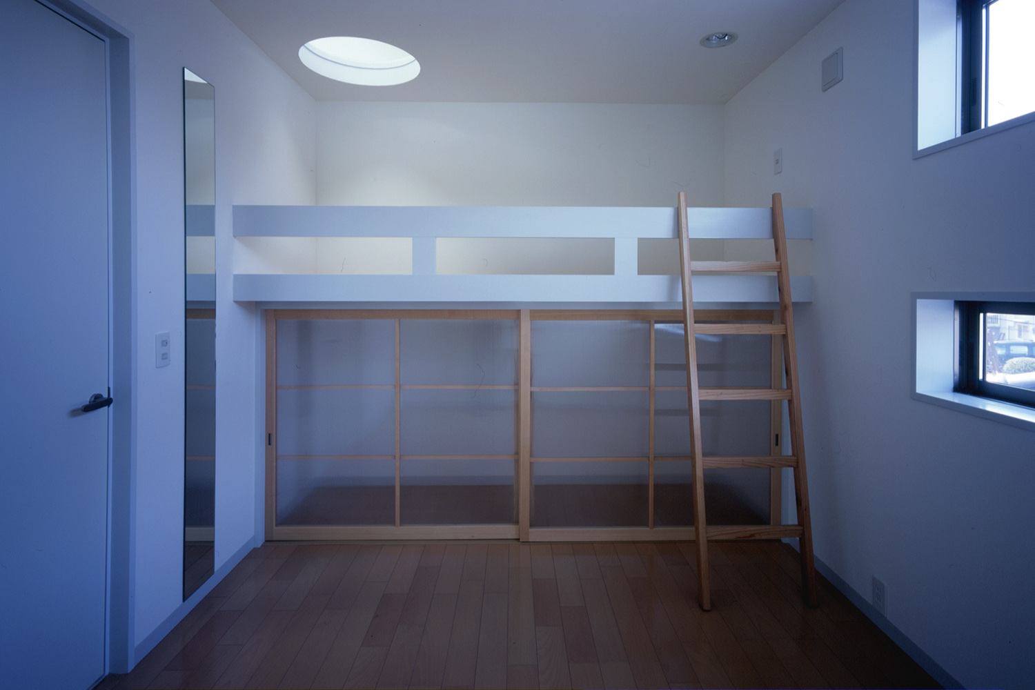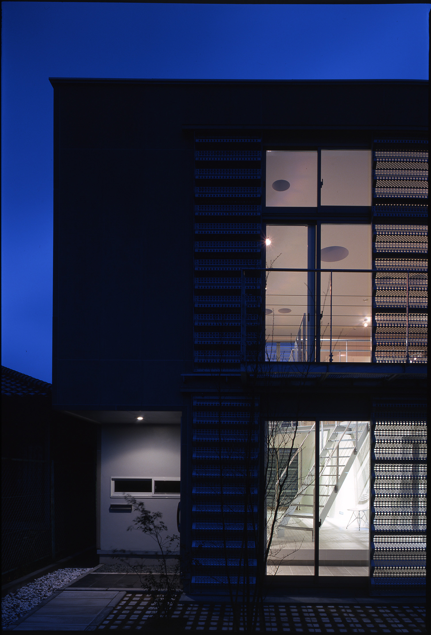 通学路でもある前面道路に面しては土間が設けてあり、1Fホールは土間を介して内部との中間ゾーンとなる。その状態でも生活空間は2階に位置するため、プライバシーは最低限確保されている。子供達にとってホールは外部の延長であり、立体的な空間は格好の遊び場となる。また動線は一見複雑であるが、グレーチングの通路やブリッジは、視線が通ることで軽やかな印象をもち、そこで移動する人自体が空間を構成するひとつの要素となるようデザインされている。 また、オープンでにぎやかな空間とは対照的にベッドルームや子供室、和室といった個室はしっかりとクローズできるように配慮している。日常的に静と動の二つの性格の空間がホールによって連結され、快適な距離感を生み出すよう意図している。