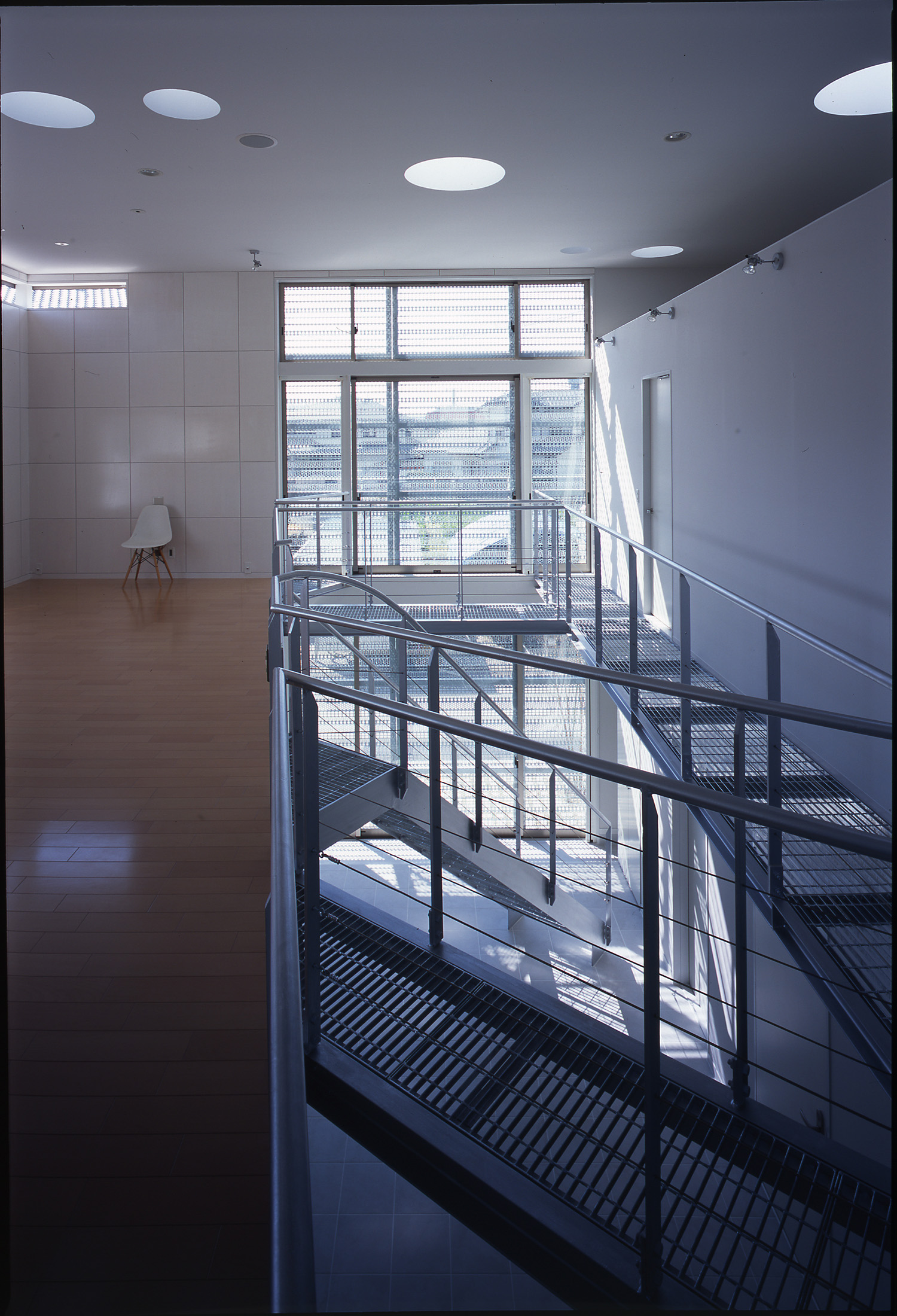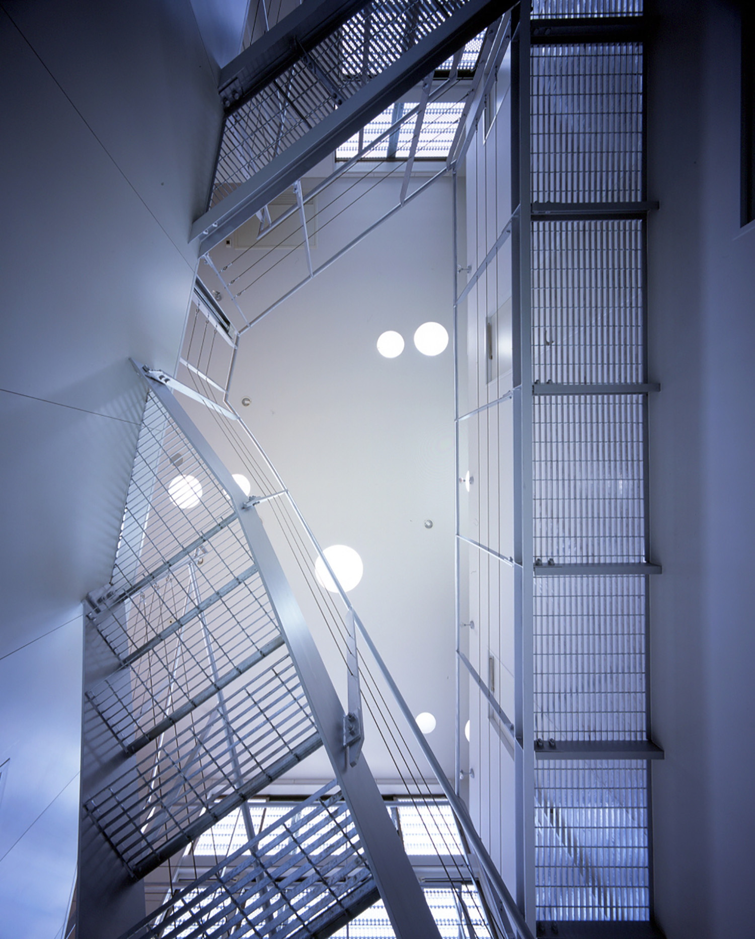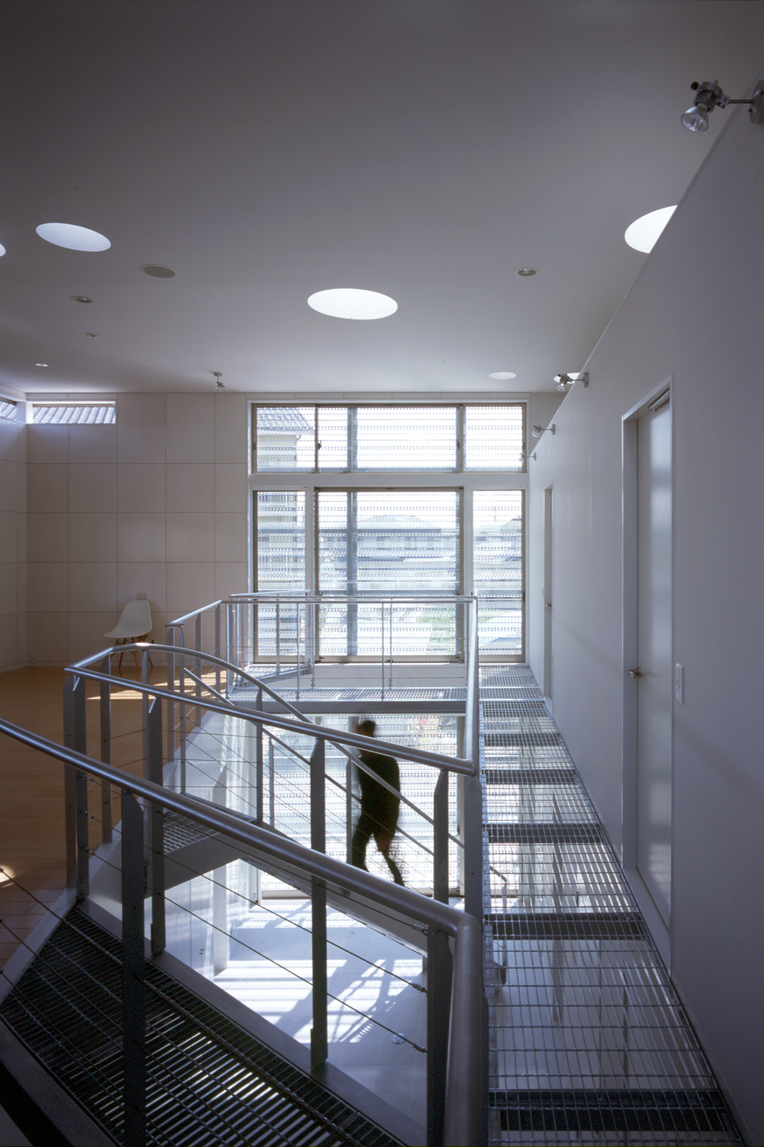 天井を見上げる。グレーチング床越しに丸いトップライトから光が降り注ぐ。