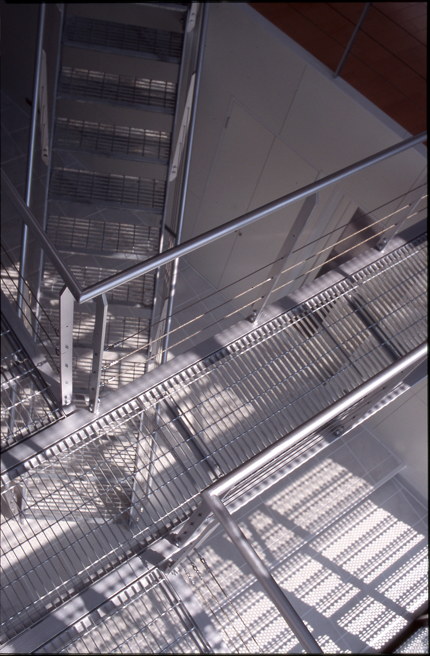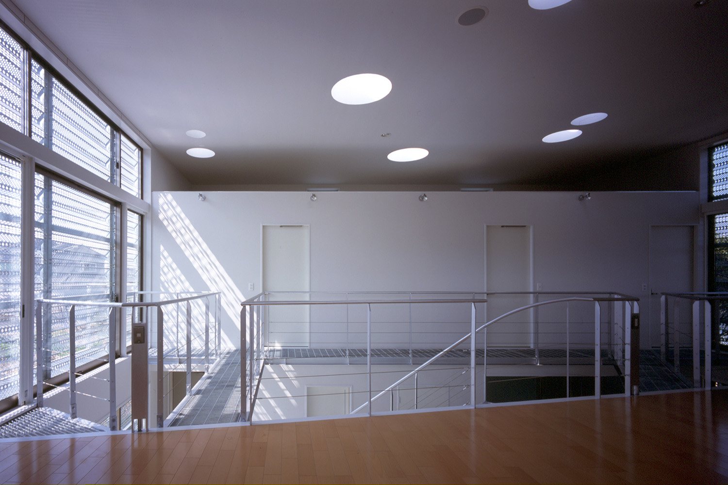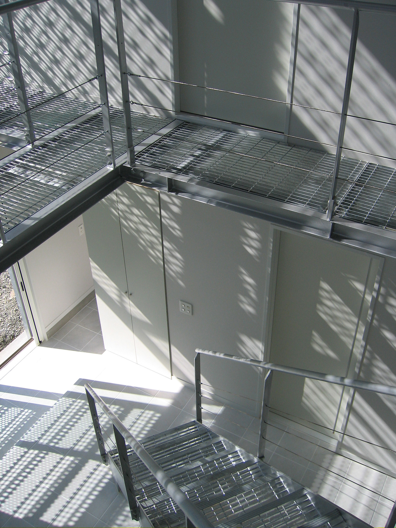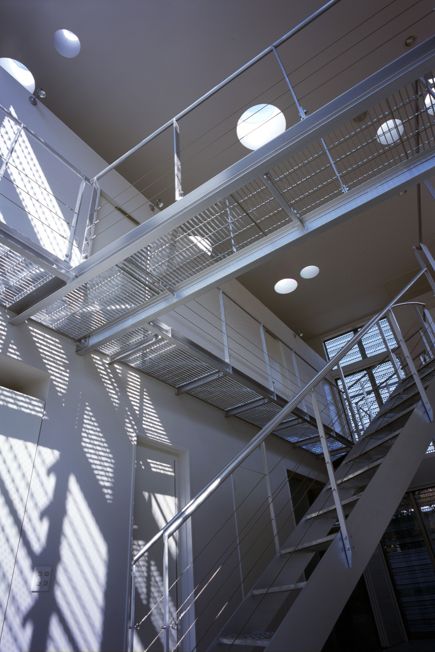天井を見上げる。グレーチング床越しに丸いトップライトから光が降り注ぐ。