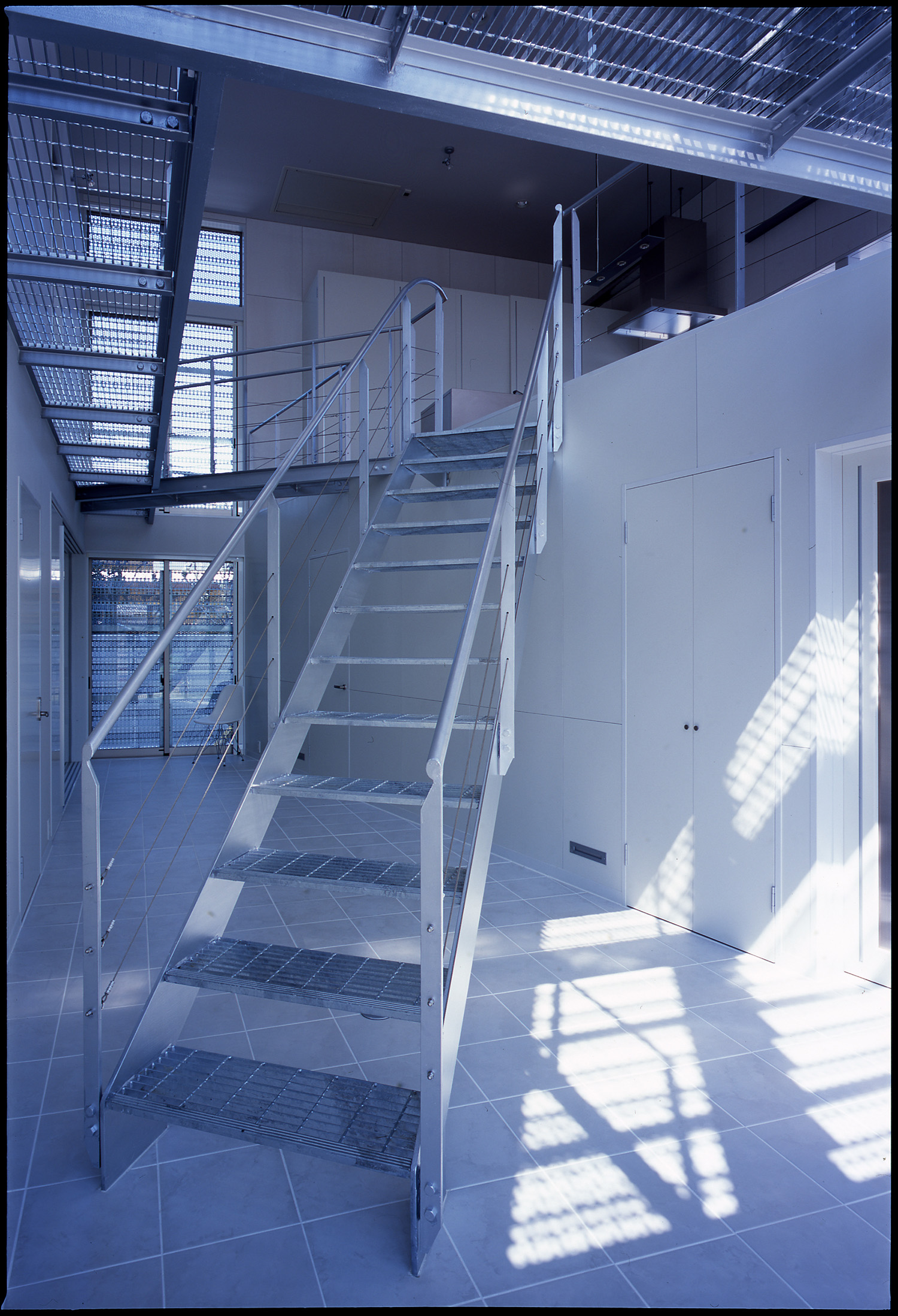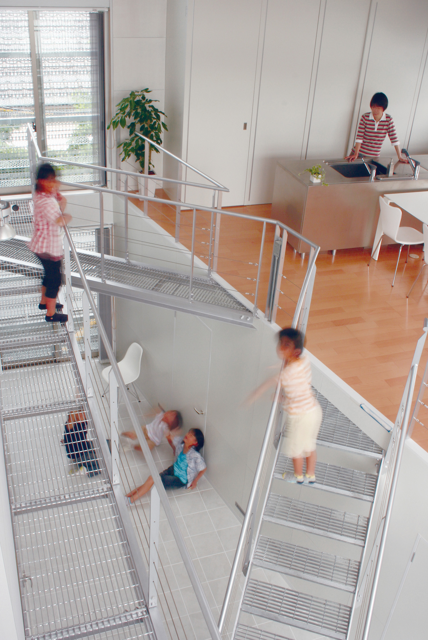 吹き抜けにはグレーチングの通路やブリッジがかかる。子供達にとって立体的な空間は格好の遊び場となる。
