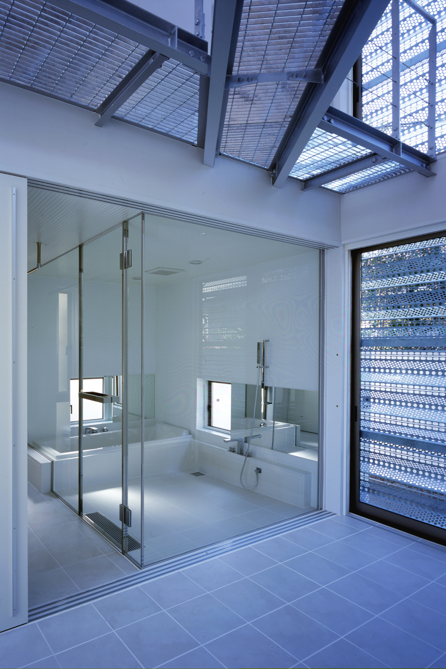 ガラスで囲われ現代的なスケルトンの浴室。もちろん引き戸で閉じることができる。