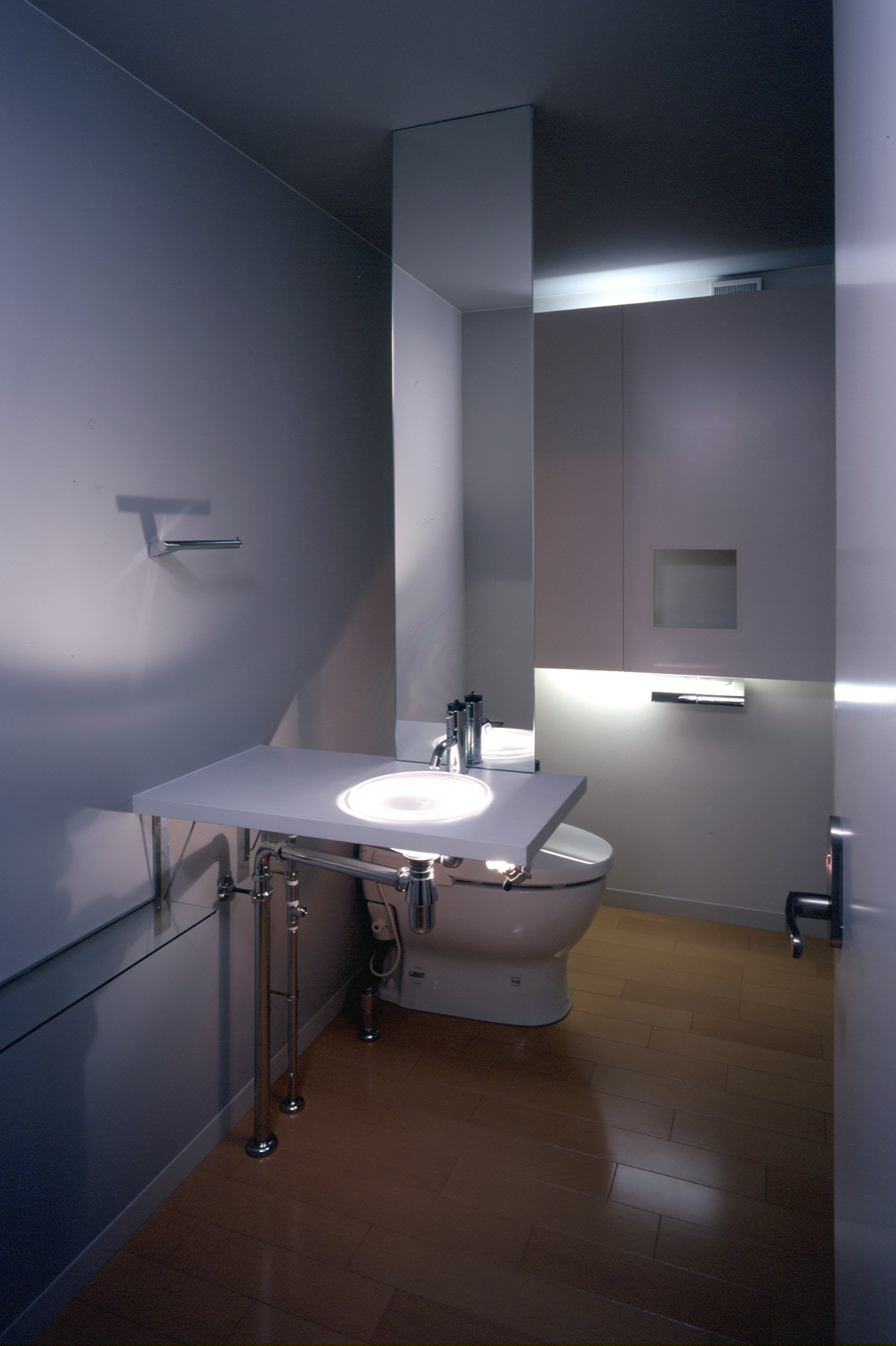 照明で演出されたトイレ。オープンでにぎやかな空間とは対照的に個室空間はしっかりとクローズできるよう設計。それぞれがホールによって連結され、快適な空間を生み出す。