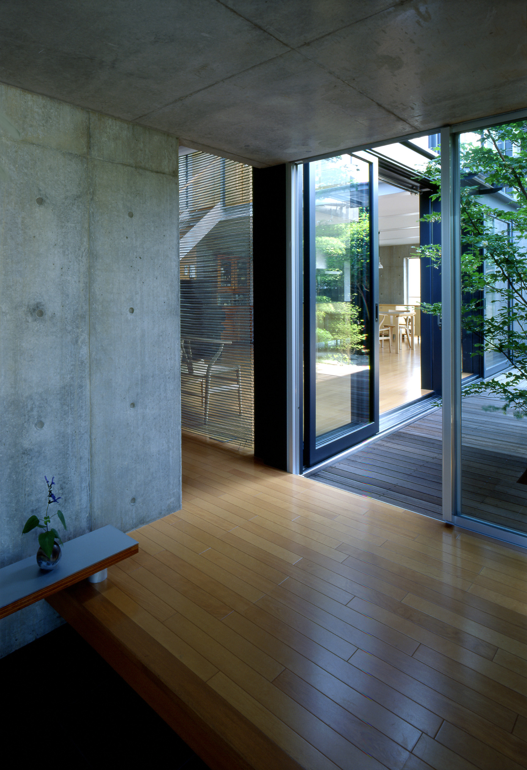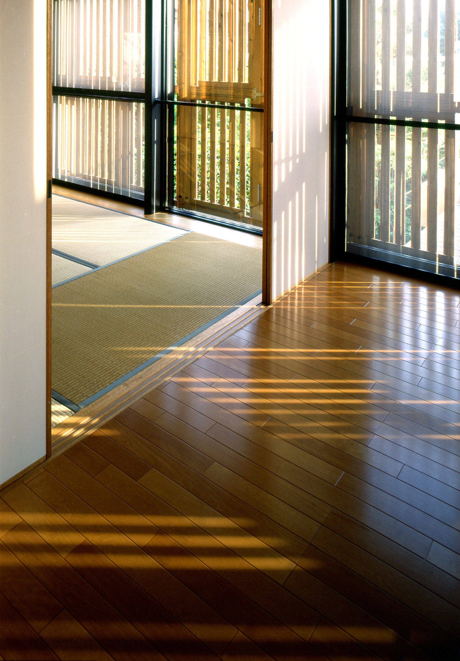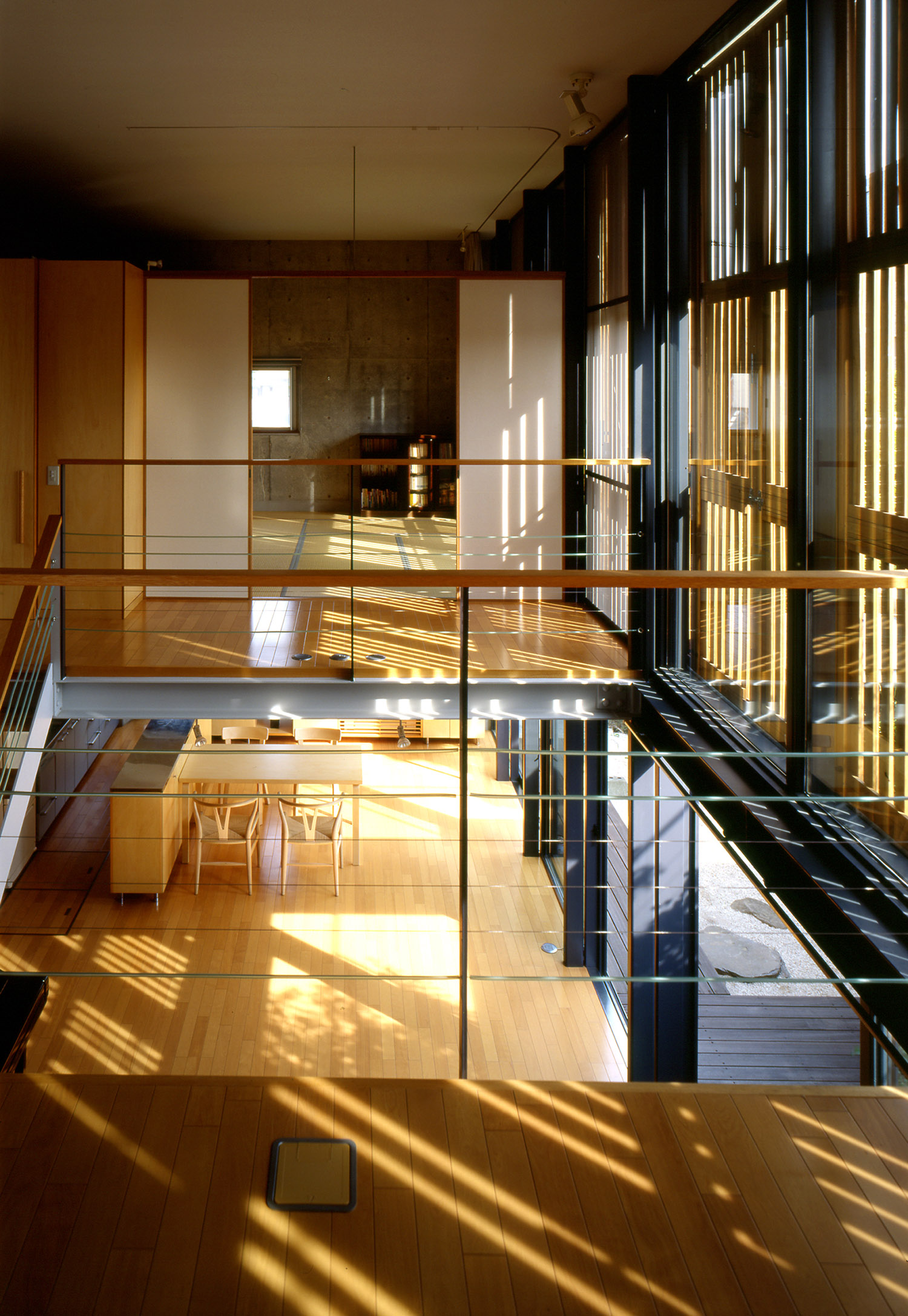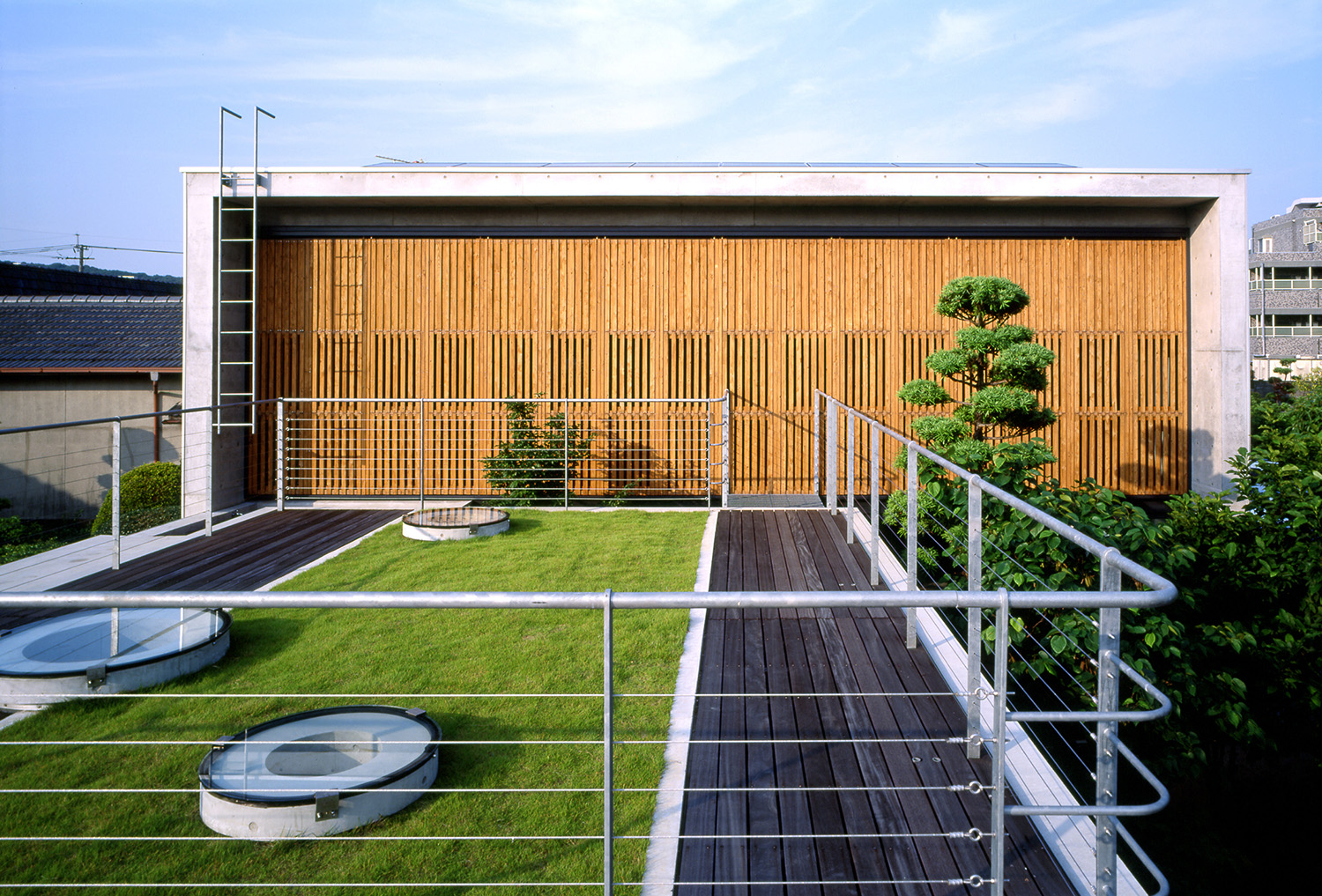 しかしまた、西風はとても心地よくもあるのである。西日対策として開口は折り畳み式の雨戸で全面を覆われた。この雨戸には無双窓をもうけている。その面は完全な遮蔽ではなく、調整可能な隙間から複雑な光が室内に影をおとし、人工的な木漏れ日を演出した。雨戸は開口を保護する機能と同時に、日ざしをやわらげ、かつ、西風は取り込むフィルターとなるよう意図している。空調機器に頼らない快適な空間の構築をこころがけ、常に風の入り口と抜け口を意識して各部を計画しているが、風の流れをコントロールする上で、玄関と居間との間の間仕切りも重要な通り道となっていた。そのため、視線を適度に遮り、空気の流れは妨げないステンレスメッシュという素材を採用している。また、太陽光発電システムや屋上緑化システムを導入、環境に配慮すると同時に仕上げでは木を多用し、そこで生活する人に柔らかなイメージを与えるよう配慮した。