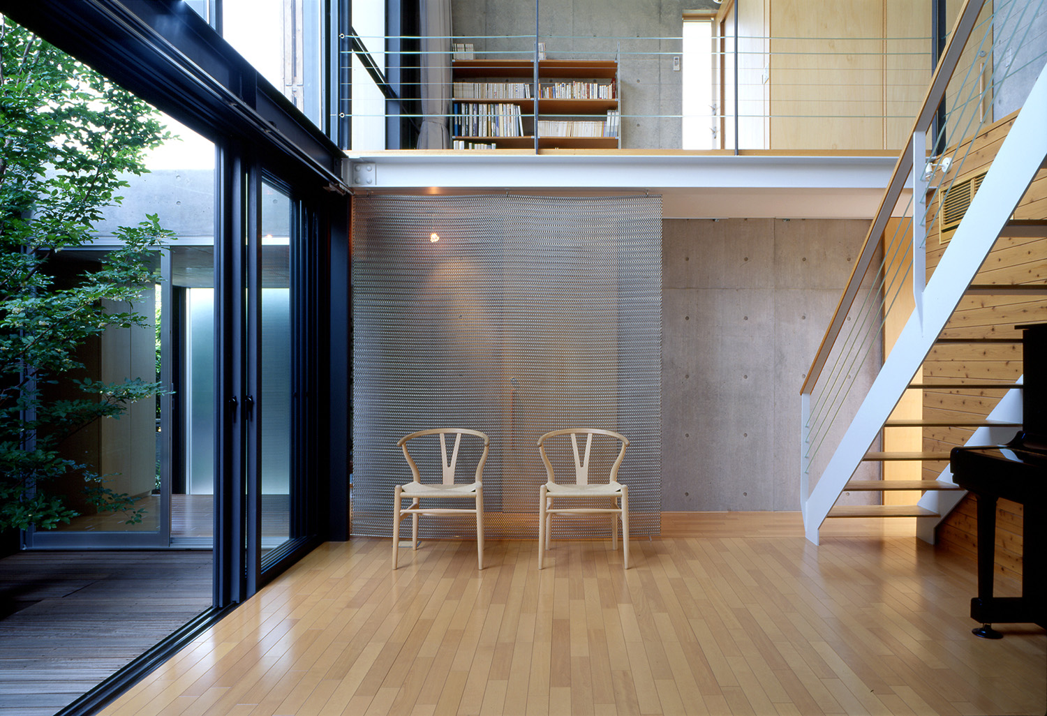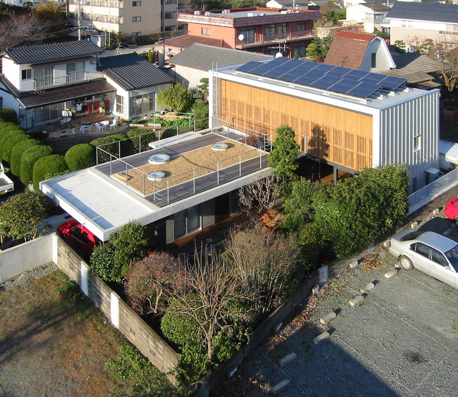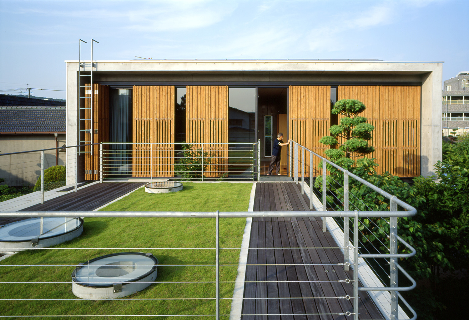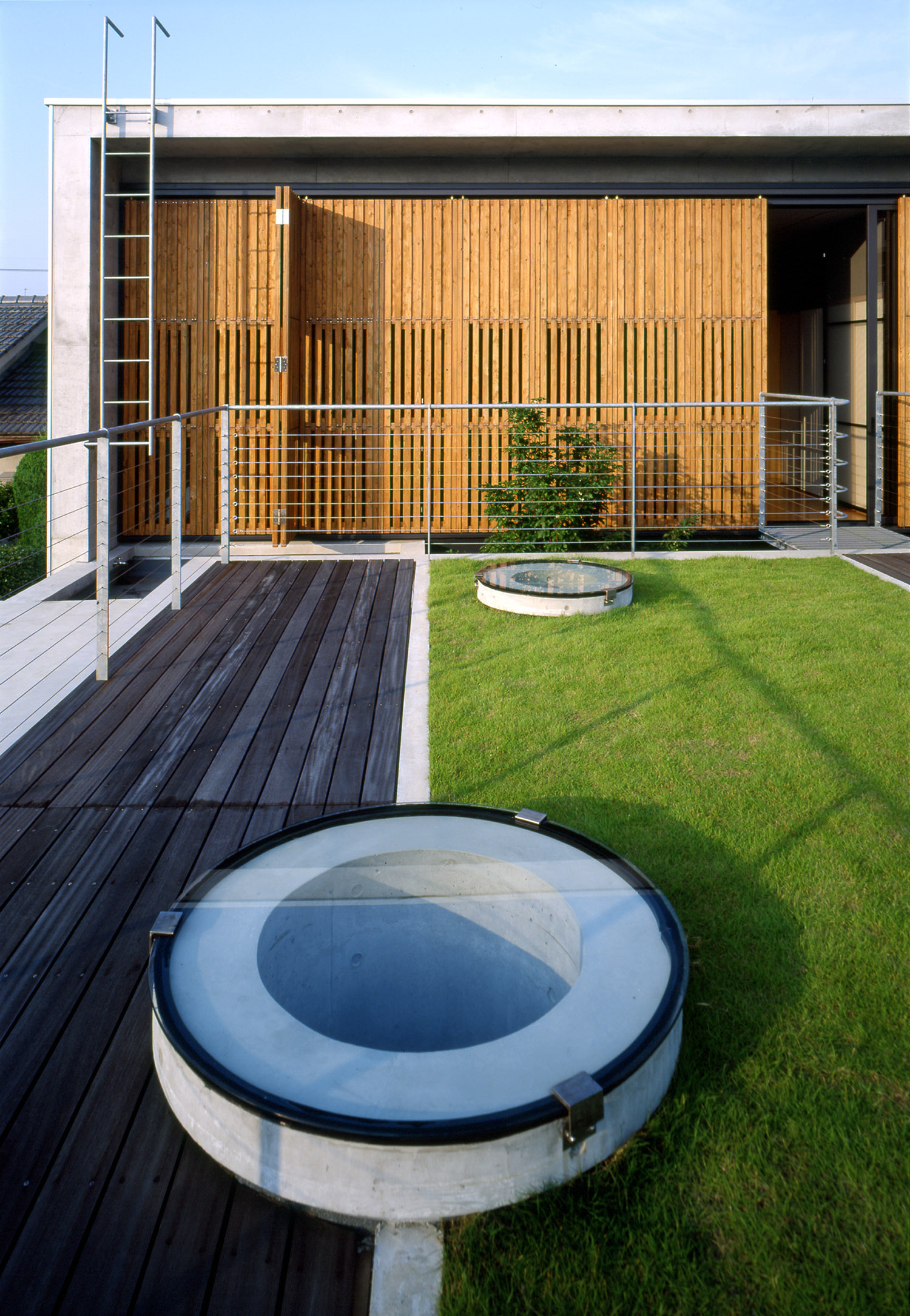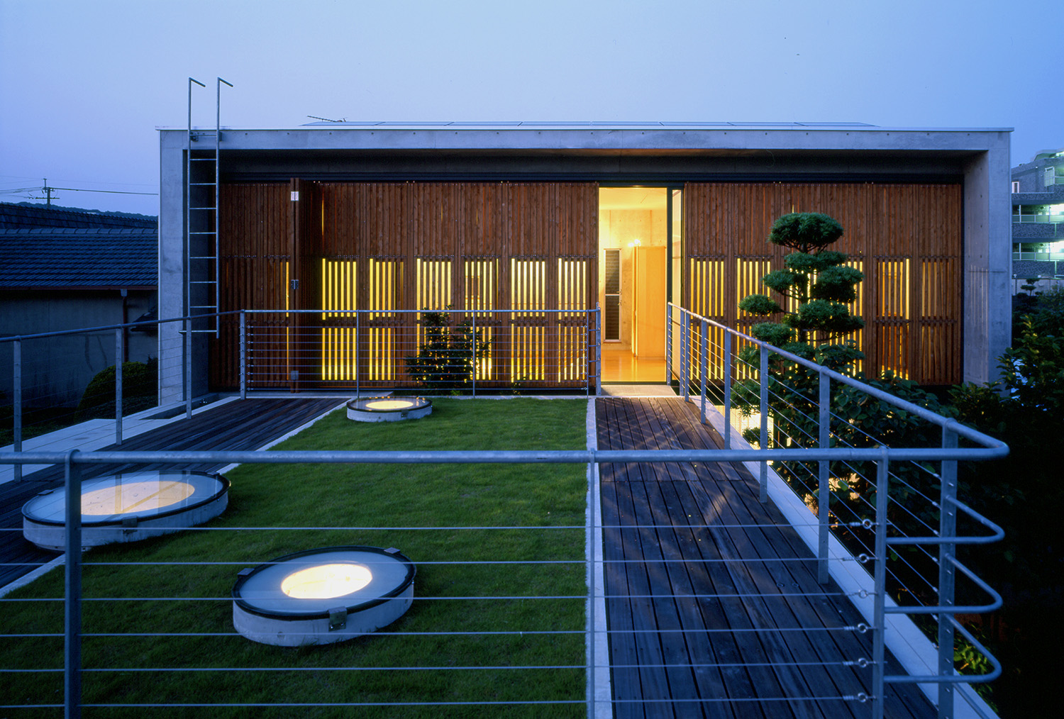 しかしまた、西風はとても心地よくもあるのである。西日対策として開口は折り畳み式の雨戸で全面を覆われた。この雨戸には無双窓をもうけている。その面は完全な遮蔽ではなく、調整可能な隙間から複雑な光が室内に影をおとし、人工的な木漏れ日を演出した。雨戸は開口を保護する機能と同時に、日ざしをやわらげ、かつ、西風は取り込むフィルターとなるよう意図している。空調機器に頼らない快適な空間の構築をこころがけ、常に風の入り口と抜け口を意識して各部を計画しているが、風の流れをコントロールする上で、玄関と居間との間の間仕切りも重要な通り道となっていた。そのため、視線を適度に遮り、空気の流れは妨げないステンレスメッシュという素材を採用している。また、太陽光発電システムや屋上緑化システムを導入、環境に配慮すると同時に仕上げでは木を多用し、そこで生活する人に柔らかなイメージを与えるよう配慮した。