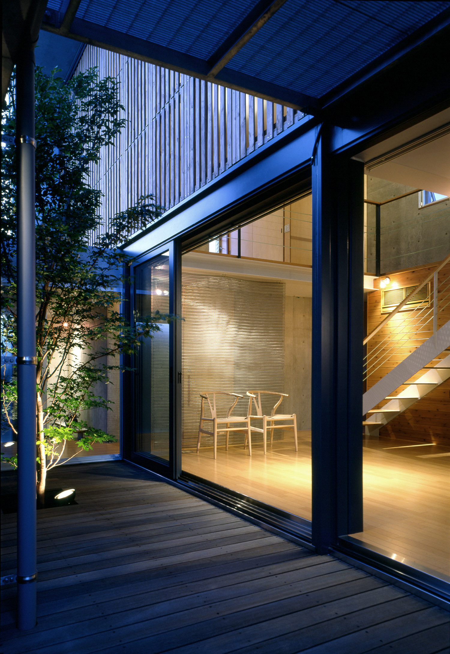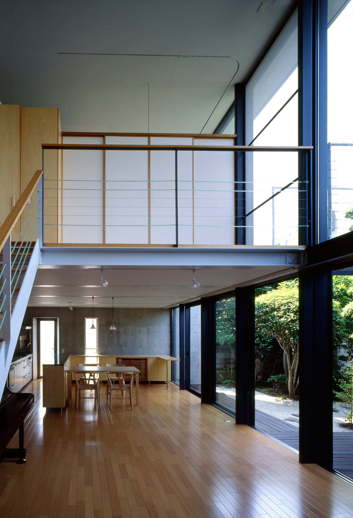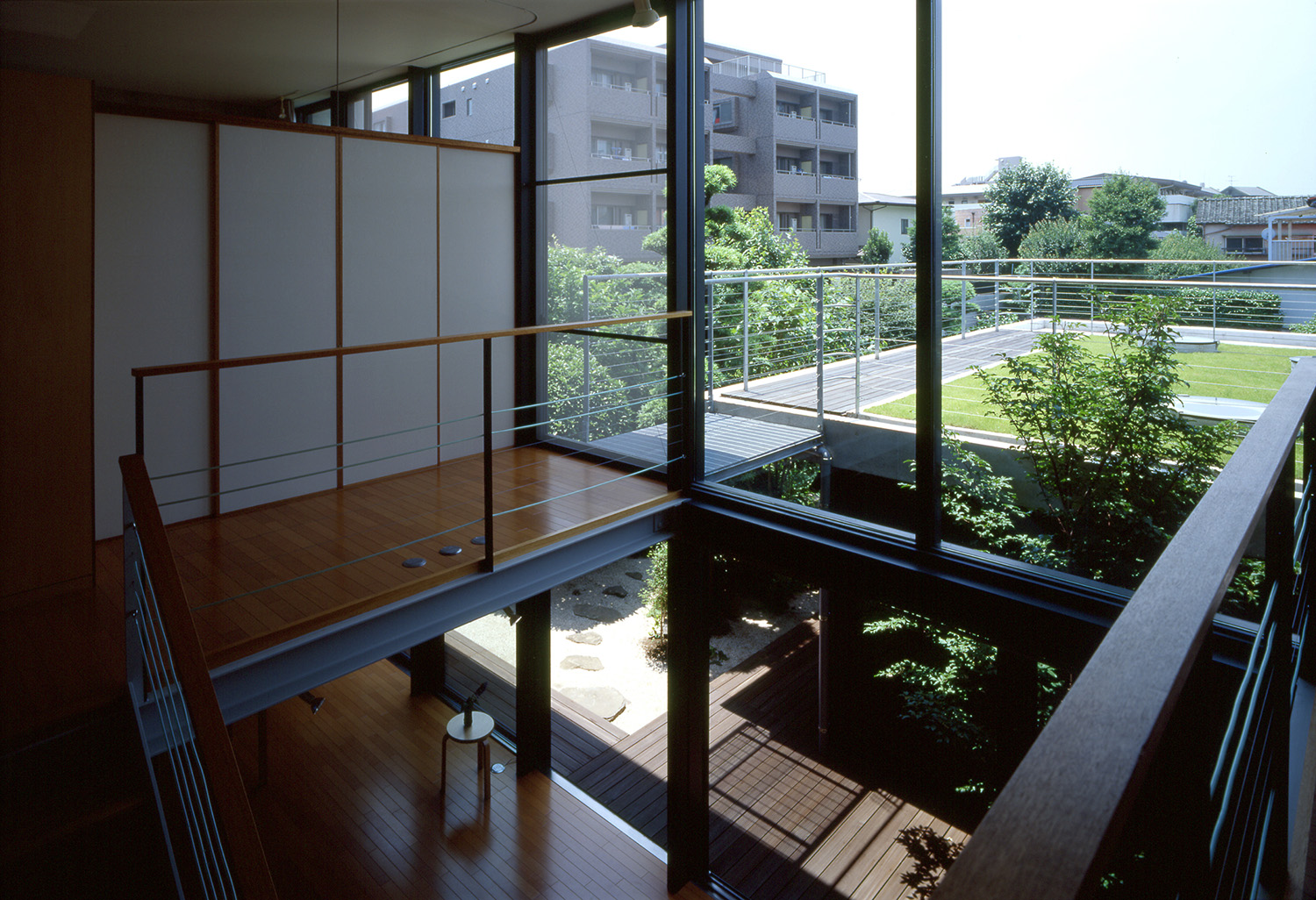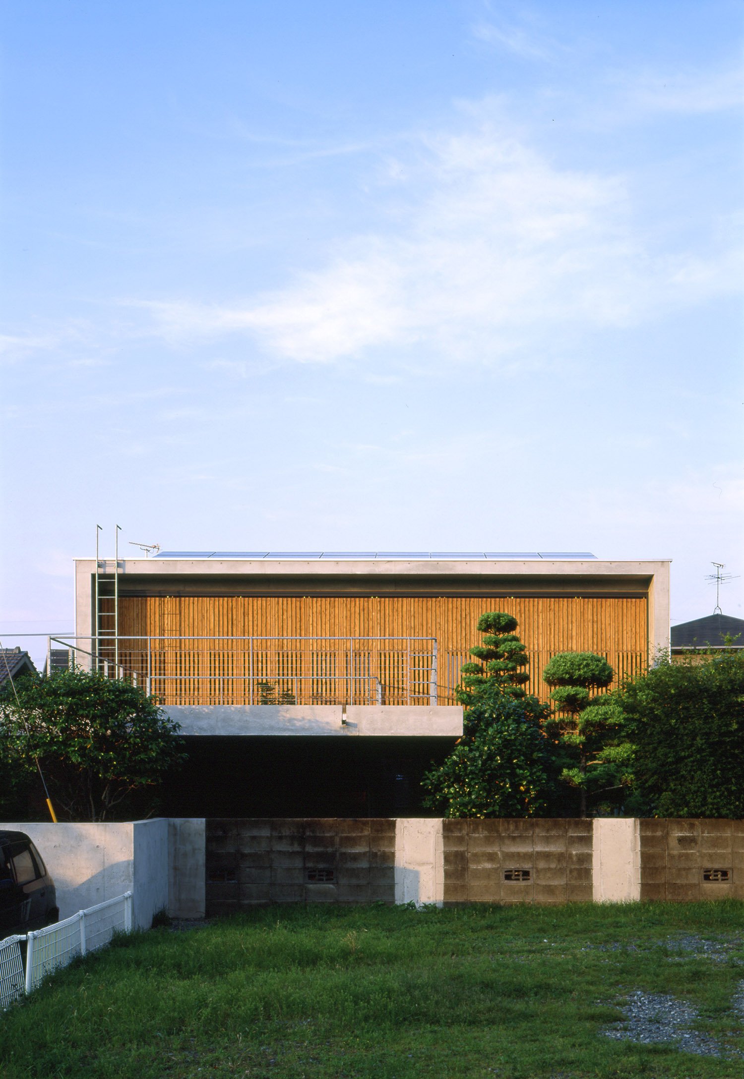 しかしまた、西風はとても心地よくもあるのである。西日対策として開口は折り畳み式の雨戸で全面を覆われた。この雨戸には無双窓をもうけている。その面は完全な遮蔽ではなく、調整可能な隙間から複雑な光が室内に影をおとし、人工的な木漏れ日を演出した。雨戸は開口を保護する機能と同時に、日ざしをやわらげ、かつ、西風は取り込むフィルターとなるよう意図している。空調機器に頼らない快適な空間の構築をこころがけ、常に風の入り口と抜け口を意識して各部を計画しているが、風の流れをコントロールする上で、玄関と居間との間の間仕切りも重要な通り道となっていた。そのため、視線を適度に遮り、空気の流れは妨げないステンレスメッシュという素材を採用している。また、太陽光発電システムや屋上緑化システムを導入、環境に配慮すると同時に仕上げでは木を多用し、そこで生活する人に柔らかなイメージを与えるよう配慮した。