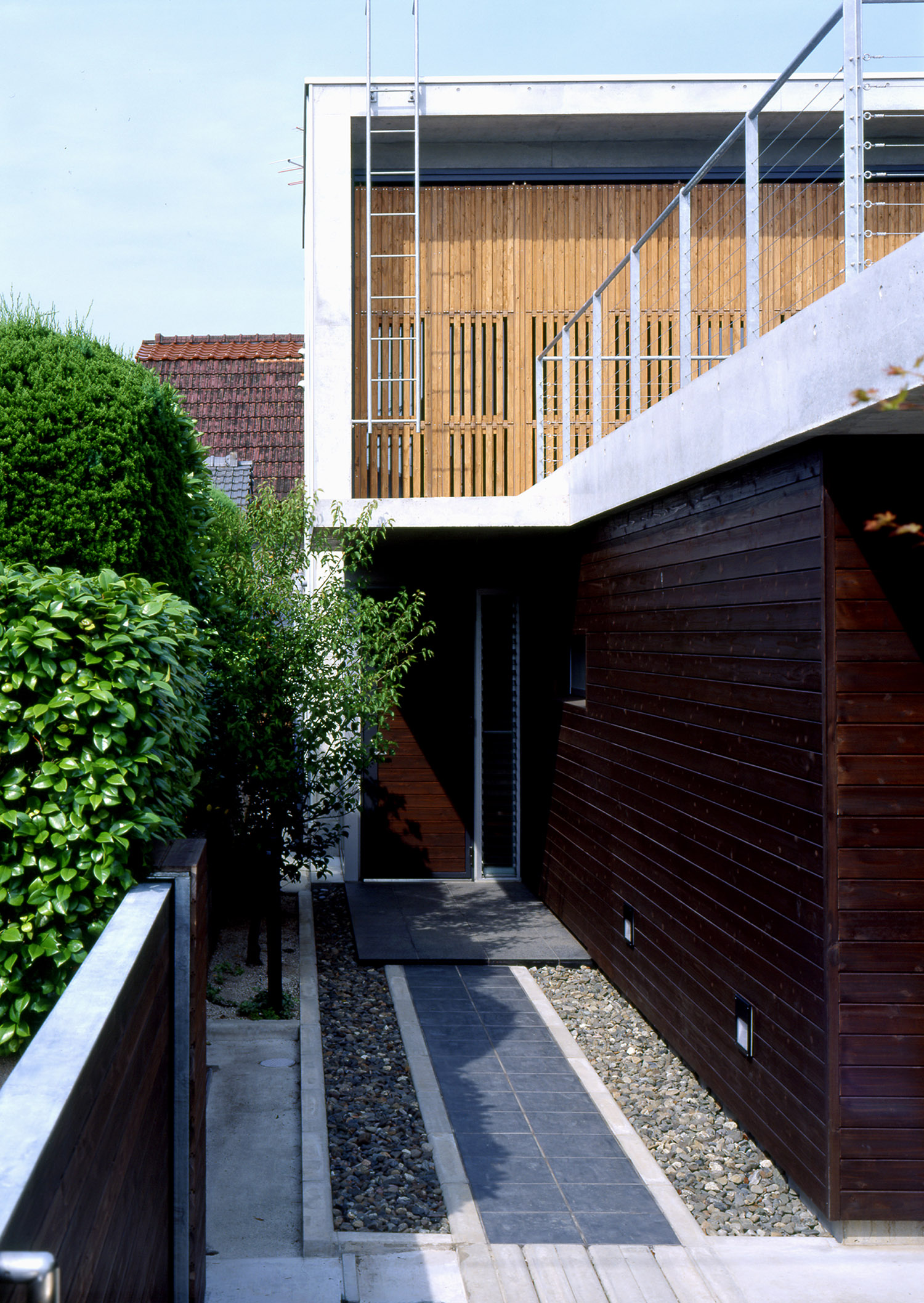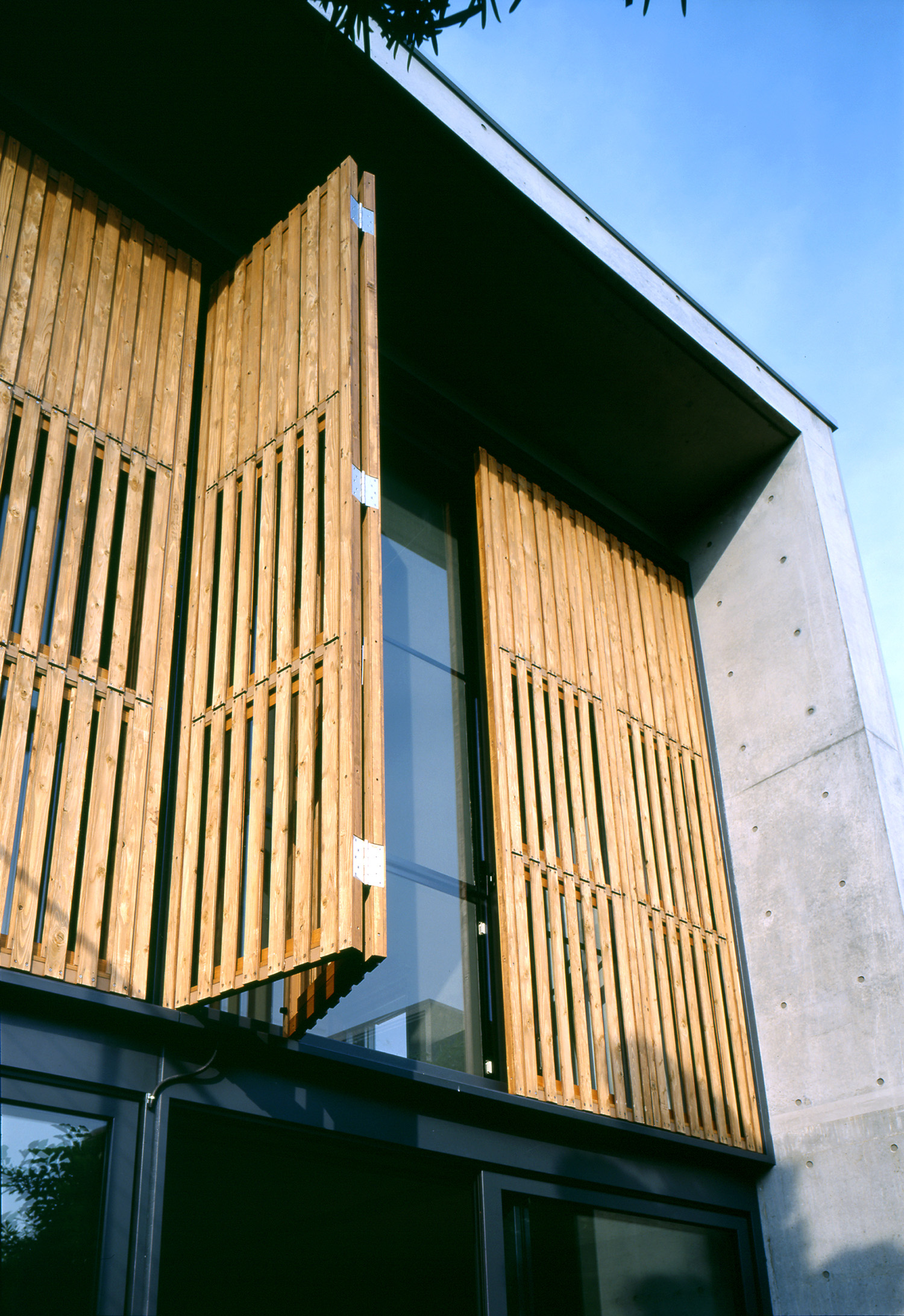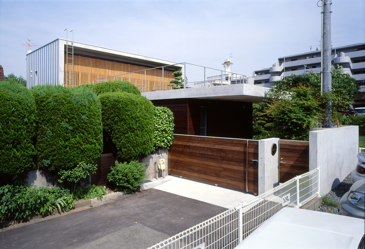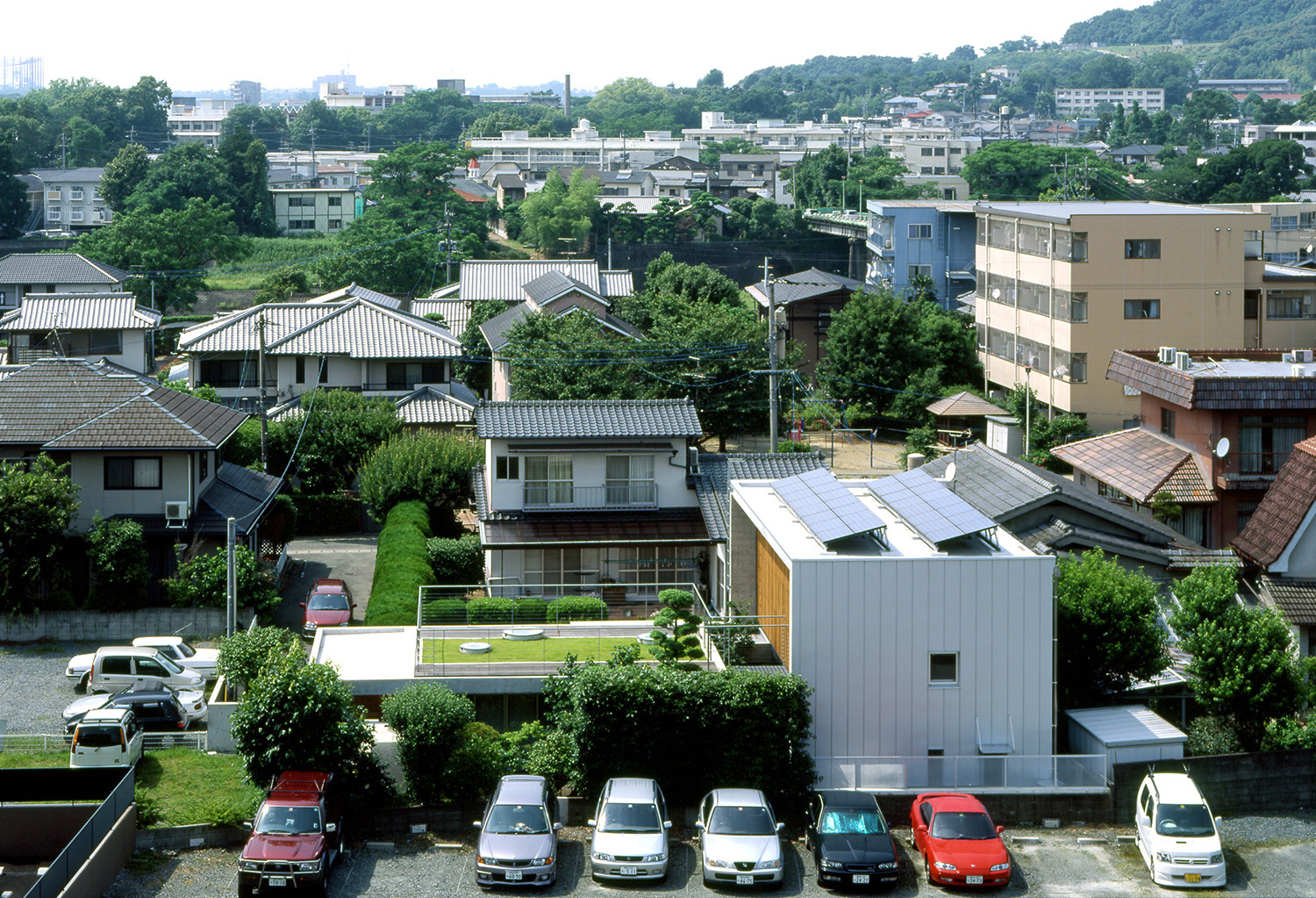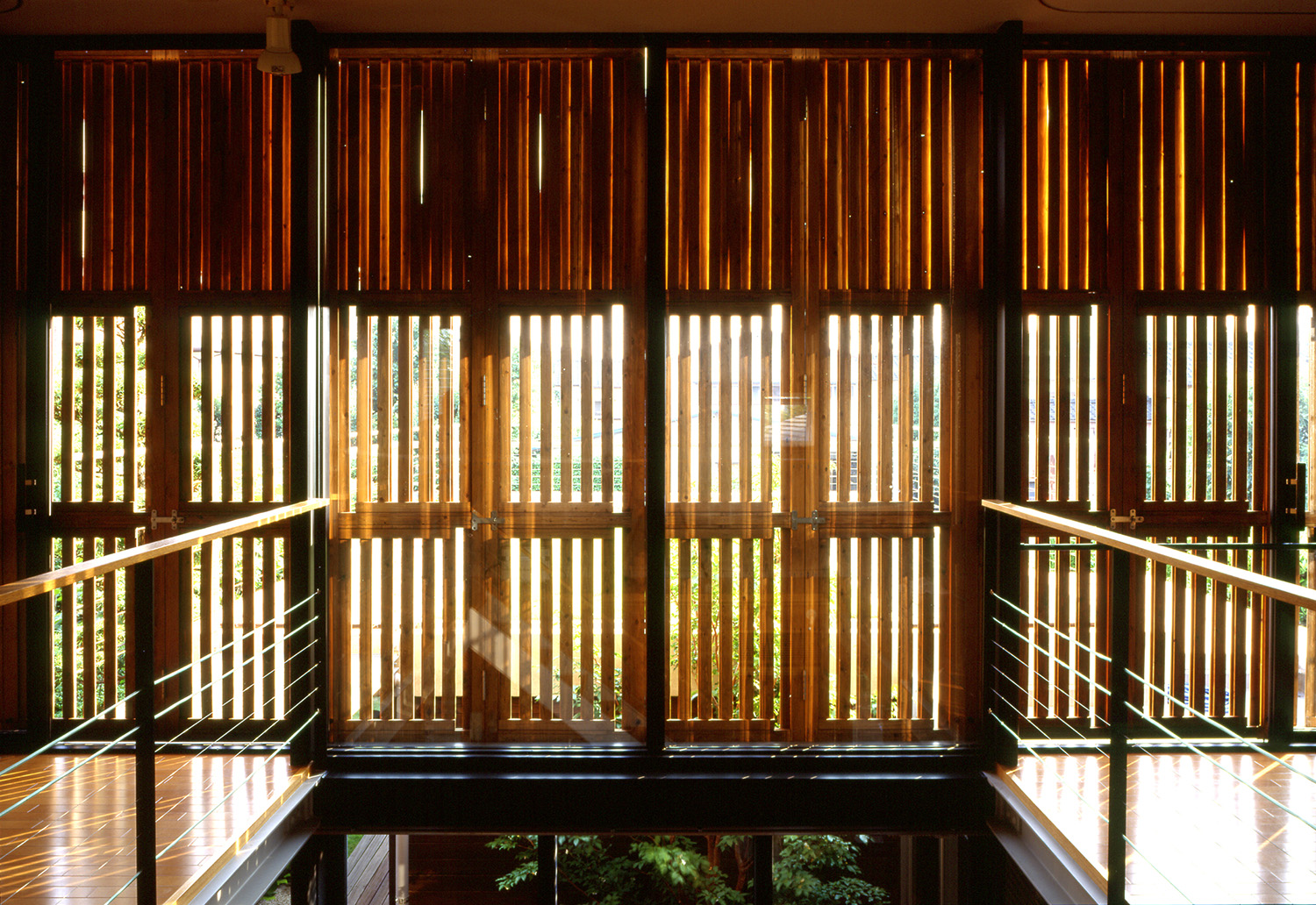しかしまた、西風はとても心地よくもあるのである。西日対策として開口は折り畳み式の雨戸で全面を覆われた。この雨戸には無双窓をもうけている。その面は完全な遮蔽ではなく、調整可能な隙間から複雑な光が室内に影をおとし、人工的な木漏れ日を演出した。雨戸は開口を保護する機能と同時に、日ざしをやわらげ、かつ、西風は取り込むフィルターとなるよう意図している。空調機器に頼らない快適な空間の構築をこころがけ、常に風の入り口と抜け口を意識して各部を計画しているが、風の流れをコントロールする上で、玄関と居間との間の間仕切りも重要な通り道となっていた。そのため、視線を適度に遮り、空気の流れは妨げないステンレスメッシュという素材を採用している。また、太陽光発電システムや屋上緑化システムを導入、環境に配慮すると同時に仕上げでは木を多用し、そこで生活する人に柔らかなイメージを与えるよう配慮した。