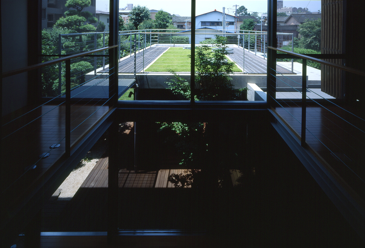この建物の特徴のひとつとなっている開放的な二層部分の構造は、30cm厚のコンクリート壁と鉄骨で組まれた二階床という混構造で成立しており、構造家の新穂氏による。その一面は二層分のガラス面で覆われる。一方、中庭を挟んで位置する平屋部分は、極力高さを抑えられている。芝生の屋上テラスとそれに続く二階床レベルが同一となるよう計画し、より効果的な空間の広がりを意図している。