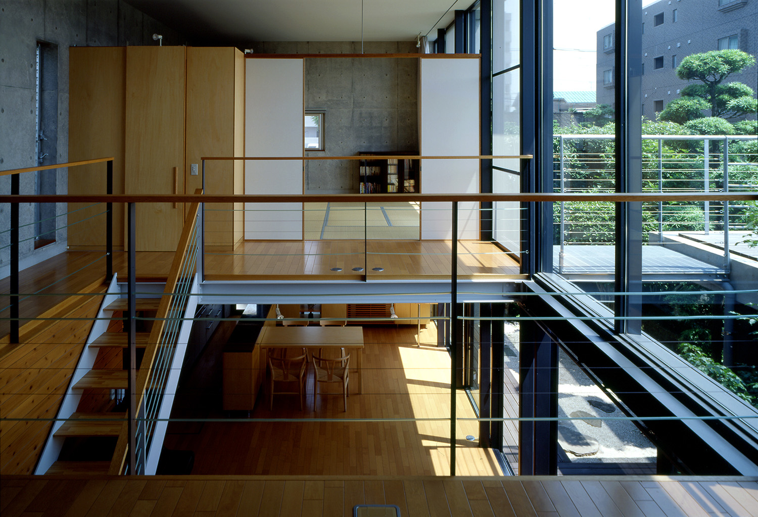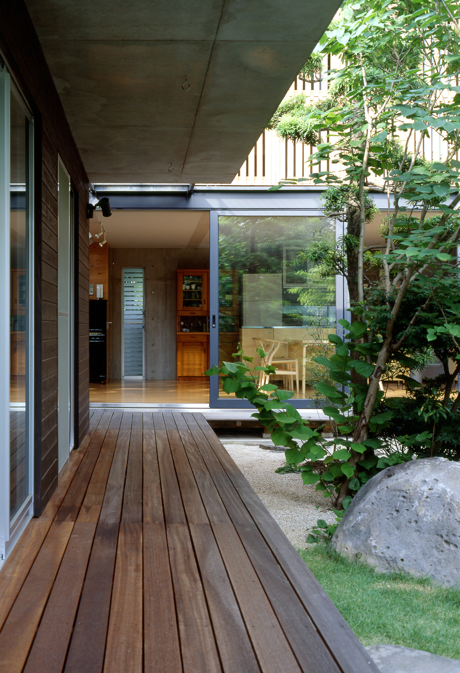 平屋で比較的囲われ、天井高さを抑えた「静」のゾーンと、二層吹き抜けて、大きなガラス面をもつ開放的な「動」のゾーンである。お互いに補いあう二つのゾーンは縁側を介して連結され、プランの中心にはシンボルツリーとしてヒメシャラが植えられた中庭が配置される。2つのゾーンは人の気配が感じられる程度の距離を確保。この距離は、各世代の緩衝帯となるよう計画している。その上で、縁側と中庭は既存庭、屋上テラス、そして空といった外部空間をそれぞれの室内空間へと導き、その境界を曖昧にする。