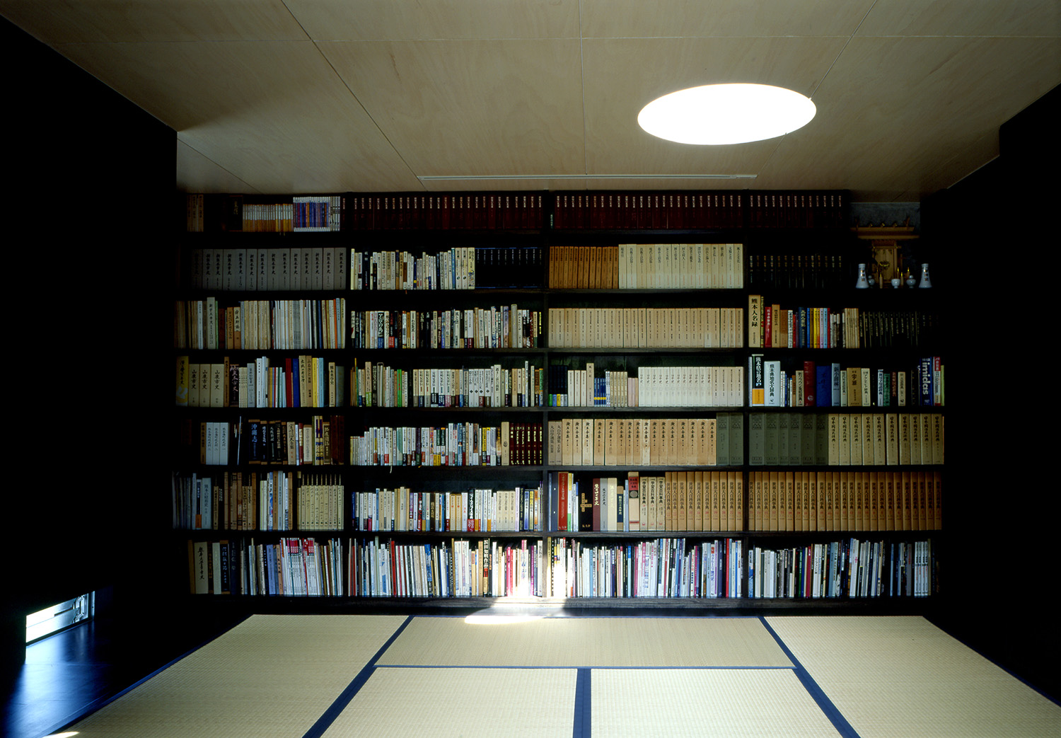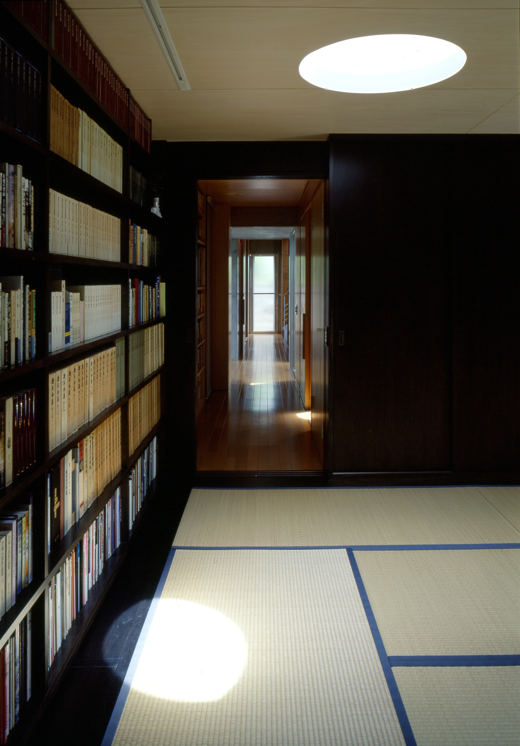 和室。コンクリート打放しや丸いトップライトといった現代的な要素もとり入れている。