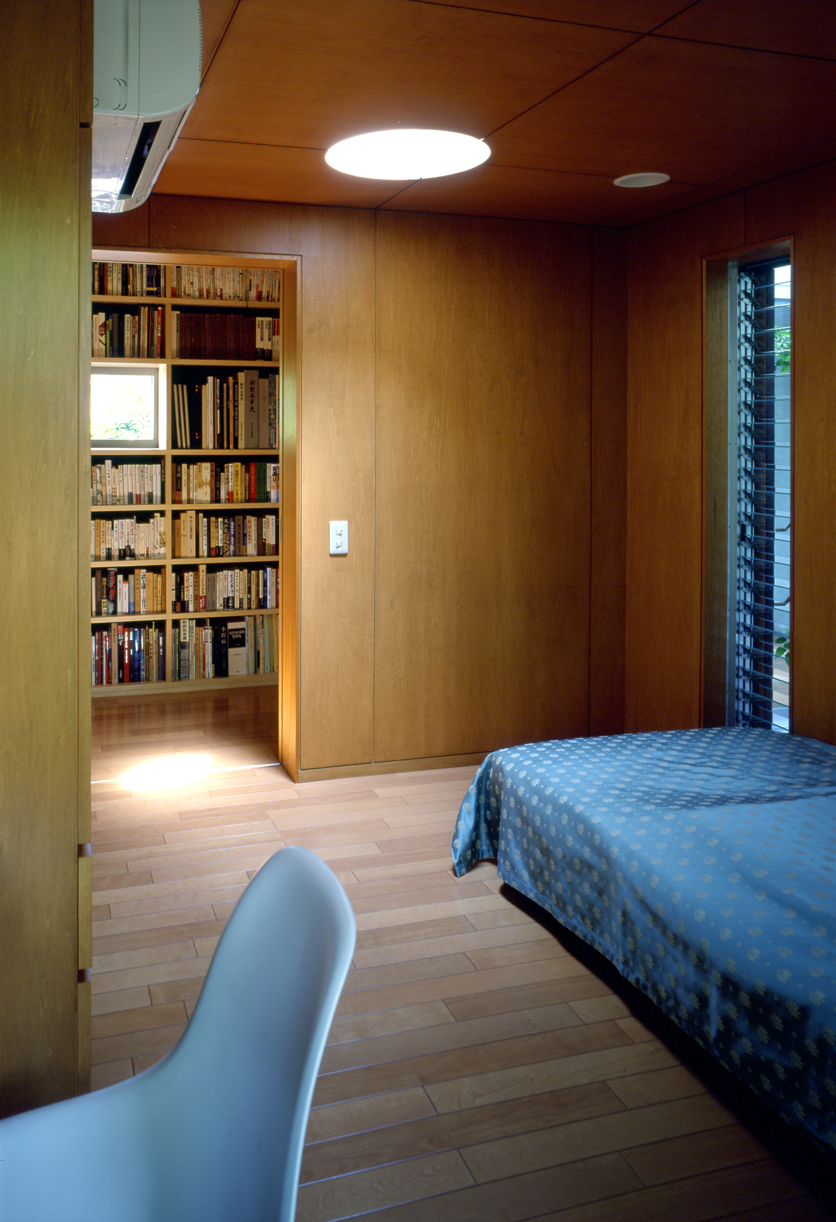 雨戸のスリットは完全な遮蔽ではなく、人工的な木漏れ日を演出。調整可能な隙間から差し込む光が室内に複雑な影をおとす。