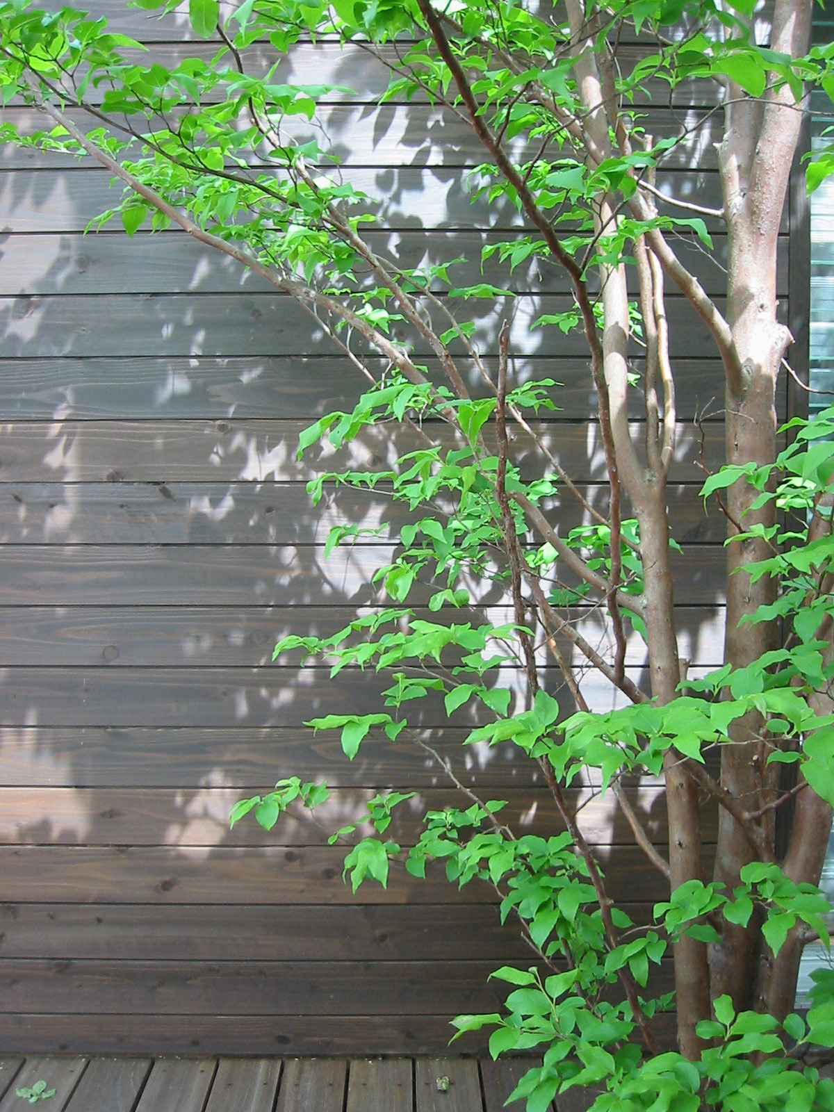 新緑の季節には、木で仕上げられた壁面にヒメシャラの青葉が影を落とす。
