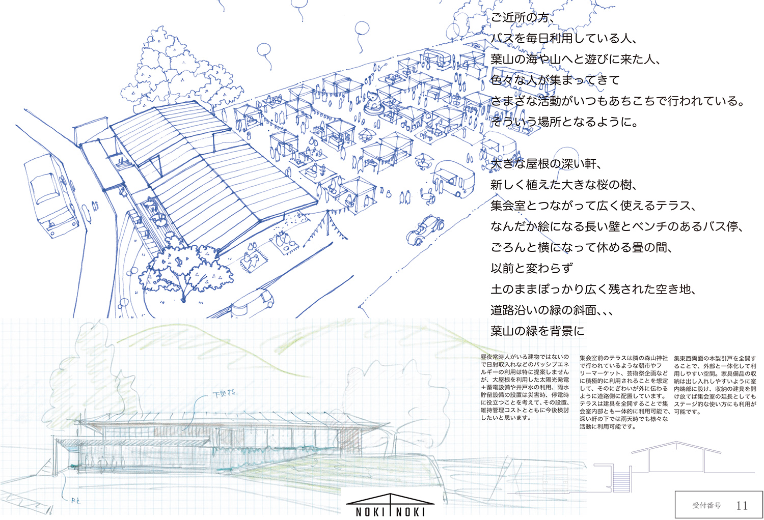 御近所の方、バスを毎日利用している人、葉山の海や山へと遊びに来た人、色々な人が集まってきてさまざな活動がいつもあちこちで行われている場所となるように。 大きな屋根の深い軒、新しく植えた大きな桜の樹、集会室とつながって広く使えるテラス、なんだか絵になる長い壁とベンチのあるバス停、ごろんと横になって休める畳の間、以前と変わらず土のままぽっかり広く残された空き地、道路沿いの緑の斜面、、葉山の緑を背景に風の通り抜ける気持ちの良い場所を設けました。