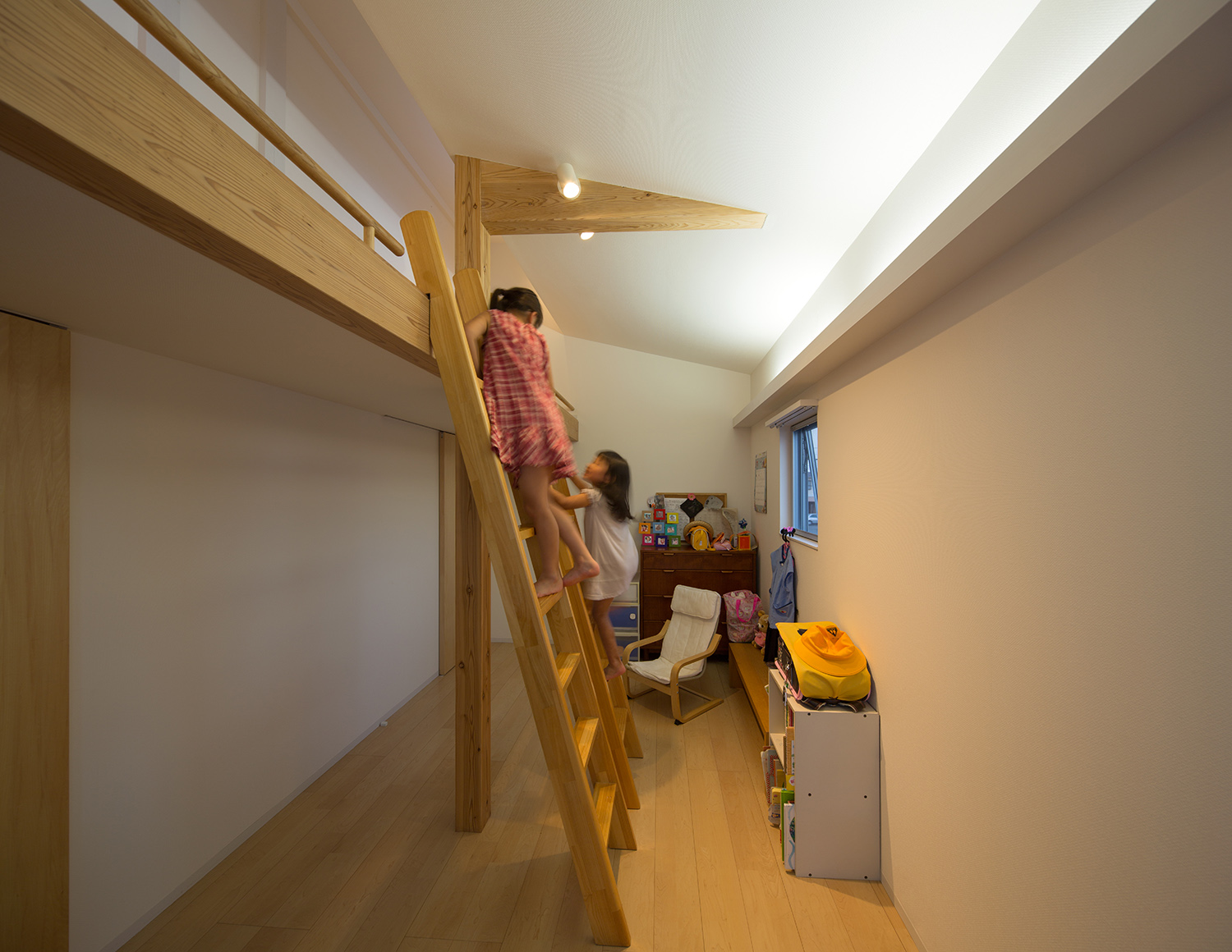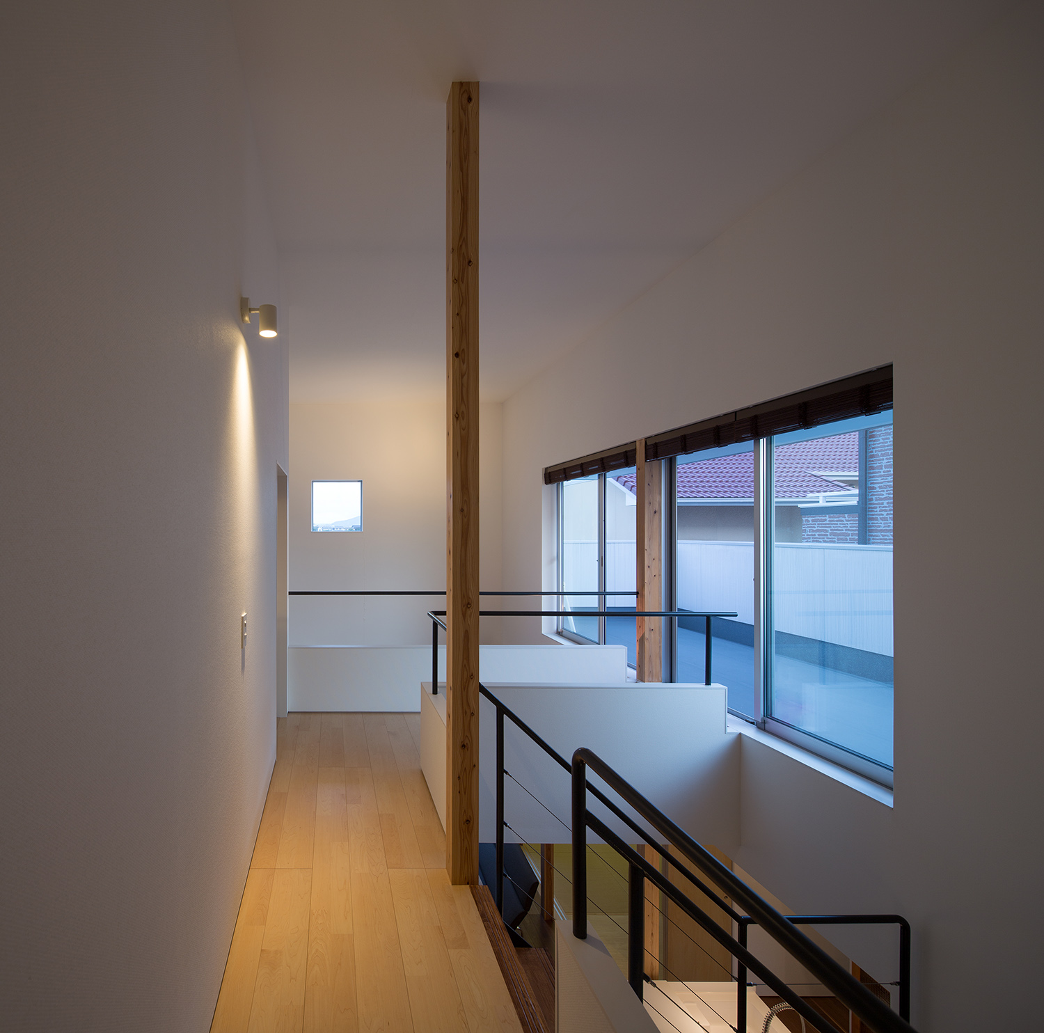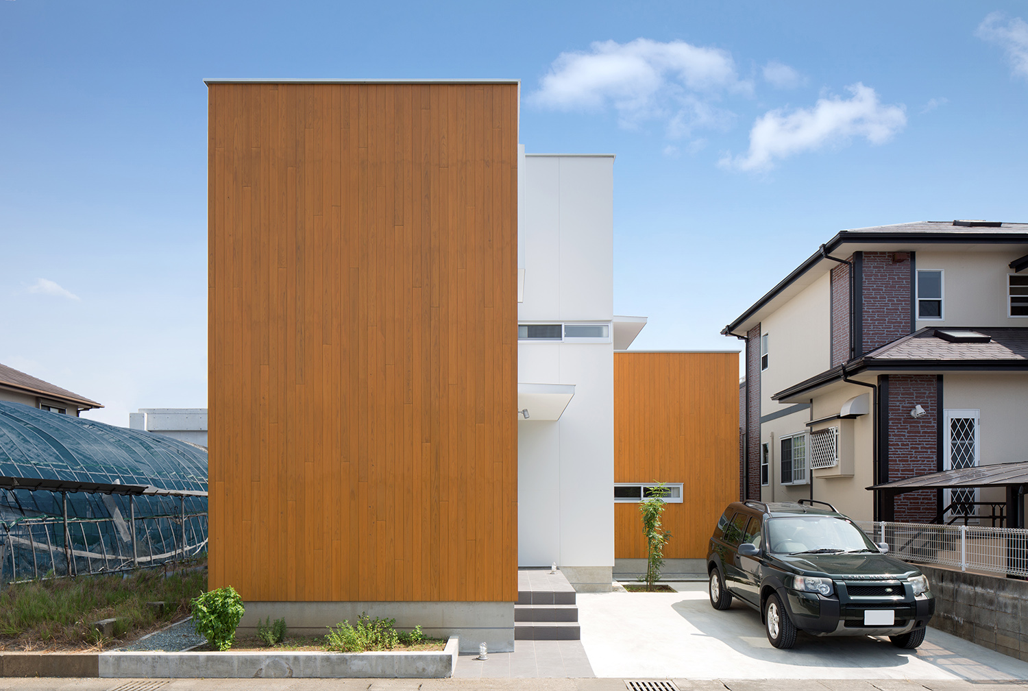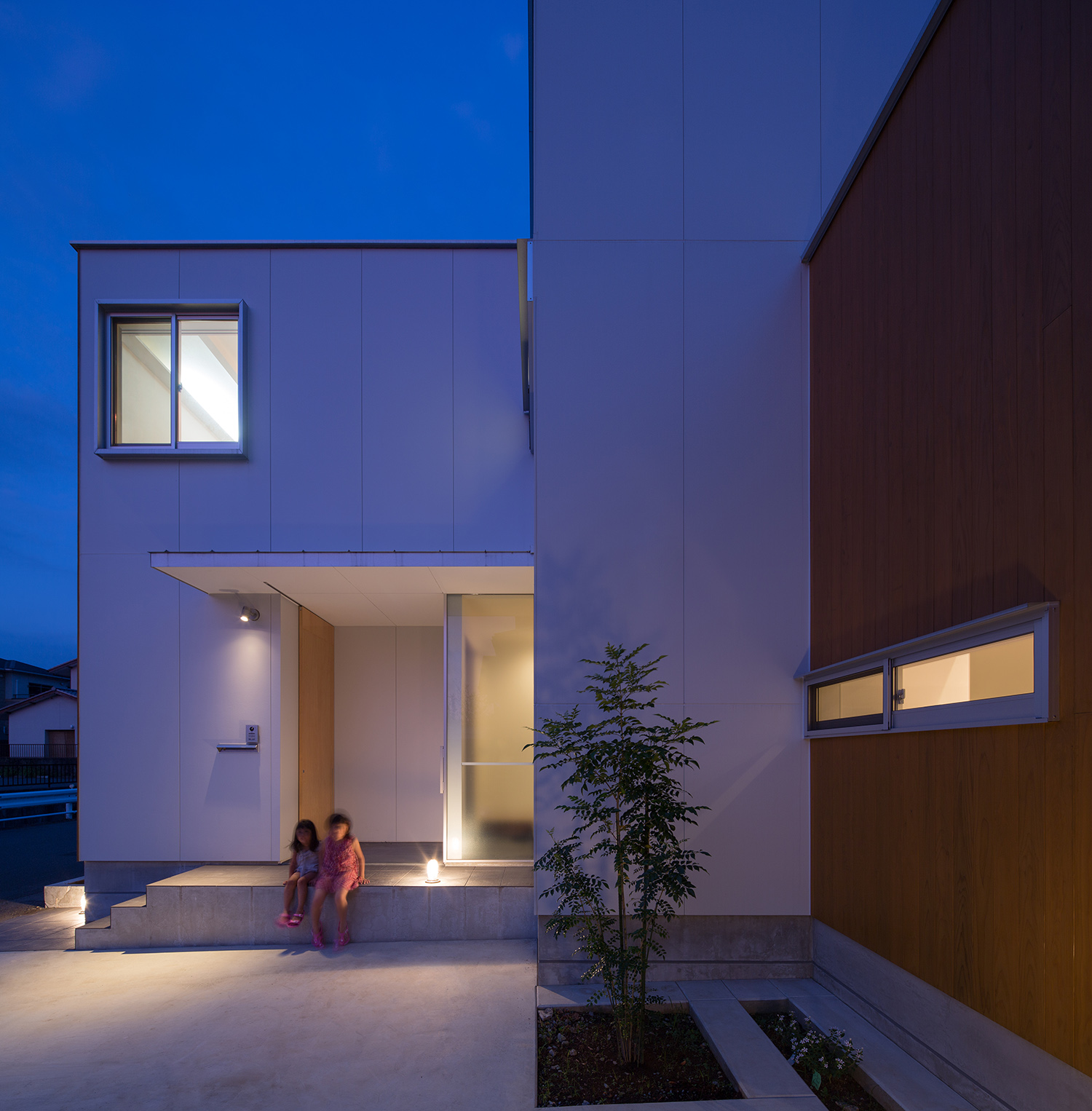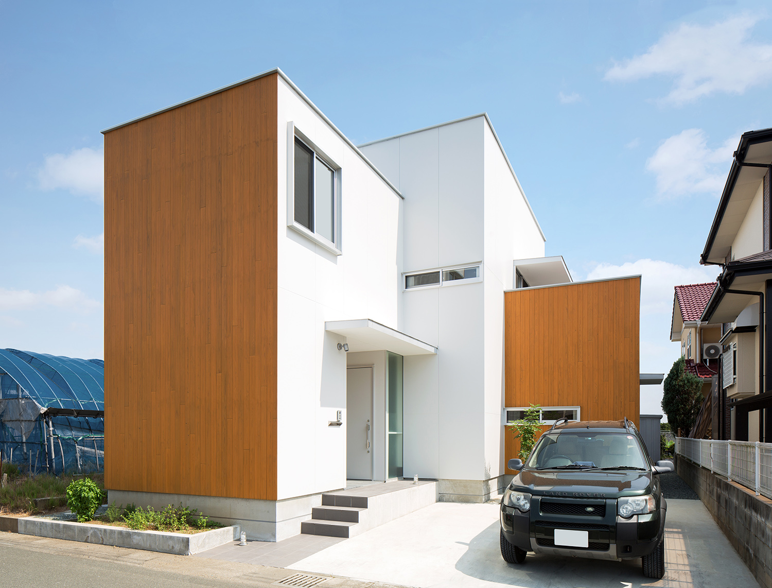 外観の特徴として、3つの高さの違うボリュームをデザイン的にずらしながら組み合わせ立体を構成。ずらすことで生まれる余白の空間を有効に活用している。ボリュームの高さは一番面の大きい東面で使用している既製品のサイディングのサイズを考慮し無駄のないよう、かつ余分な継ぎ目がでないよう決められている。そのうえで、一番高いボリュームはその天井空間をいかしたロフトがもうけられ、一番高さの低いボリュームはバルコニーの手摺の高さを外壁と一体化することでみえがかり上キューブとしている。機能はデザインに反映されている。白を基調とした建物とし、正面のボリュームの1面だけを羽目板で仕上げアクセントとしている。