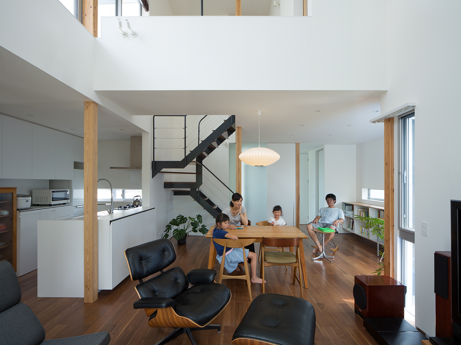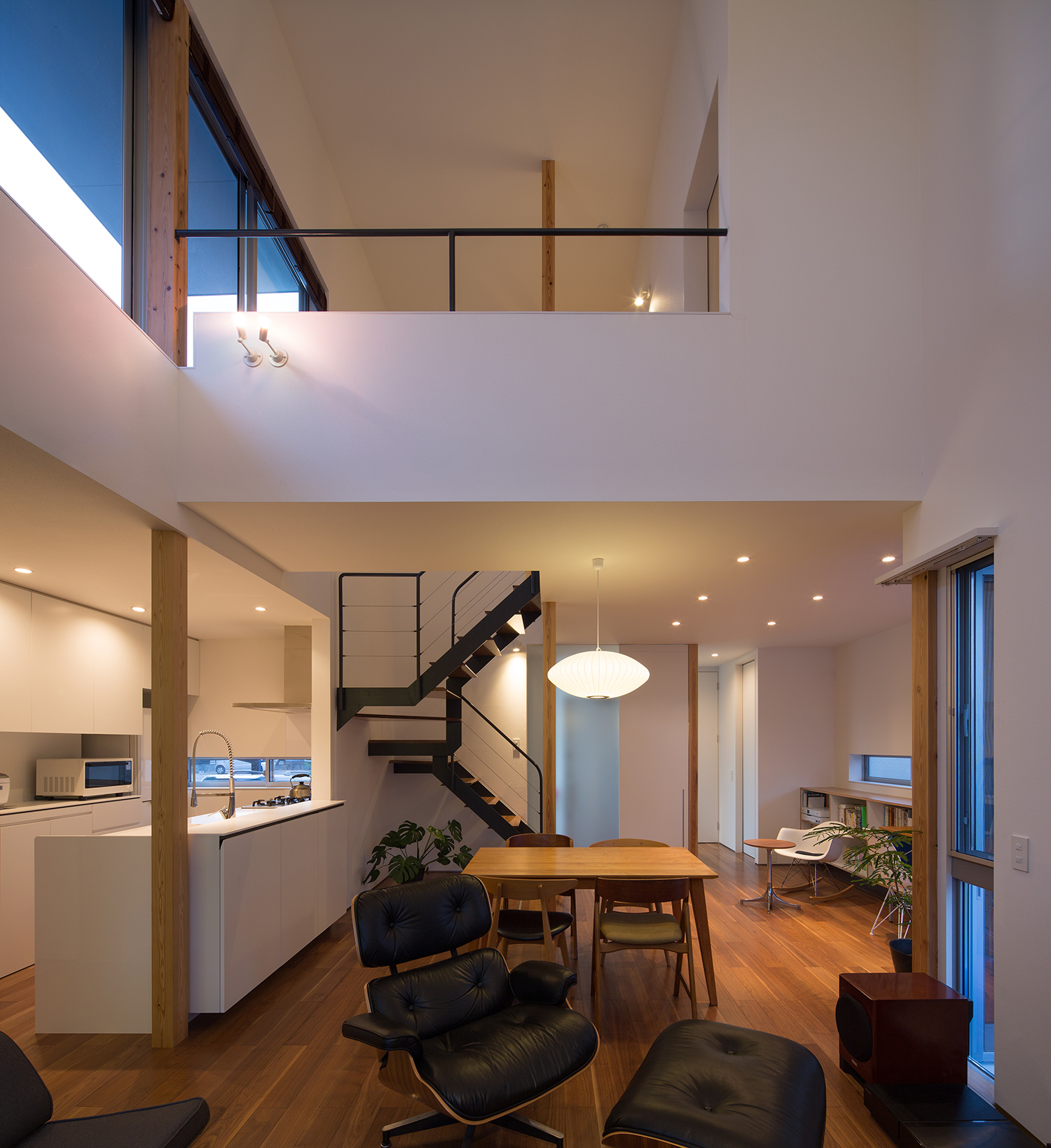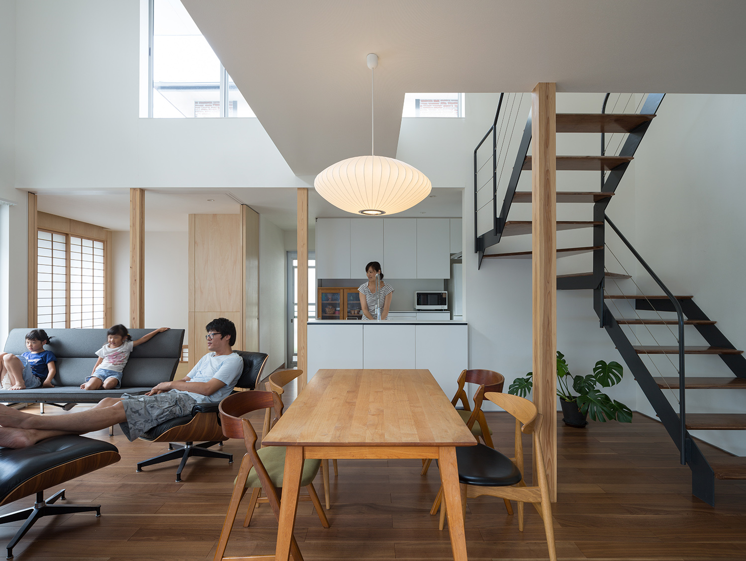 この計画は35坪程度の木造二階建ての新築で、要望としてご主人の趣味でもある名作家具のコレクションを生かす空間をもとめらられた。