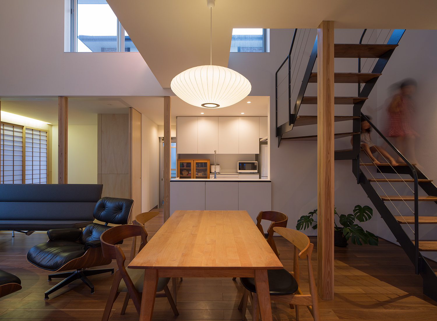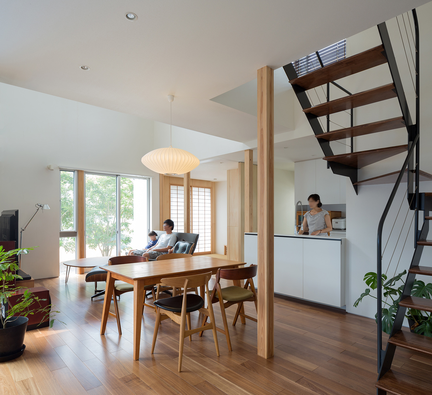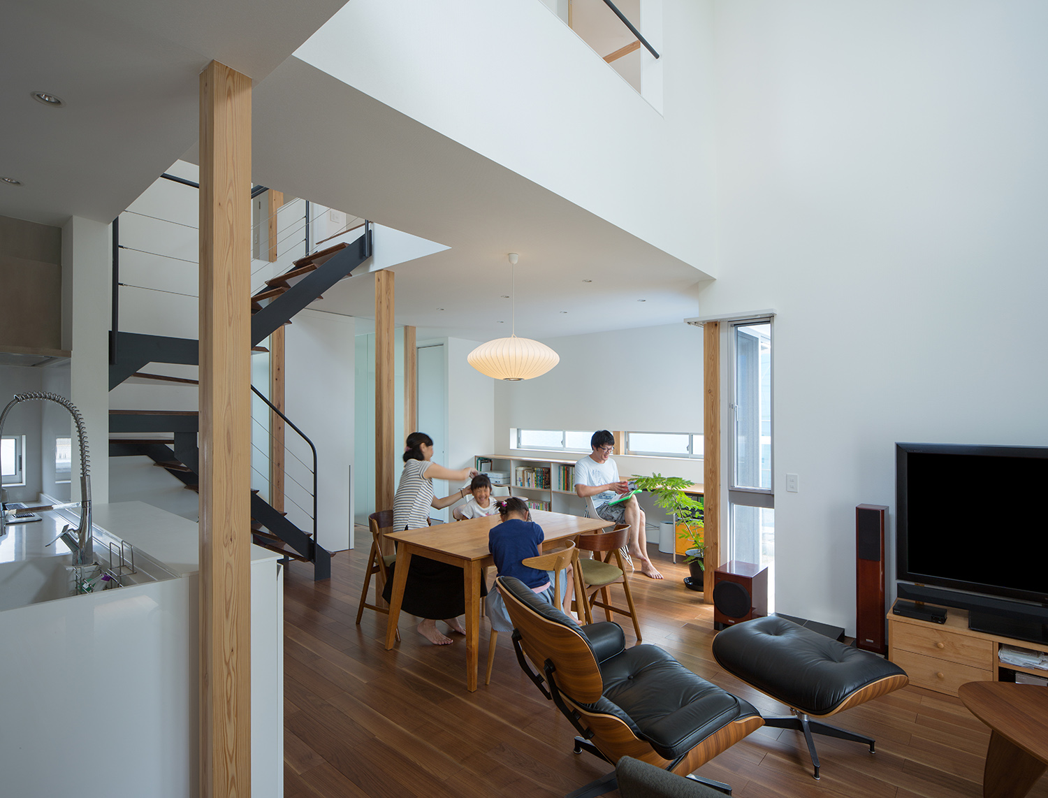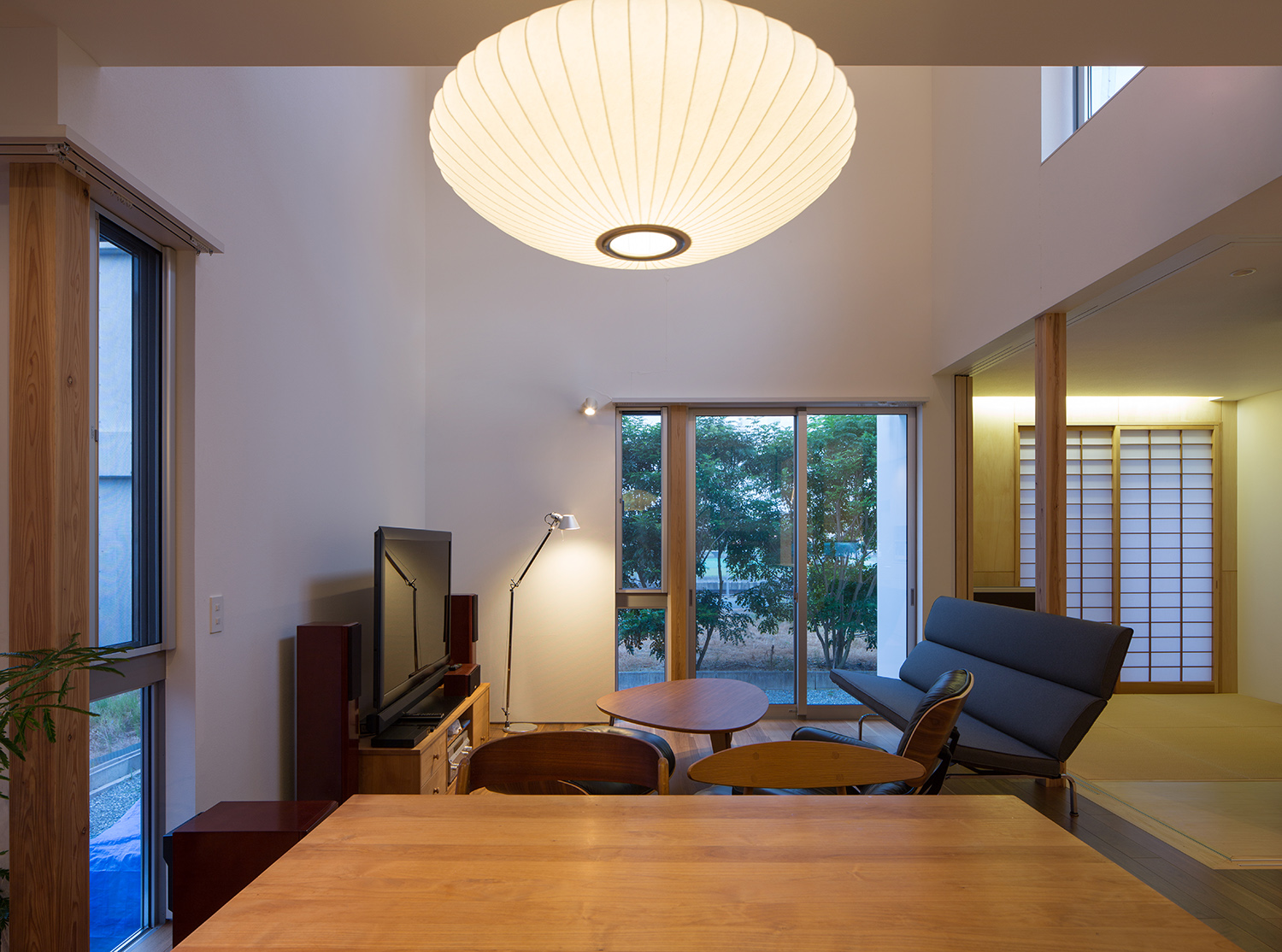 この計画は35坪程度の木造二階建ての新築で、要望としてご主人の趣味でもある名作家具のコレクションを生かす空間をもとめらられた。