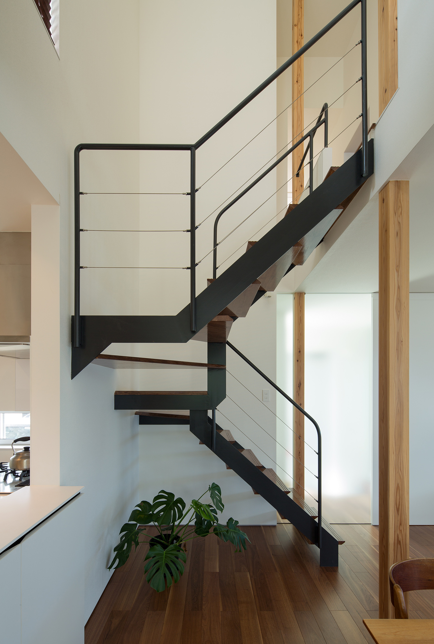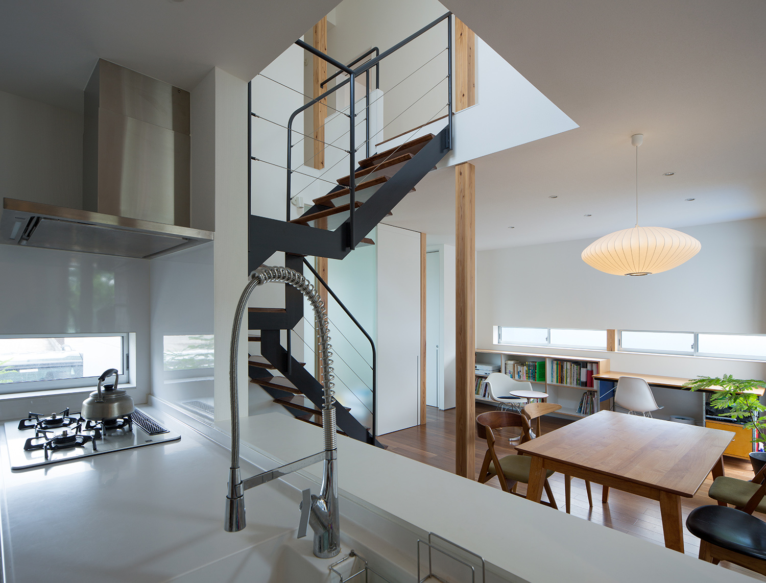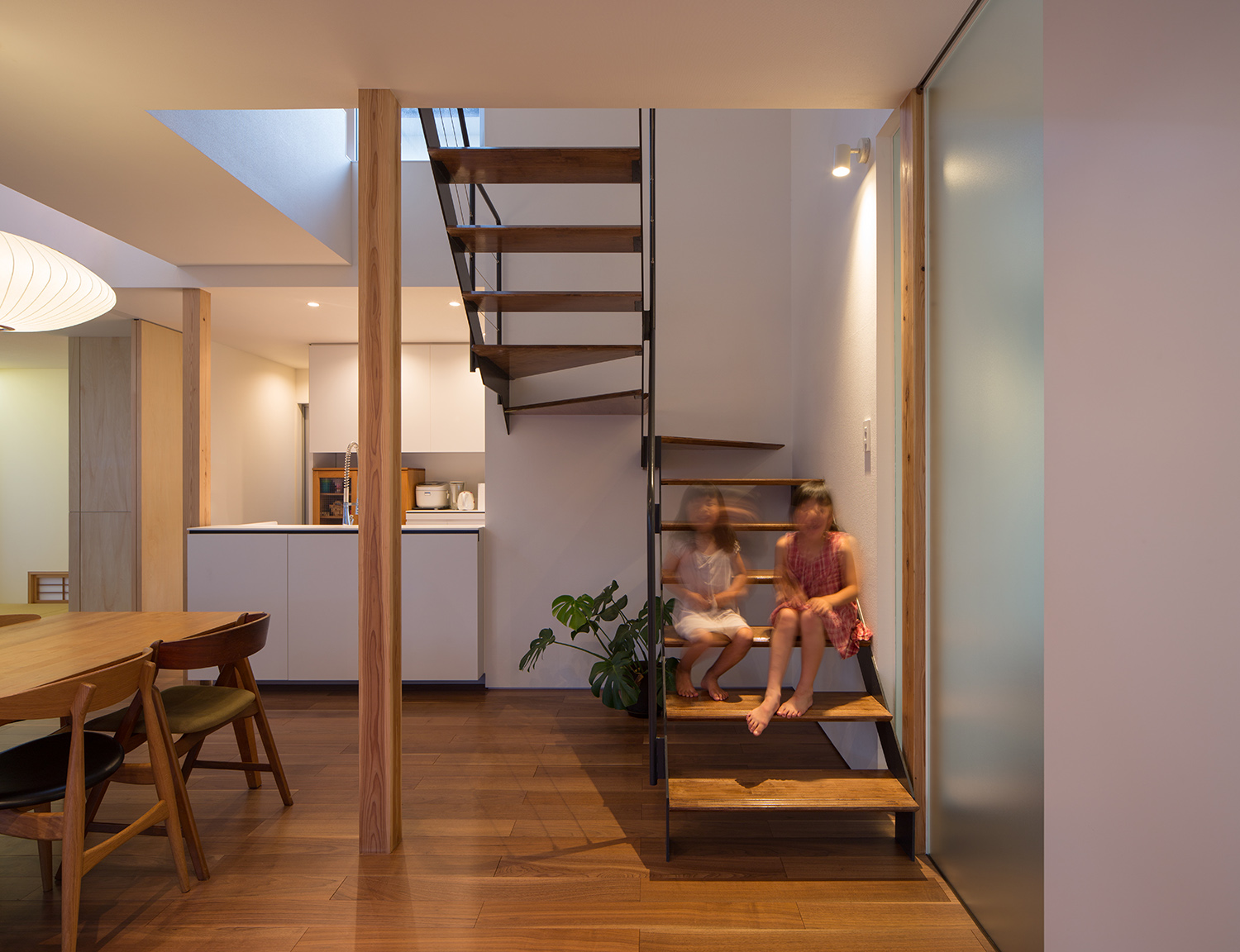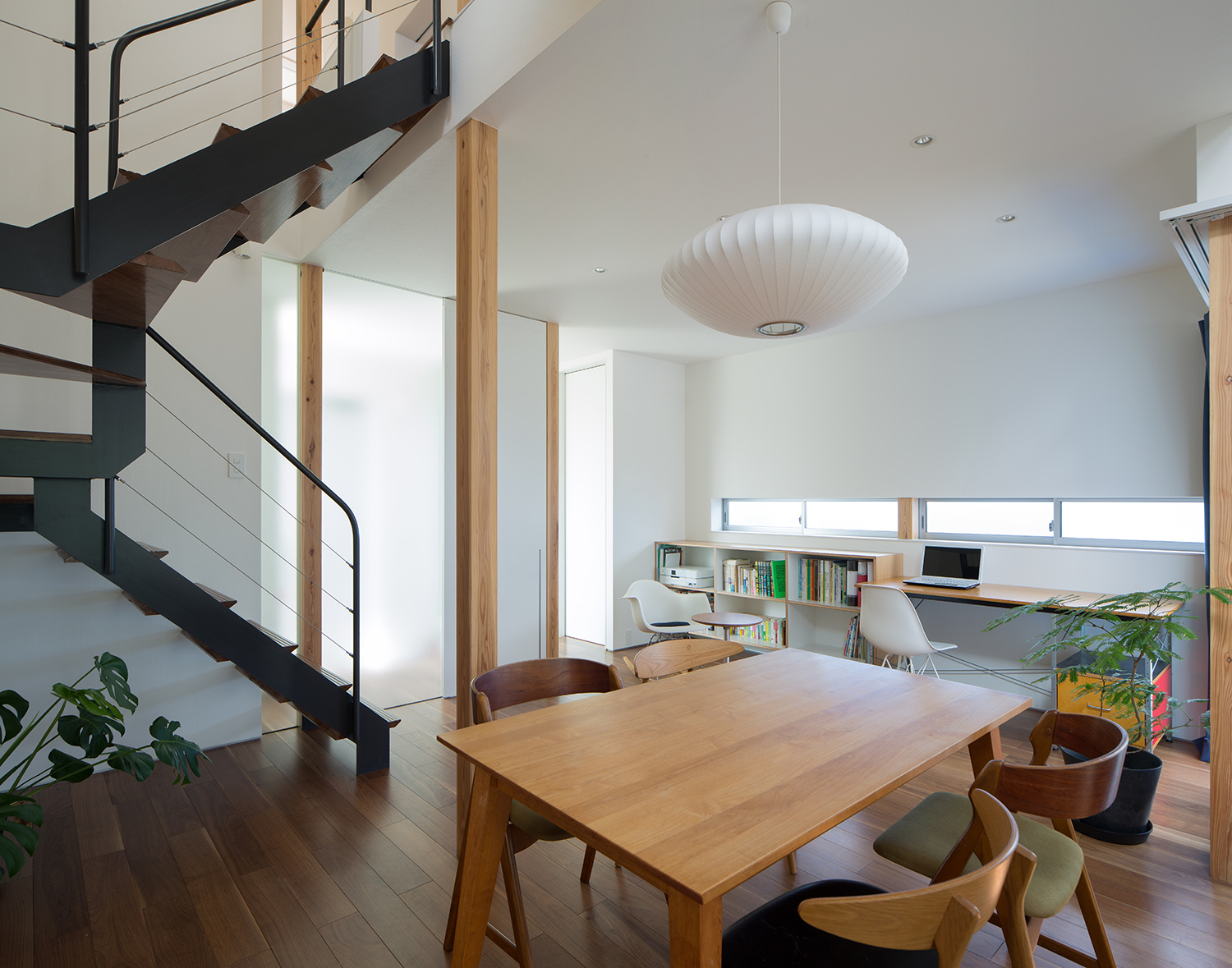 1階の床材はミッドセンチュリーの名作が多いこともあるので色彩の相性を考え、濃いウォルナットの床材をセレクト。本来なら家具との相性も考え無垢床材を採用したいところだが、空調計画として床暖房を採用しているためどうしても反りや割れなどの問題が生じてしまう。床暖房対応の無垢材もあるが、かなりコストがかかってしまい現実的には難しい。そこで厚張りの合板フローリング材をセレクトしている。表面の仕上げ材に2mmの無垢板が貼られており、限りなく無垢の風合いを保ちながら繊維方向を変えた合板は狂いが少なく床暖房にも対応できるという優れものだ。多少傷がついたり磨いたりしても同じ材があらわれるのも無垢材と同じ使い心地だ。また、仕上げ材にはワンポイントとして黒く塗装したスチールも随所で使用している。階段は回り階段をスチールのササラと板材の踏み板でスケルトンなディテールとし軽やかに構成している。造り付け家具は仕上げをタモ、収納内部を白いポリとし、それを化粧で積層させた材で構成。ミッドセンチュリーの雰囲気にあわせてデザインしている。照明計画はバブルランプを基準に考えられ、間接照明や足下照明などを多用。明るすぎず、均一にならないよう注意をはらいながら印象的な照明効果をこころがけた。