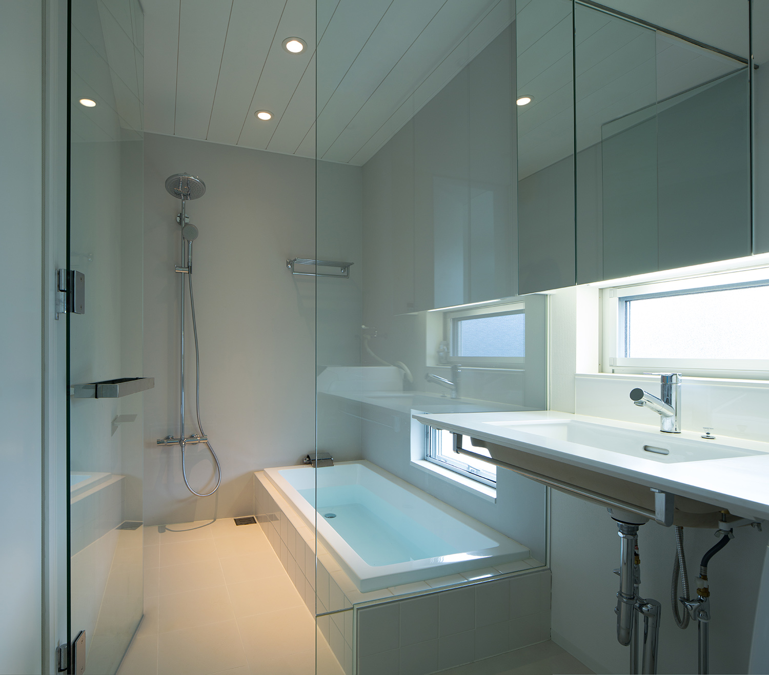 浴室はモルタルで仕上げられ、ヘッドシャワーのついたシャワーバーが設置される。仕切りはガラスでつくられ清潔でクリアな印象の洗面脱衣室としている。