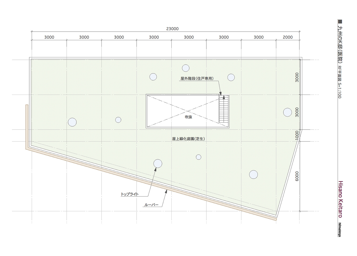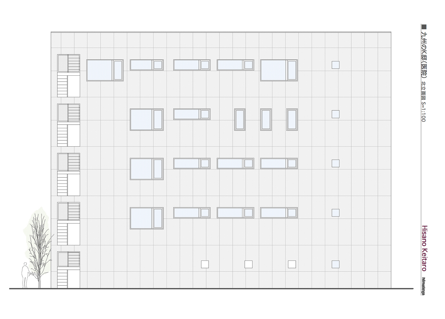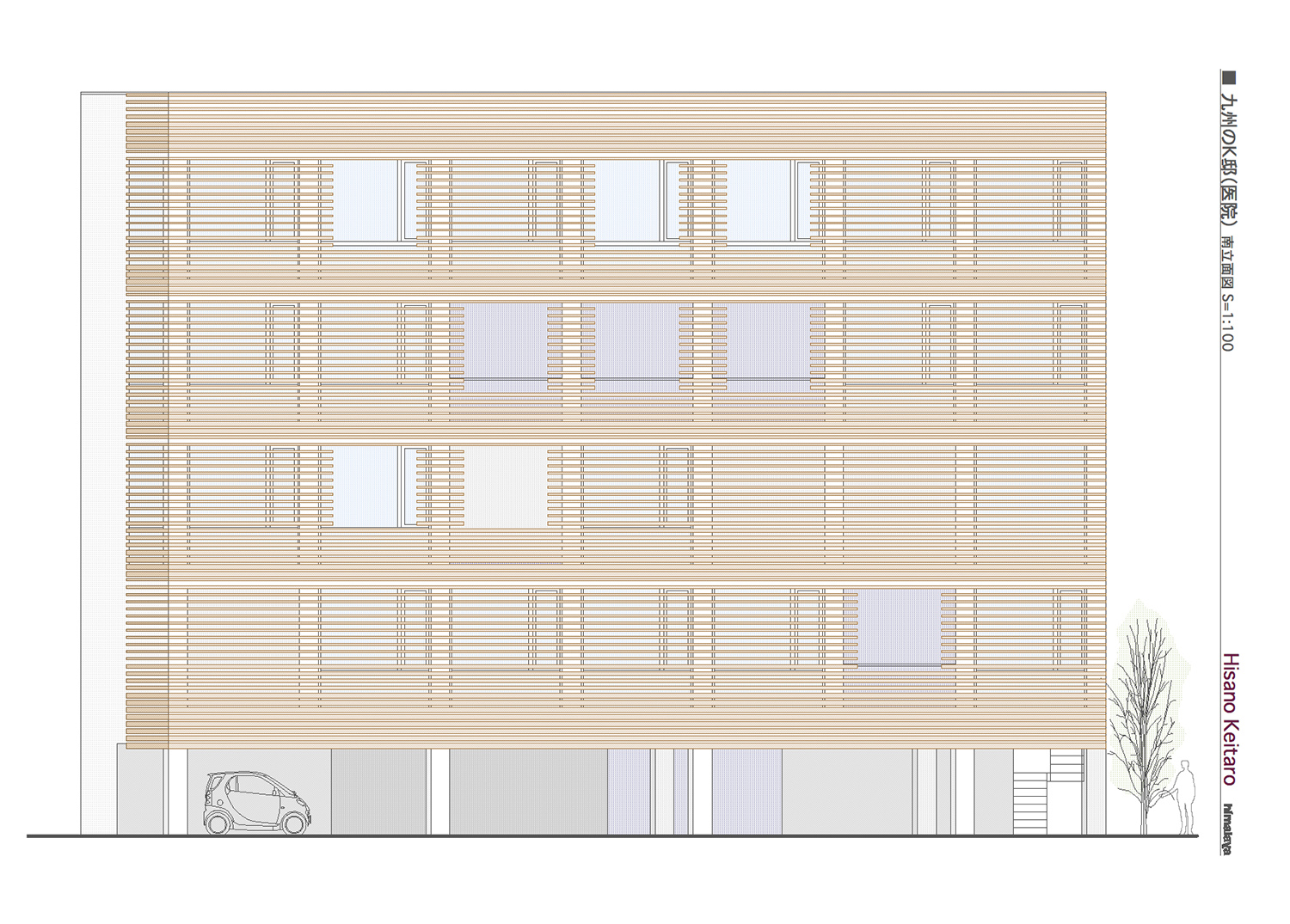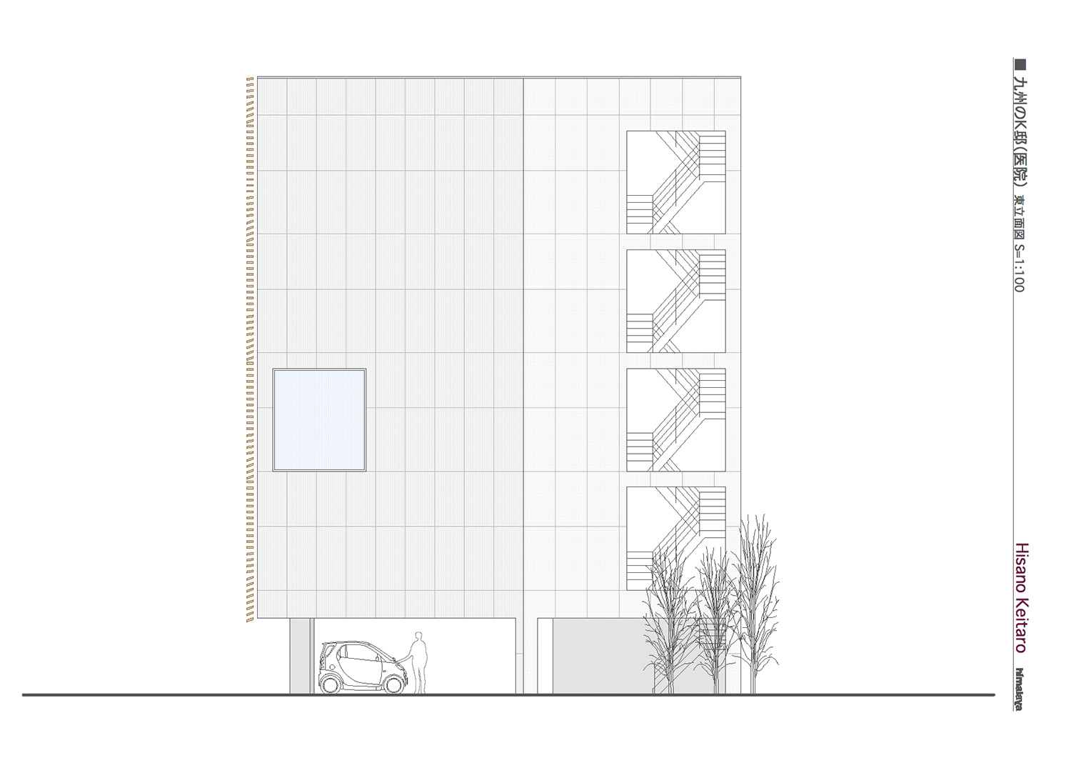 今回の計画は、医院という性格上、法的に要求される廊下や階段の幅員など制約が厳しい中で、要望、用途及び経済性などを検討すると、比較的狭小な敷地の容積いっぱいに建物を計画することが必要かつ妥当であると考えた。そこで、この計画を提案するにあたって、その表現の可能性を建物の表層と屋上に求めた。