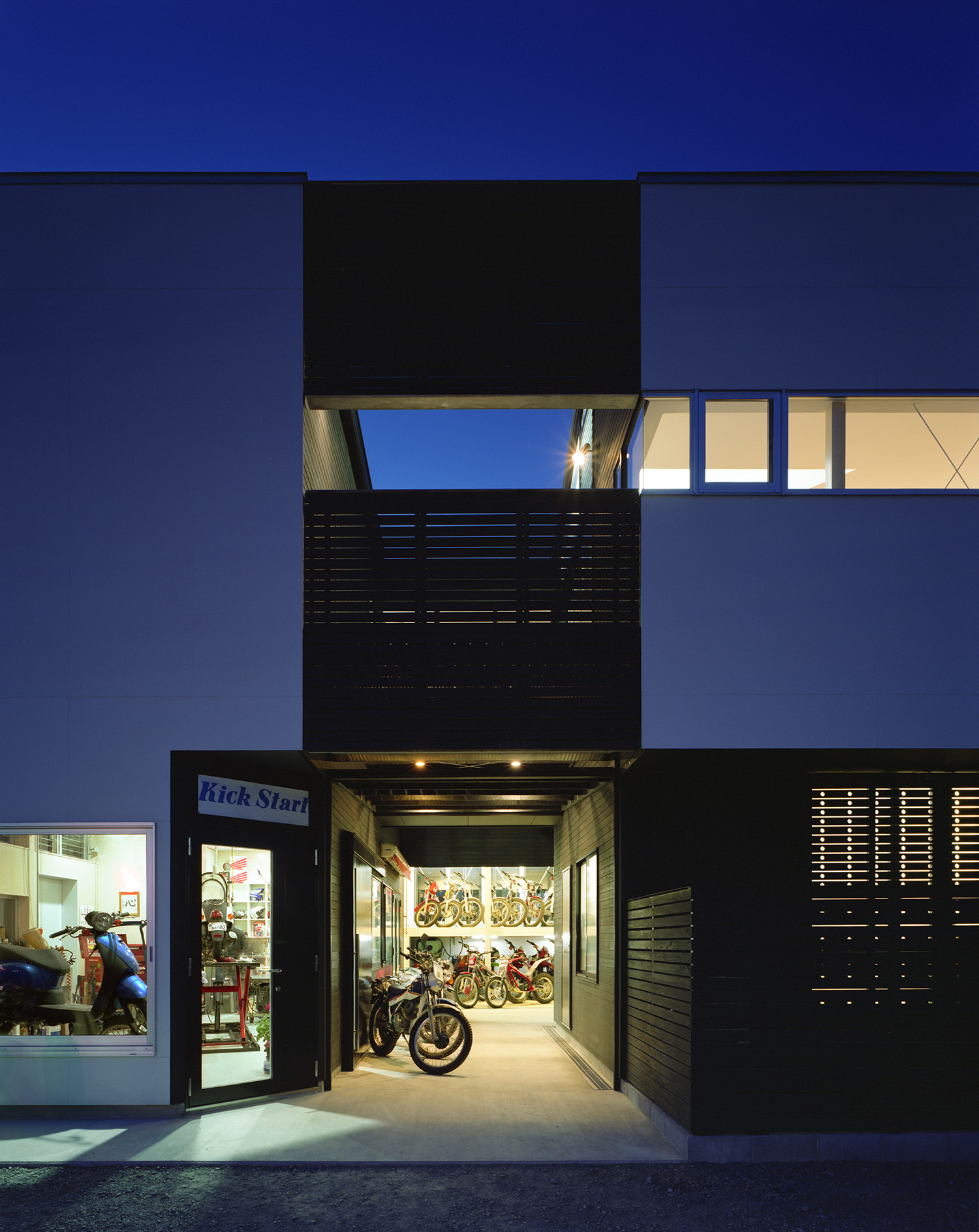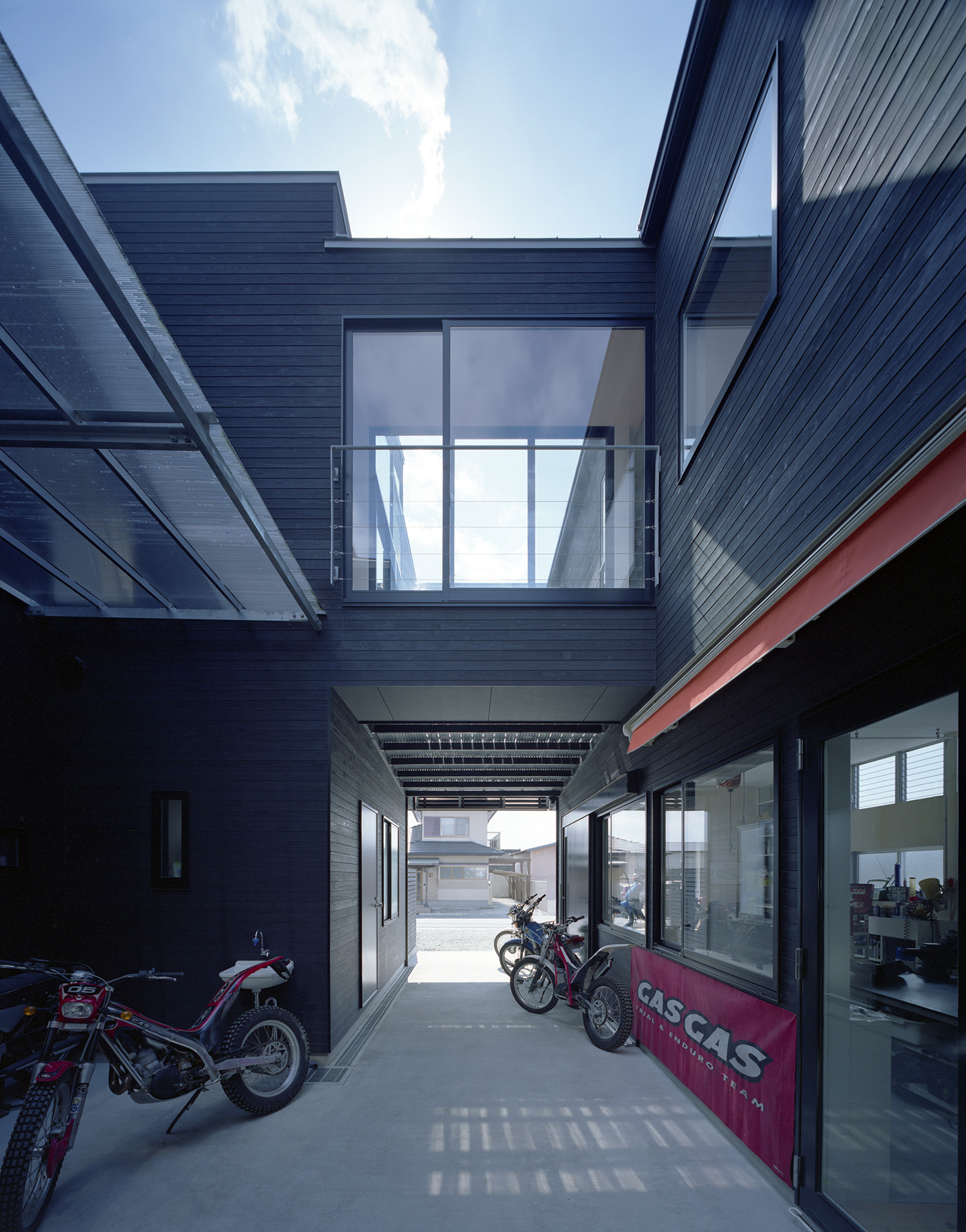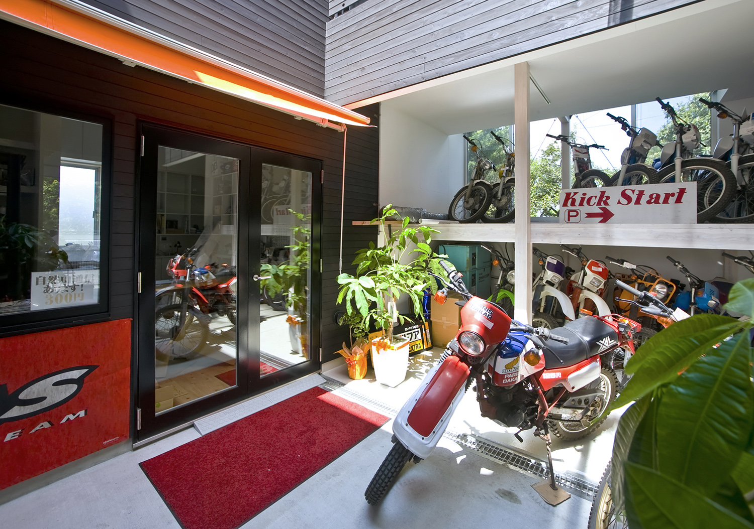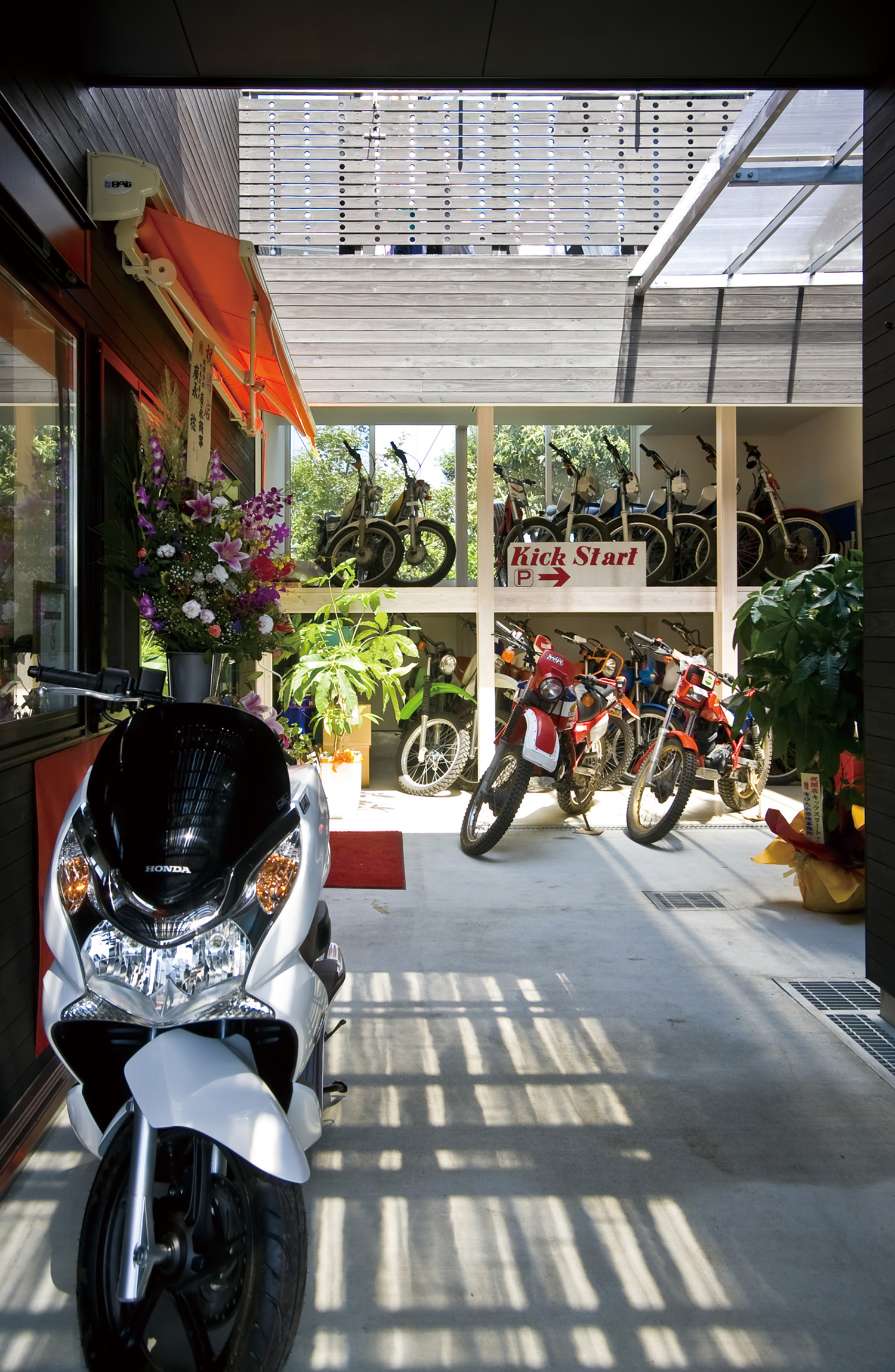 建主は著名なトライアルライダーで、今回の計画はご本人が経営されているオフロードやトライアル系の種類に限定したバイクショップ兼用の自宅である。店舗、作業場、屋外の作業場、バイク在庫置場、アウトドアリビング、子供を含む家族全員の個室、同居されているお母様のための部屋とたくさんの諸室がもとめられた。
