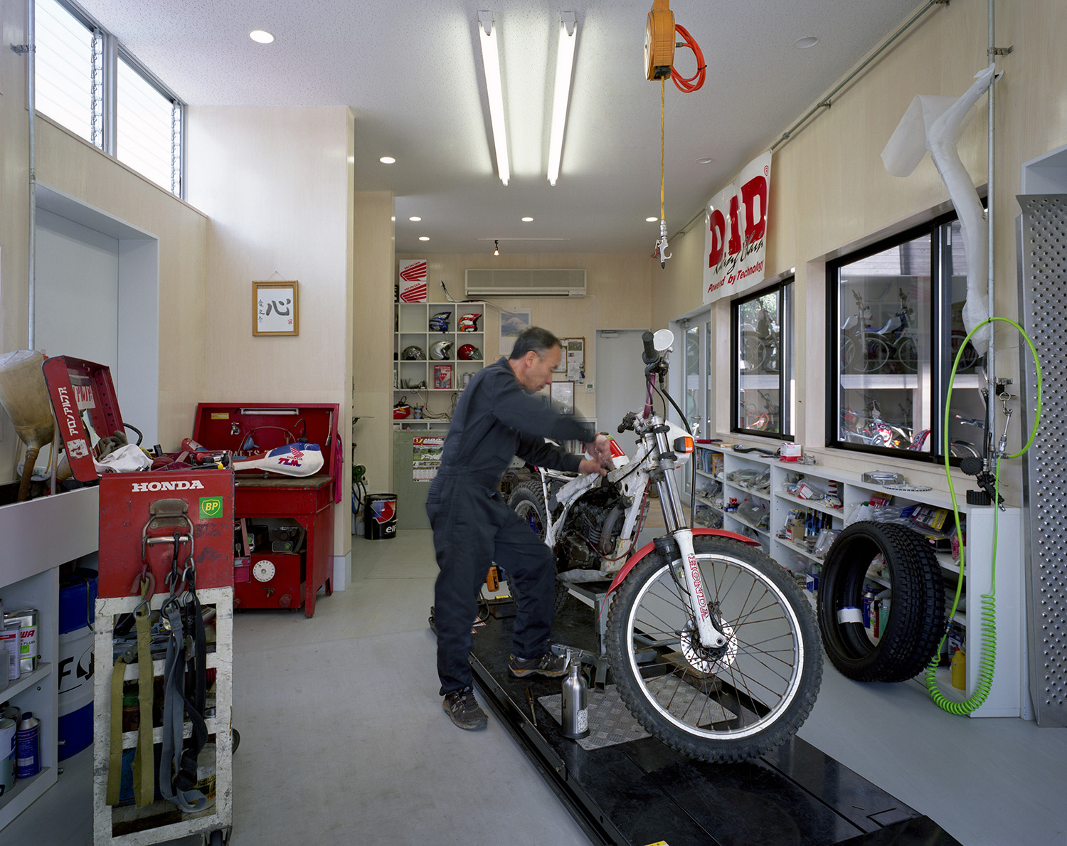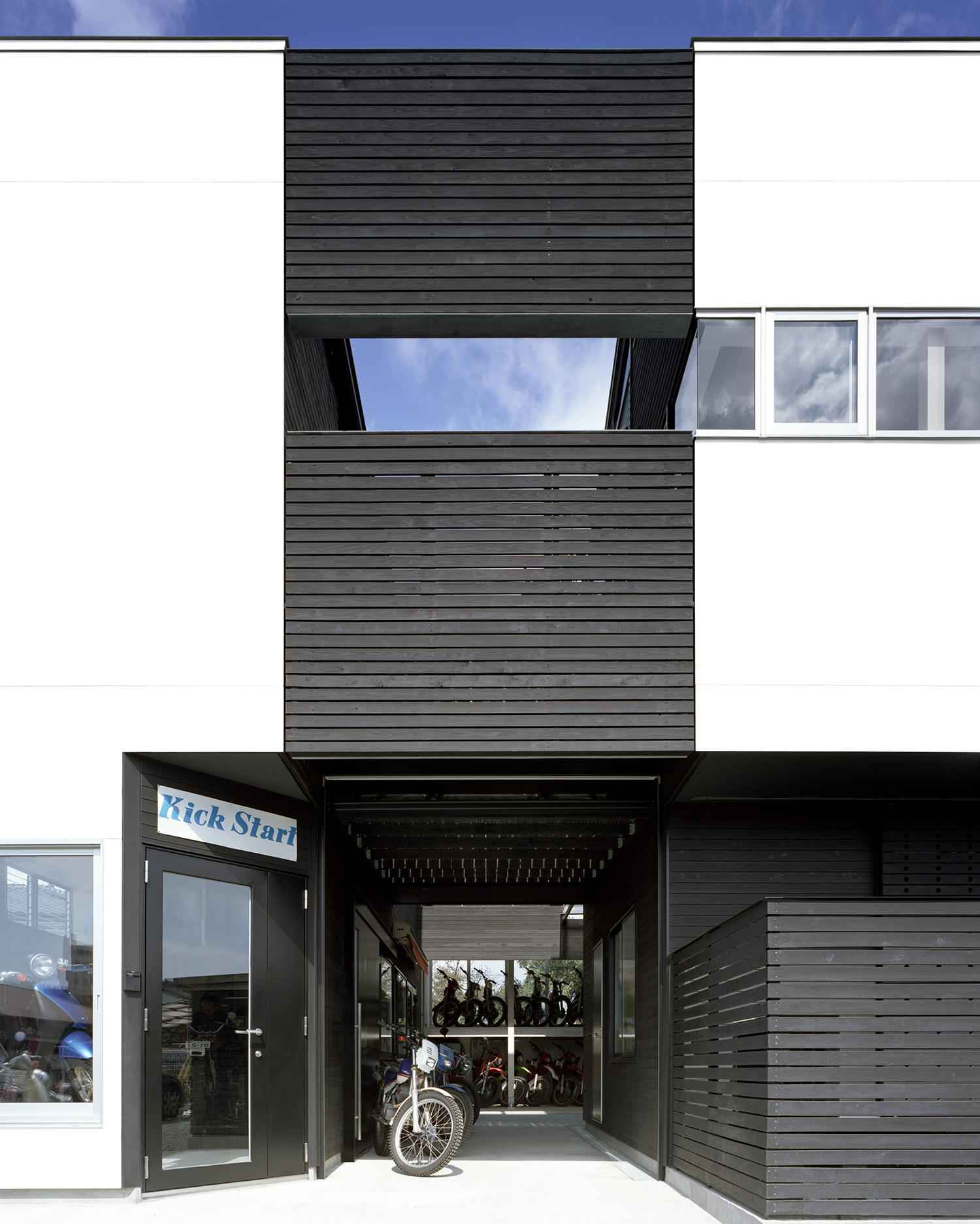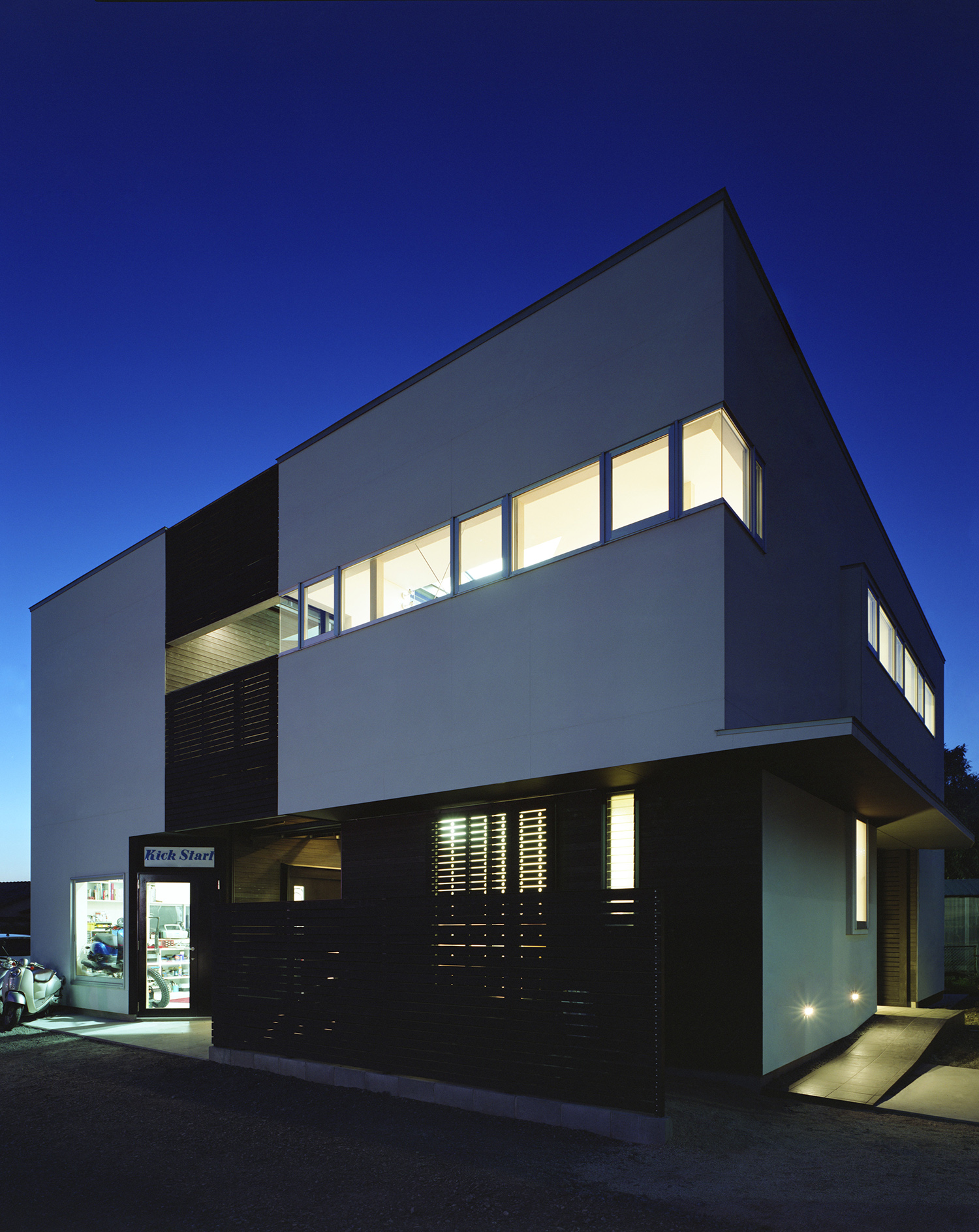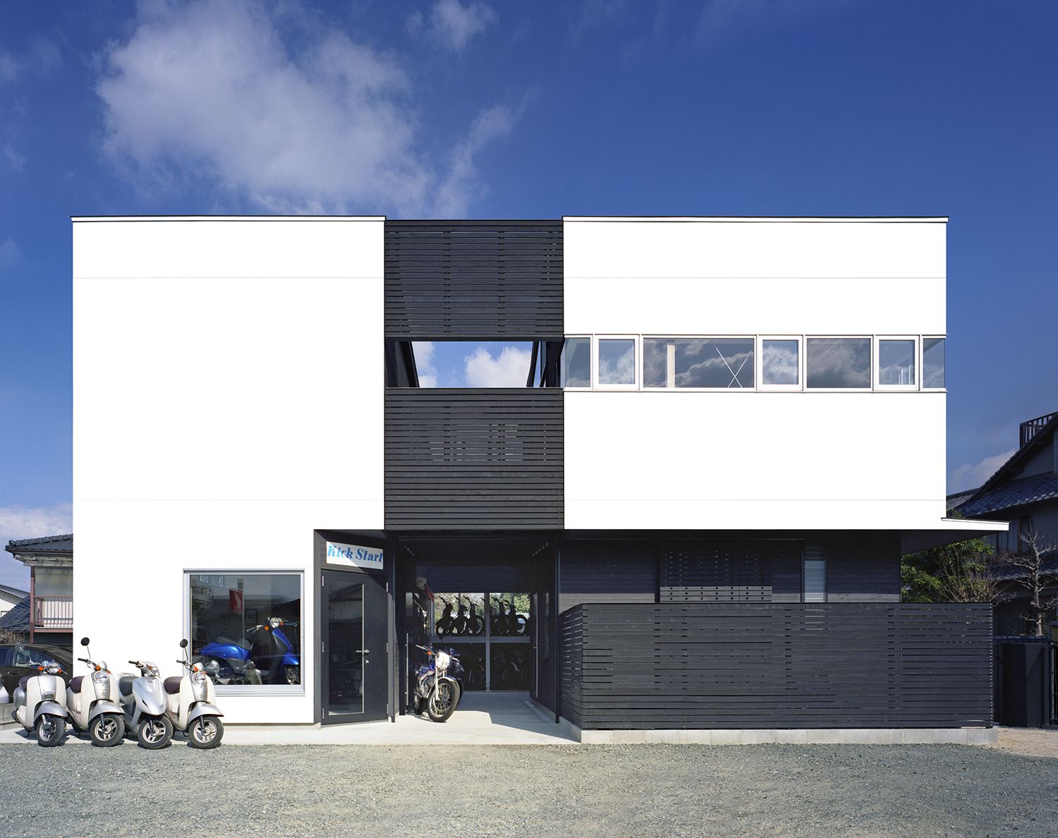 建主は著名なトライアルライダーで、今回の計画はご本人が経営されているオフロードやトライアル系の種類に限定したバイクショップ兼用の自宅である。店舗、作業場、屋外の作業場、バイク在庫置場、アウトドアリビング、子供を含む家族全員の個室、同居されているお母様のための部屋とたくさんの諸室がもとめられた。