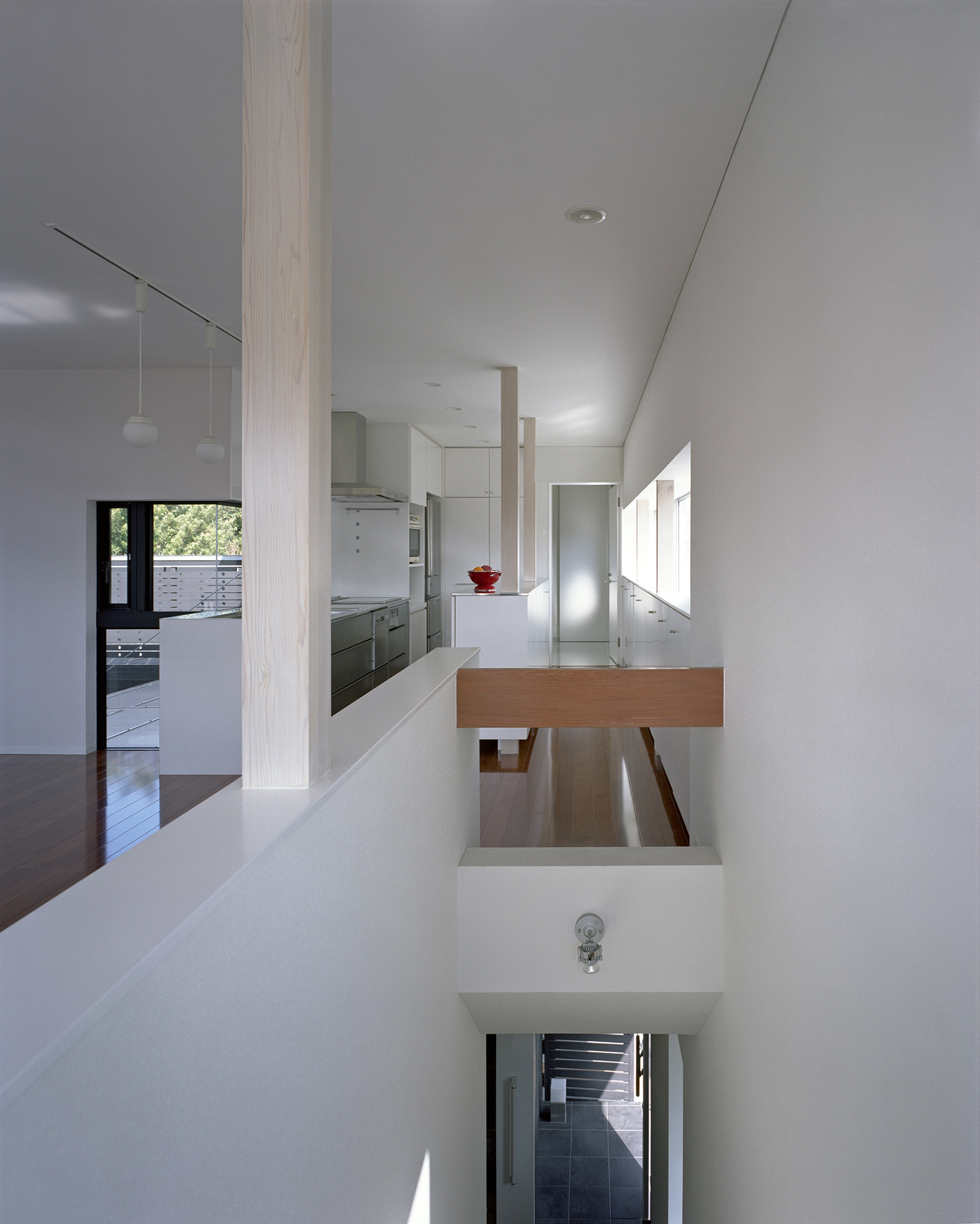 住宅部分は2階部分に集約。基本的にワンフロアとなっている。中庭吹き抜けに面した回廊形式のプランとしている。敷地を見て感じたのは地形的に高台にあり、阿蘇の山並みが裾野のほうまで望める立地であるということだった。そこで、建物の東側から南側にかけて水平に窓を連続。阿蘇の山並みが一望できるように計画している。そして、その水平線が外観上の特徴ともなっている。構造的に必要な壁は鉄筋の筋交いをそのまま露出してみせることで開口部の一部とし、より水平性を強調している。