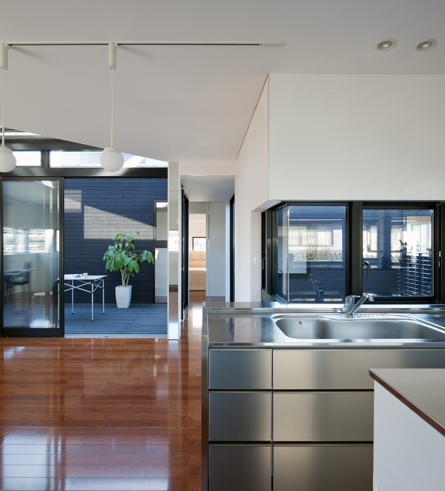 性格の異なる空間をオープンスペースで連結させた店舗併設の二世帯住宅。