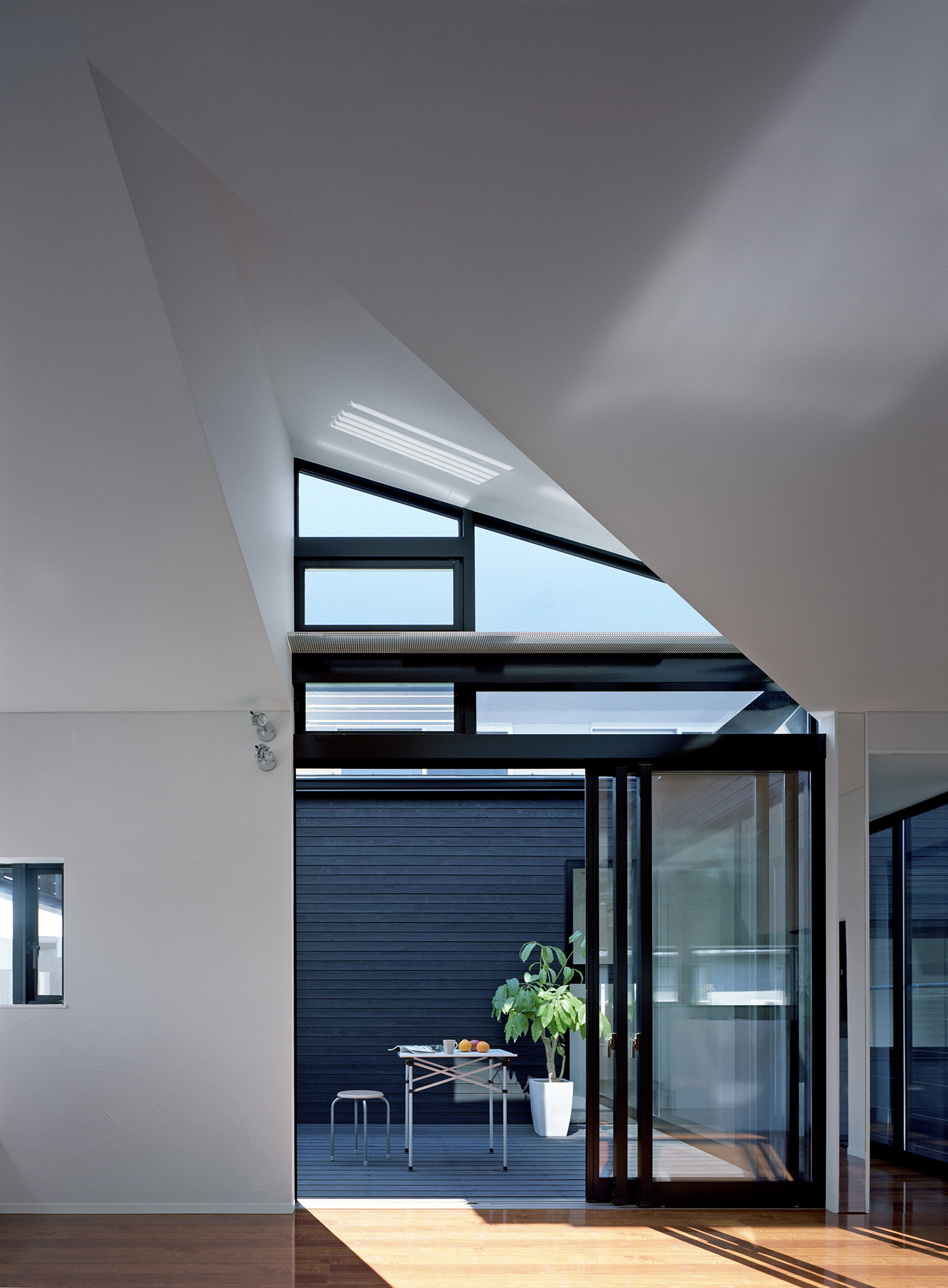 2階にリビングをレイアウトするとどうしてもインドアな空間にまとまりがちなので、リビングに接して、オープンスペースに面した大きなテラスを設けることでアウトドアリビングを可能としている。天井の形状を変化させることでフラットになりがちな空間に変化をつけている。