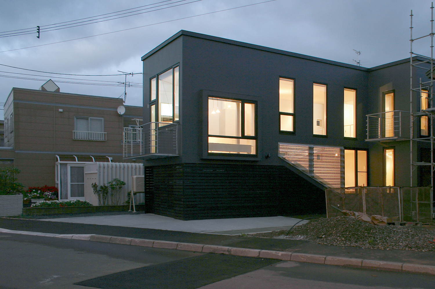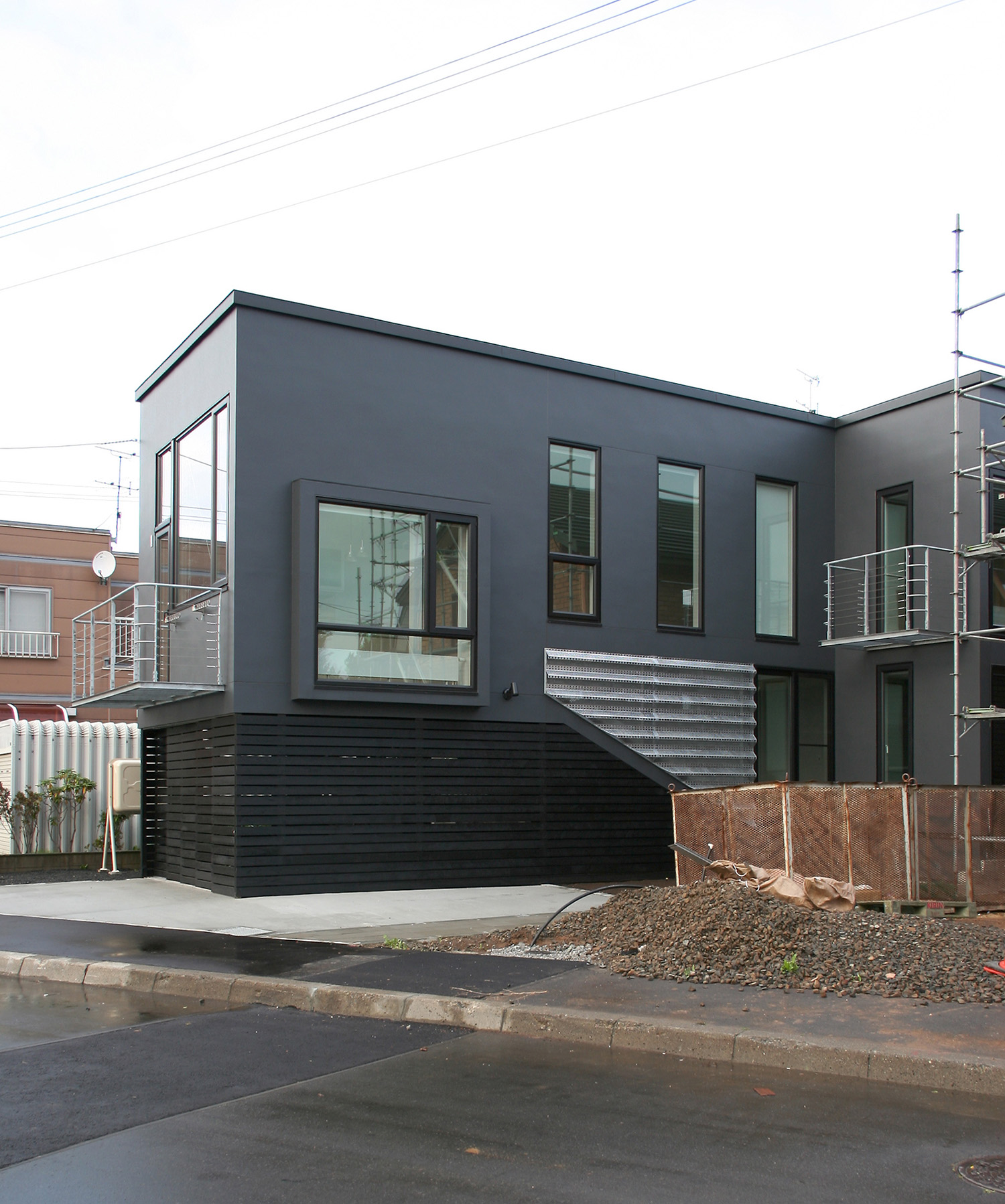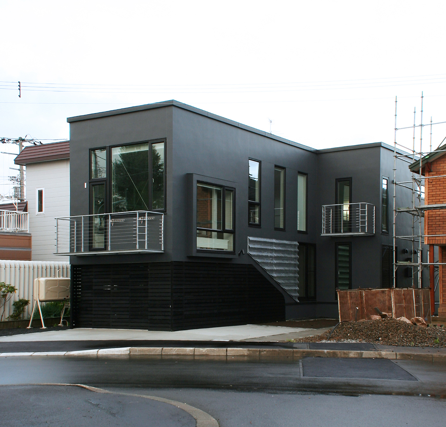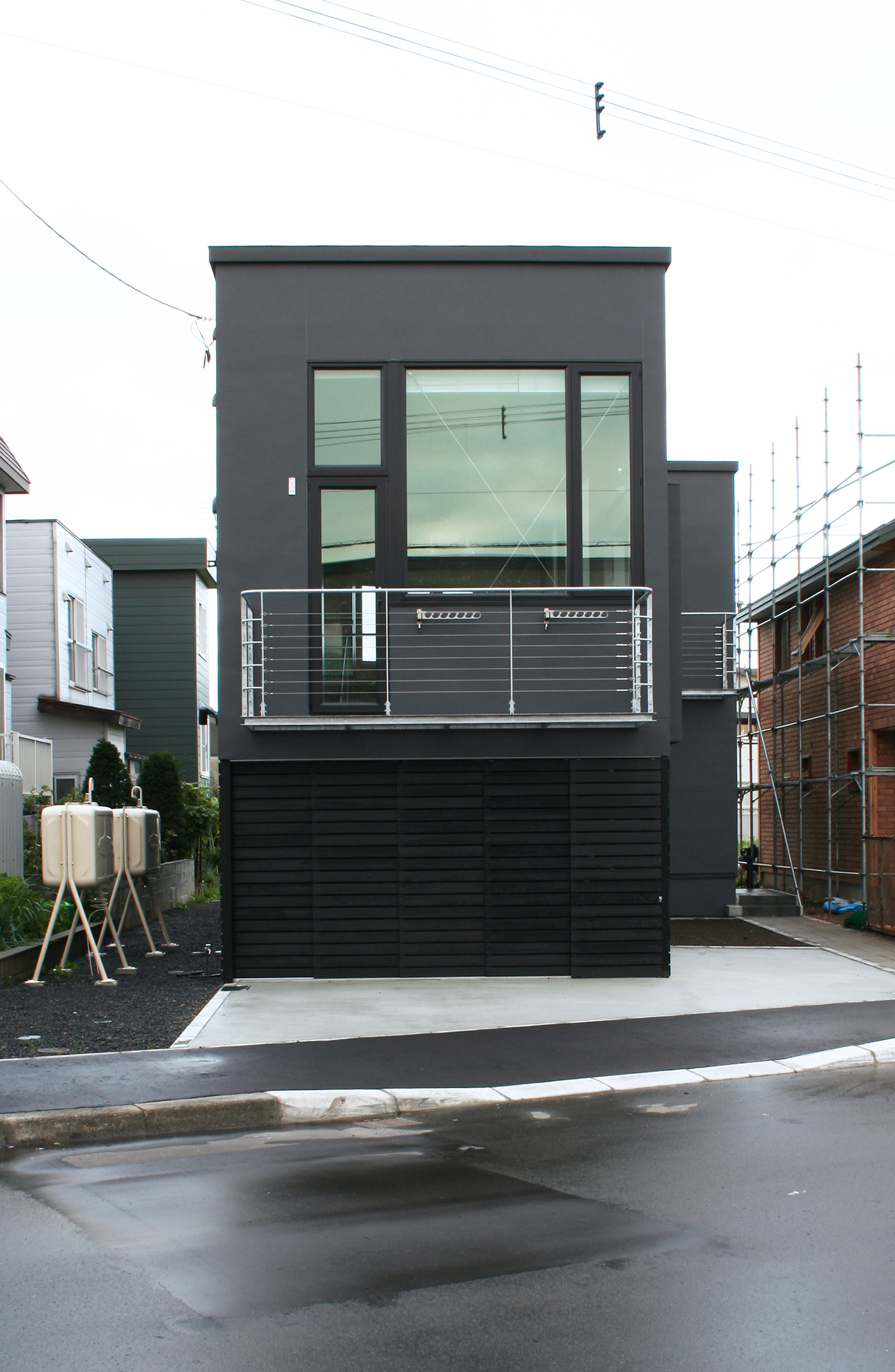 この家の外壁は最新のひび割れ防止の対策を施したモルタルの壁面とし、フラットに塗り込めた上でツヤを落とした黒色で塗装されている。吹きつけ塗装ではなく、ローラー塗装とされた壁面はきわめて平滑に仕上げられ、まさに職人の技術のおかげで実現されている。このモルタル壁面は歳月とともに落ち着いた色合い風合いとなっていくことだろう。