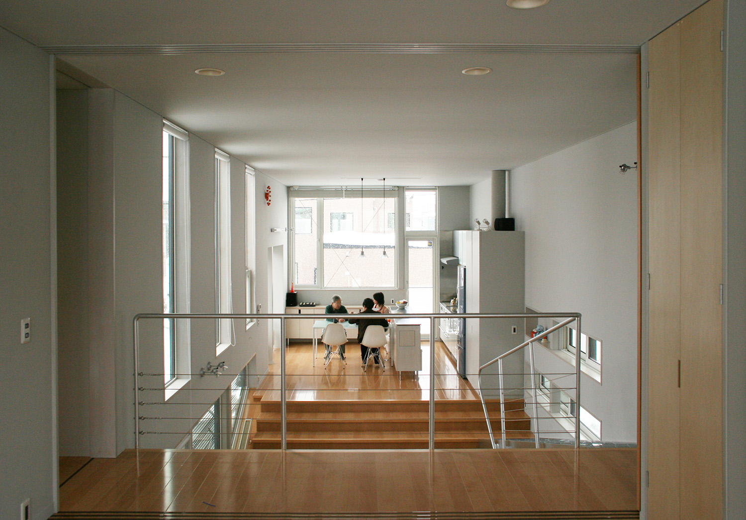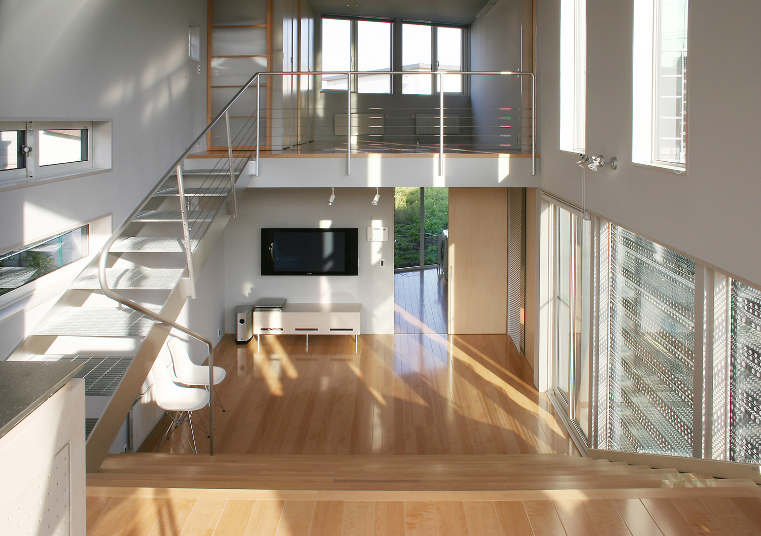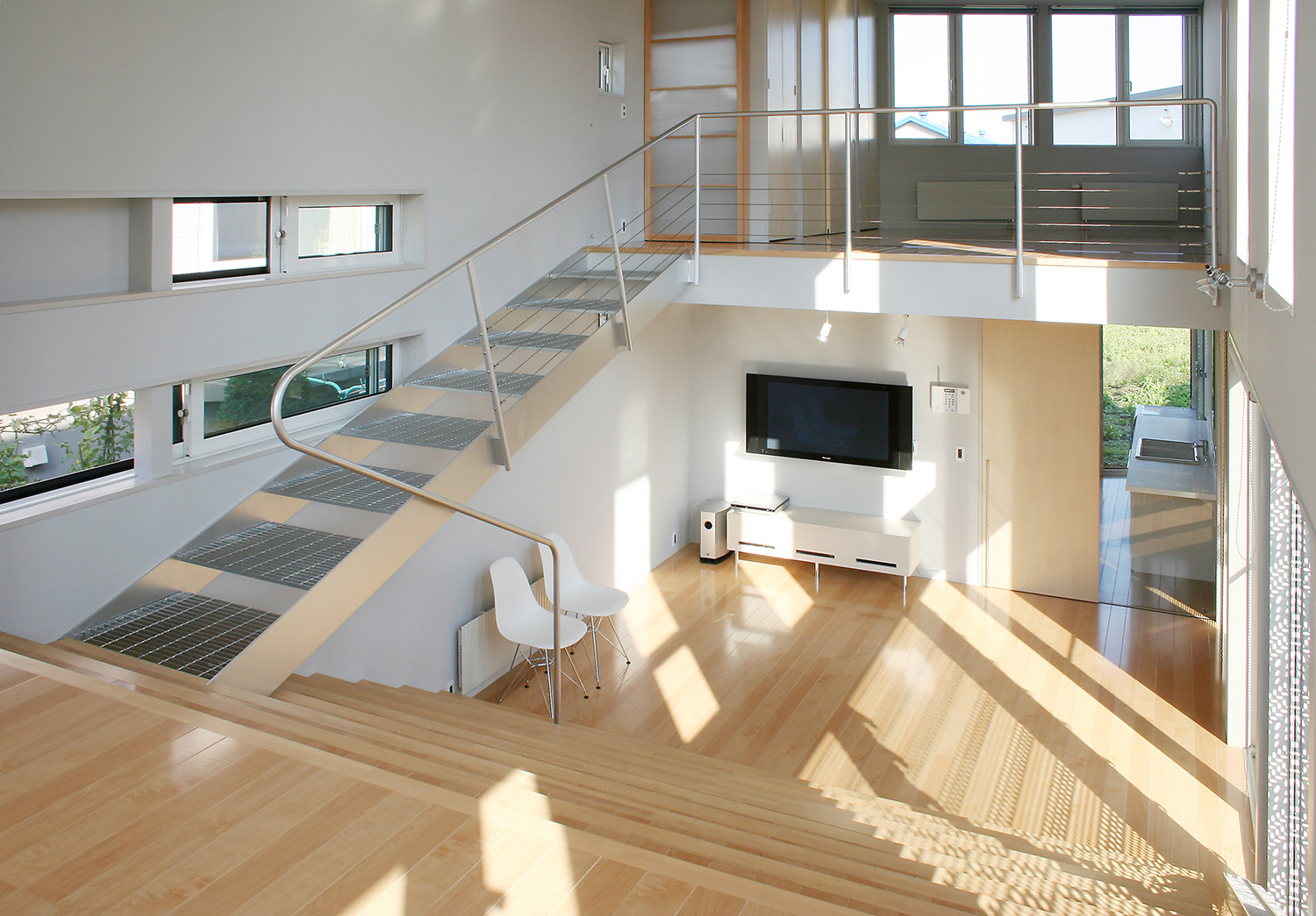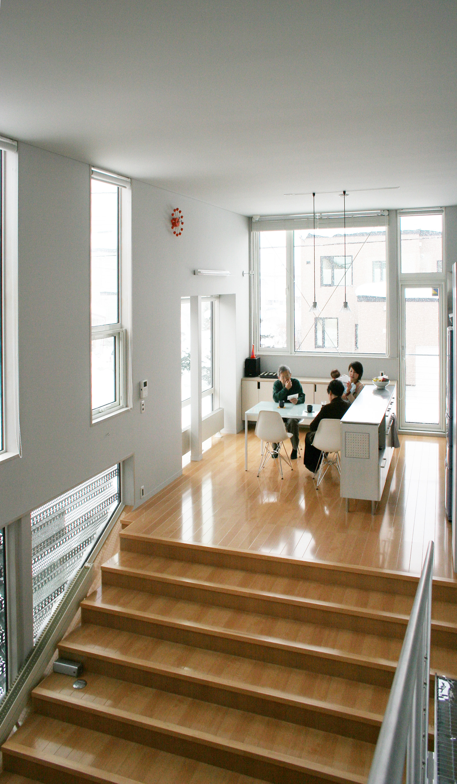 雪国に建てられる住宅のため、冬期でも日当たりのよい明るい家とする必要があった。時間とともに変化する複雑な日当たりが空間を華やかに彩る。