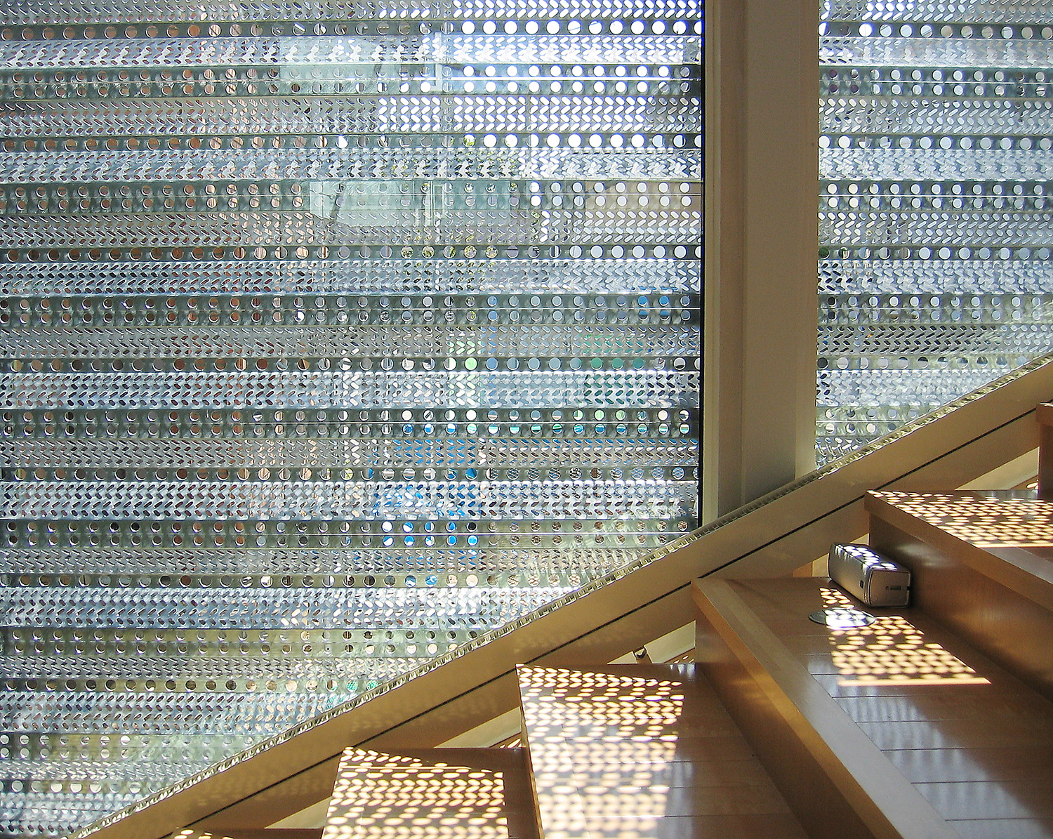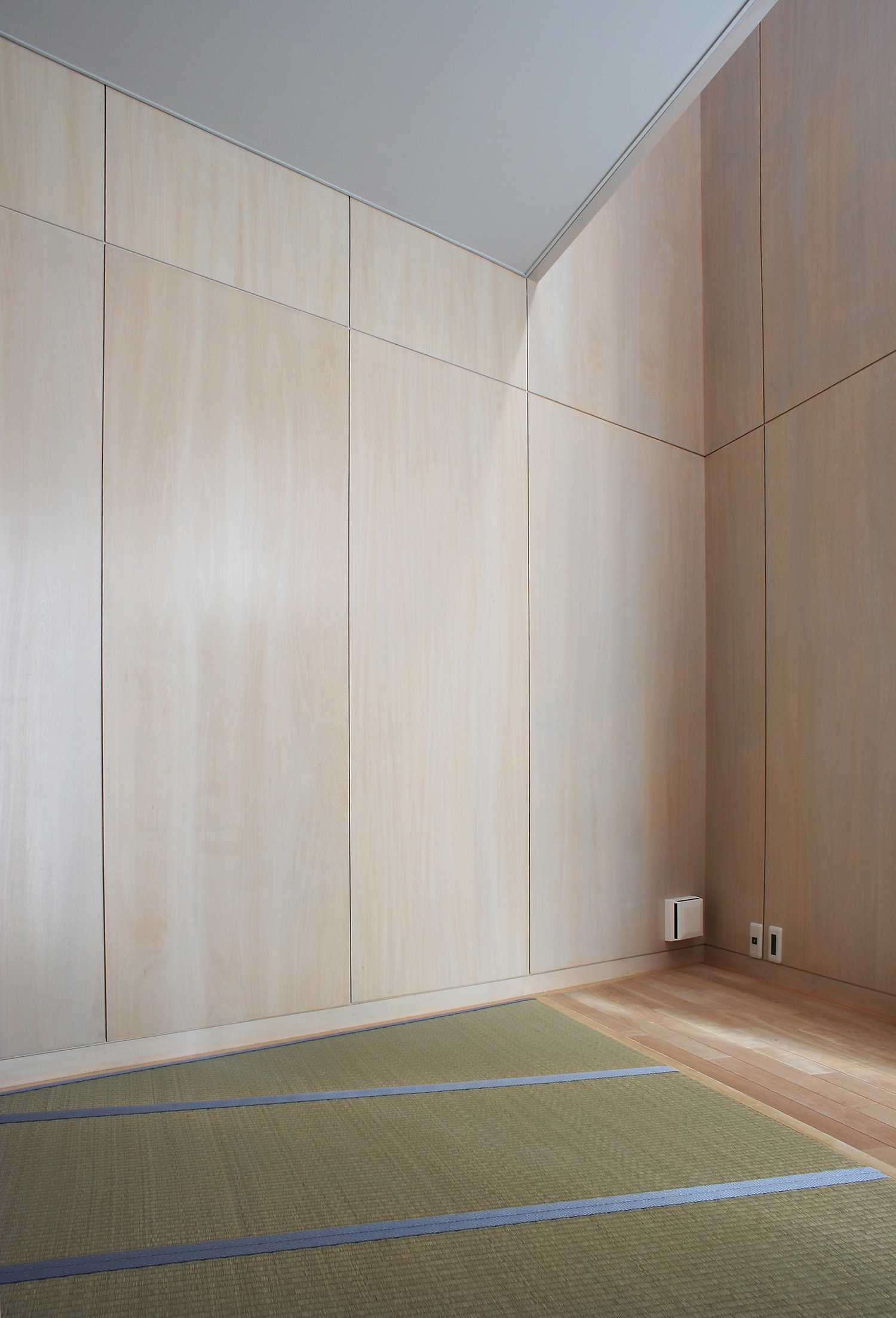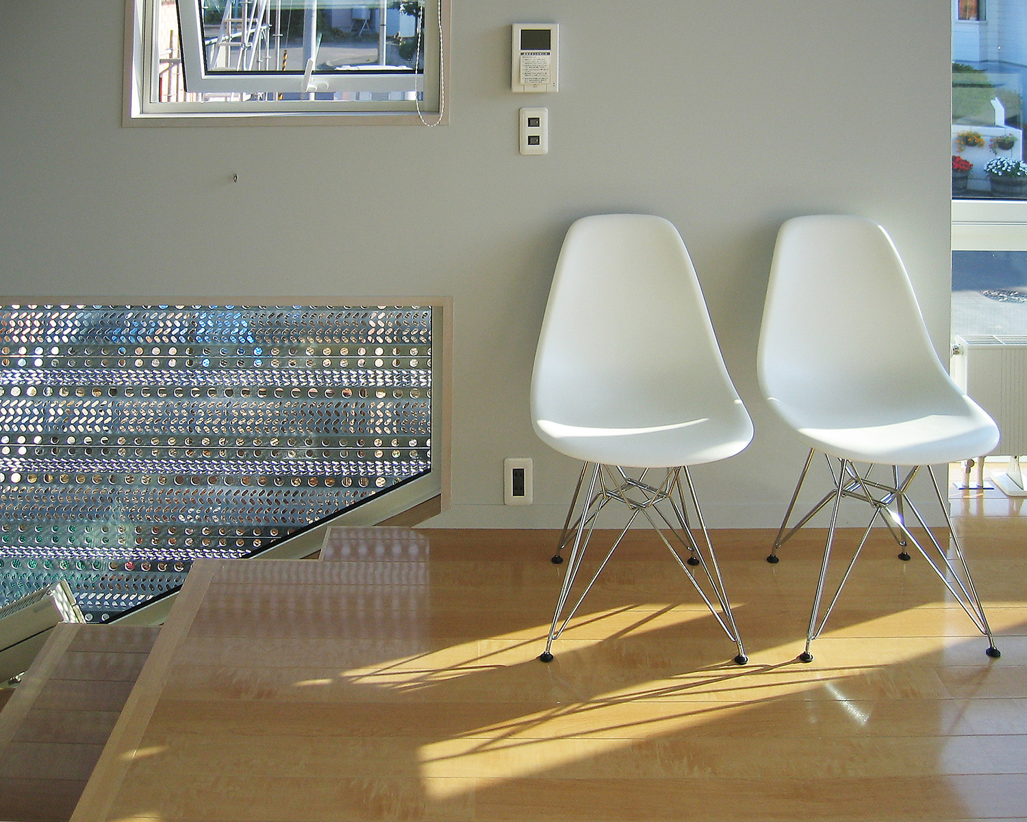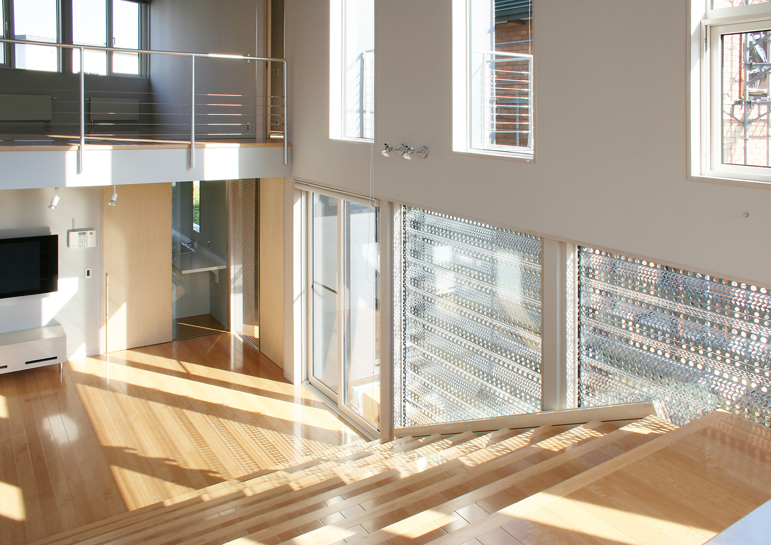 さらに、斜めの床の効果で冬場の太陽高度の低い時期でも南側からの光が部屋の奥まで導くことを実現し、明るい部屋となった。そのうえで、+αの特徴として、本来は風雪を防ぐための機能材である防雪板が開口部に張られている。積雪時に窓を防ぐ効果があるのはもちろんだが、積雪のない時期にはそのパンチング素材により生み出される光と影は時間とともに変化する複雑な日当たりとなり、空間を華やかに彩る効果を意図している。