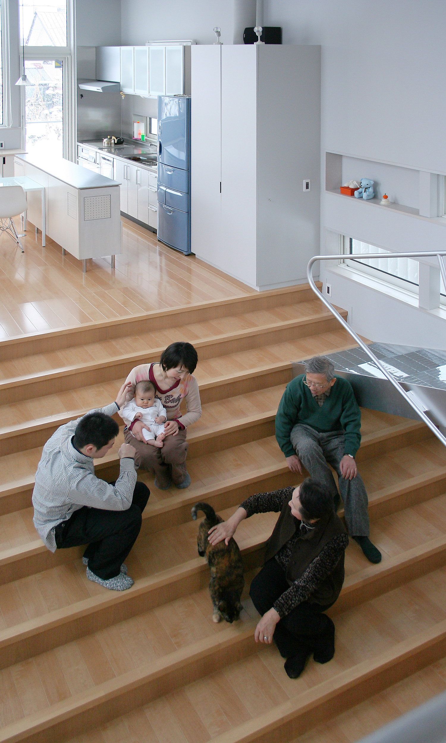 この住宅の最大の特徴は、住宅の既成概念にとらわれないダイナミックな内部空間にある。構成上はスキップフロアとなるが、建物の内部空間はリビングとダイニングそして予備室までがひとつの空間として連続しており、それらは大きな階段で連結されている。大階段の段差はとても緩やかで、階段というよりはむしろフレキシブルに活用できる床として設計しいて、おもいおもいに別々のフロアとして利用できるよう考えられている。また、階段床にはあらかじめ映像設備が配線してあり、プロジェクターを設置して壁に投影すれば階段部分を座席とした大きなシアターにもなる。