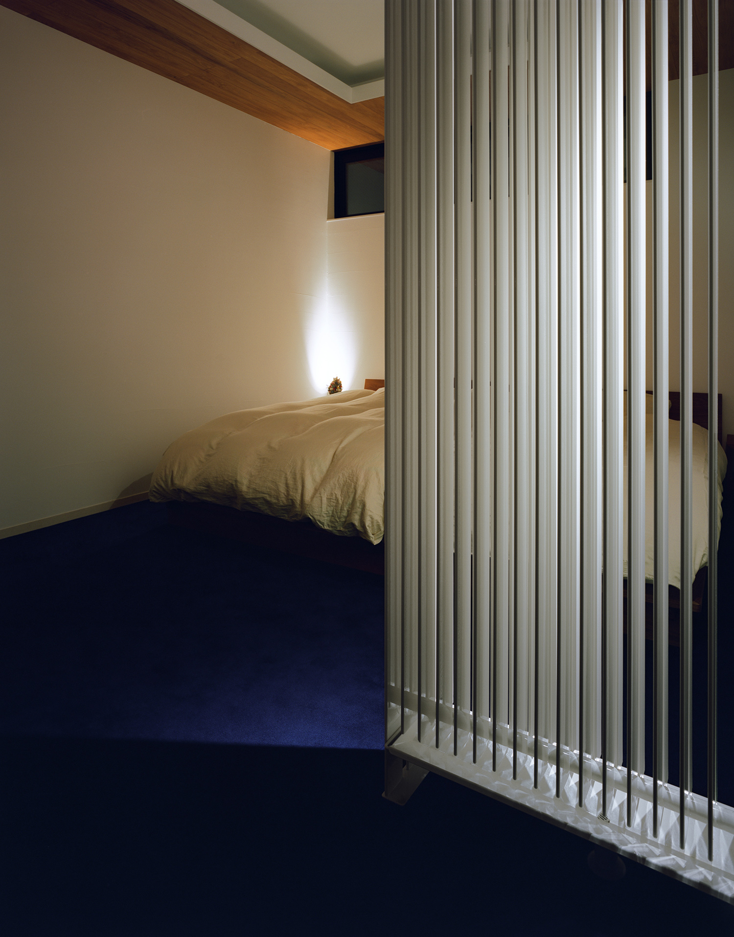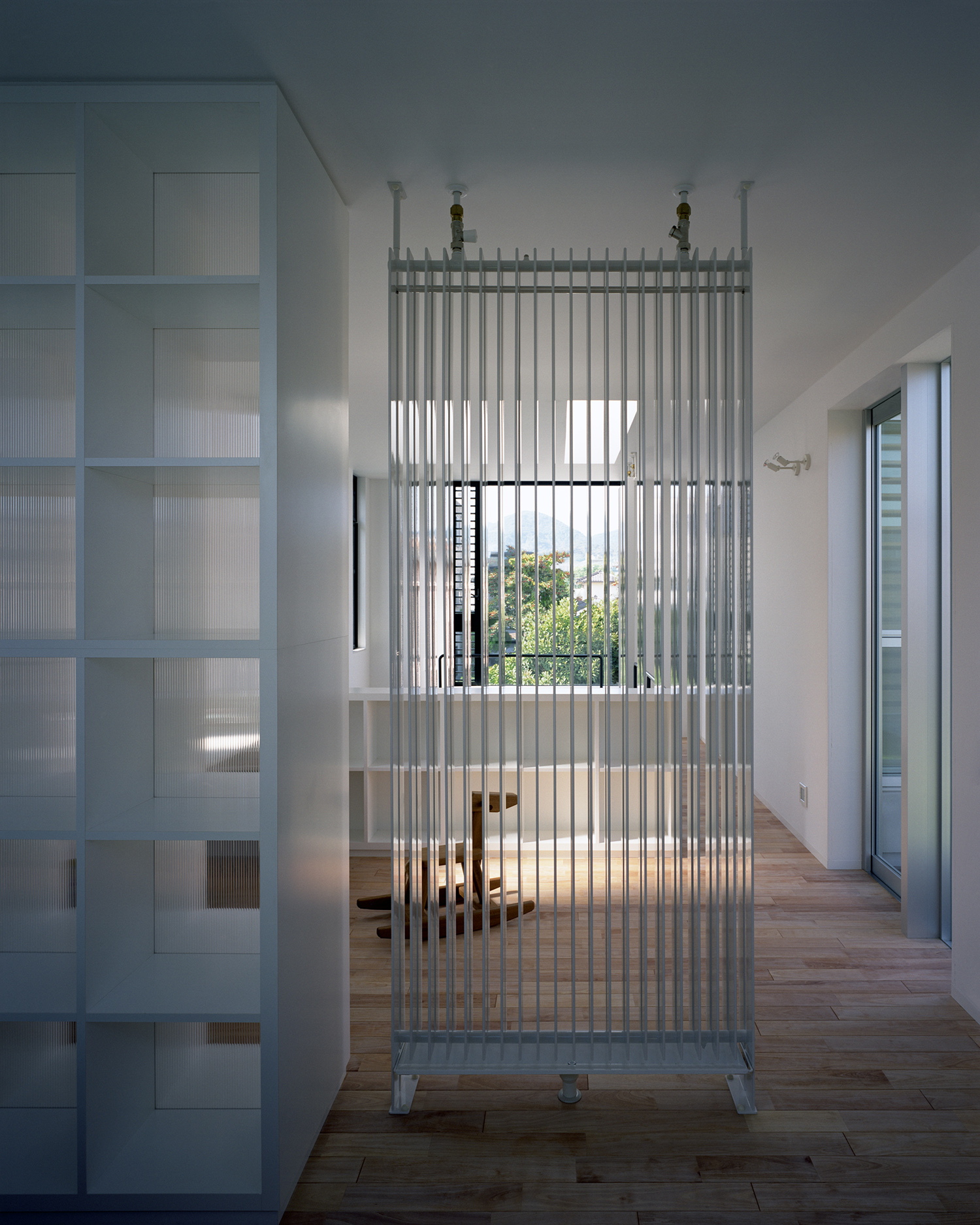 2階芝生テラスを北から見る。ルーバー角度で採光とプライバシーを調整。