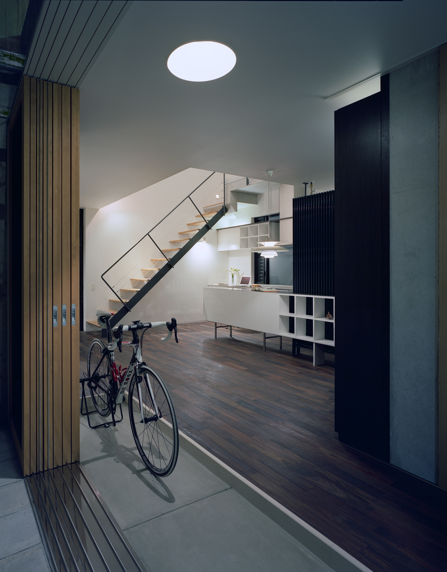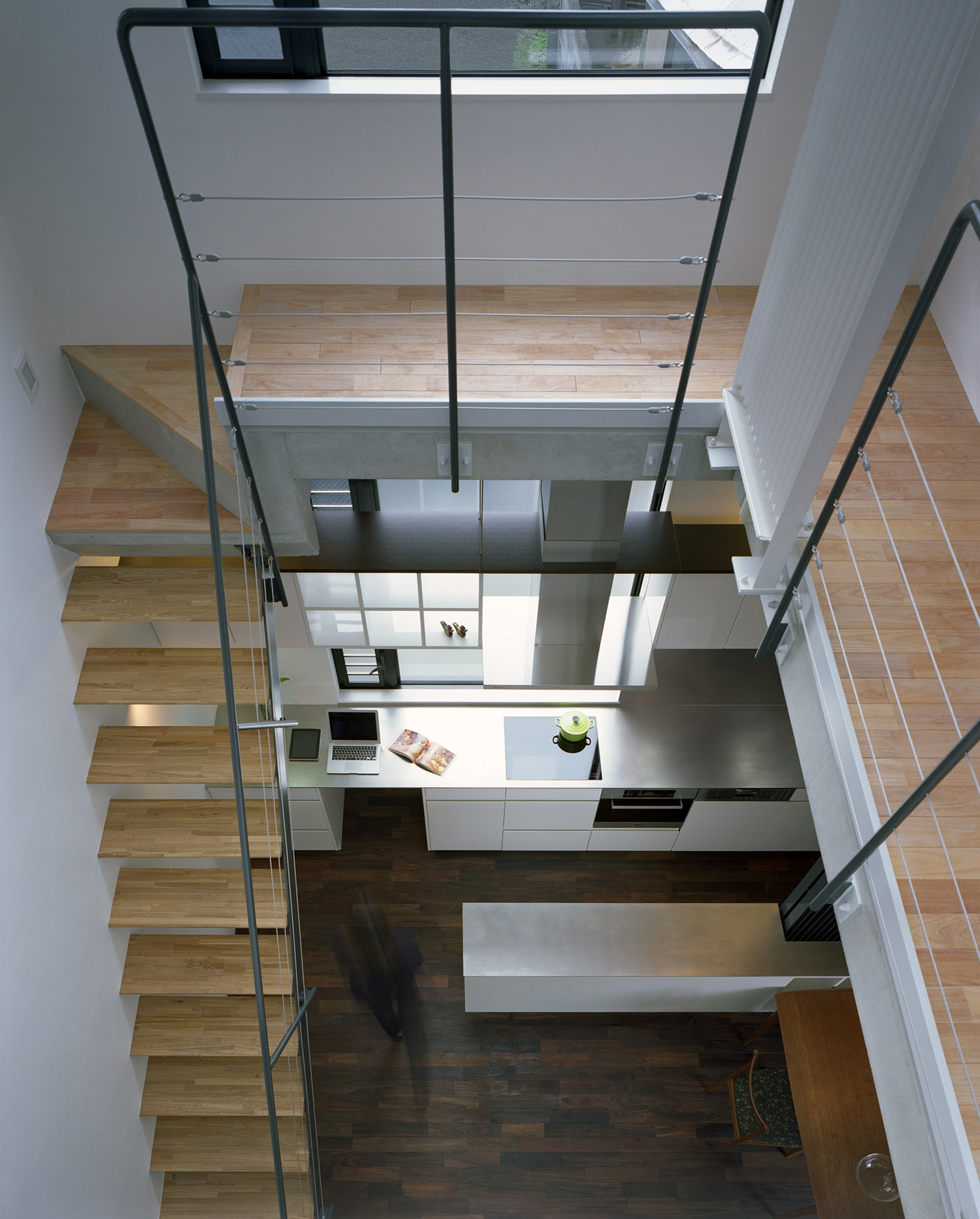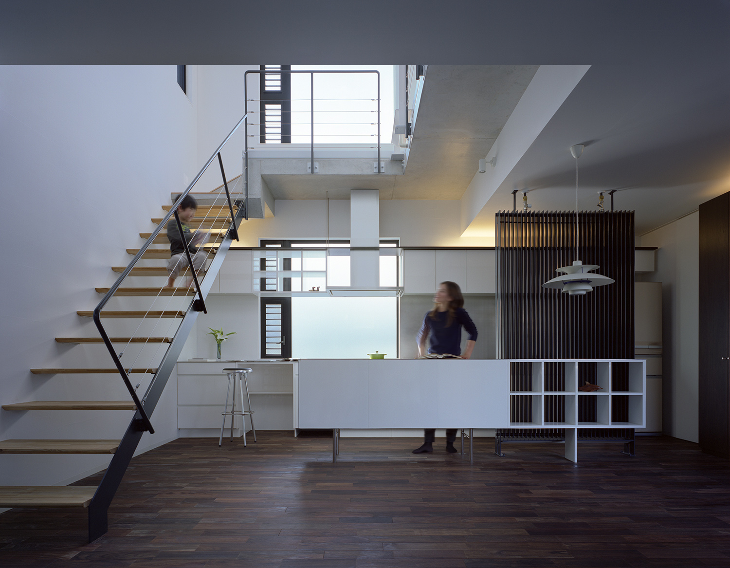 インテリアではエアコンは一台も設置せず、空調設備として家全体にPS設備を完備。大きな気積を有した間仕切りのない快適な空間が可能となった。ひとつながりの空間でありながら、リビングは少しだけ床レベルを下げ開口部を絞ることで落ち着いた雰囲気とする一方、ダイニングは大きなガラス面から光をとりこんだ明るい吹抜空間となっており、場所によって空間の性格を変えている。階段と廊下は吹抜空間を回るようにレイアウト。人の動きをデザインすることで日常生活の中での変化を演出している。床は1階を無垢のウォルナット、2階はチェリーと階によって色味を使い分けている。壁は統一して少しだけグレーを入れたホワイトに調色した内装用の漆喰をコテで塗り、職人の手跡が感じられる上質な仕上げとしている。