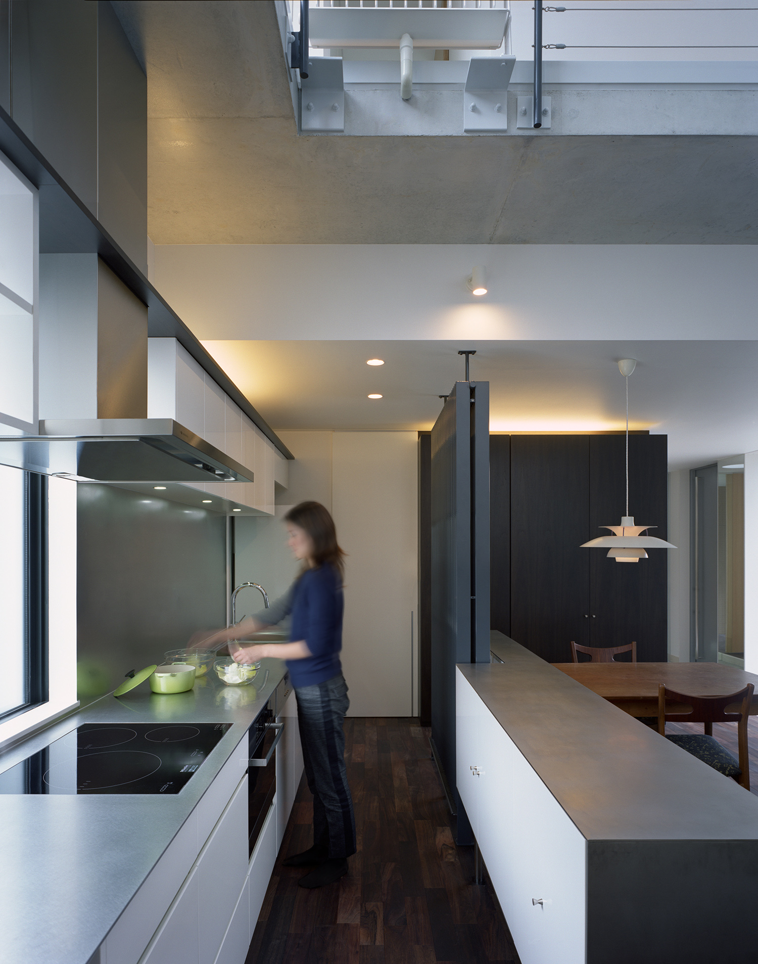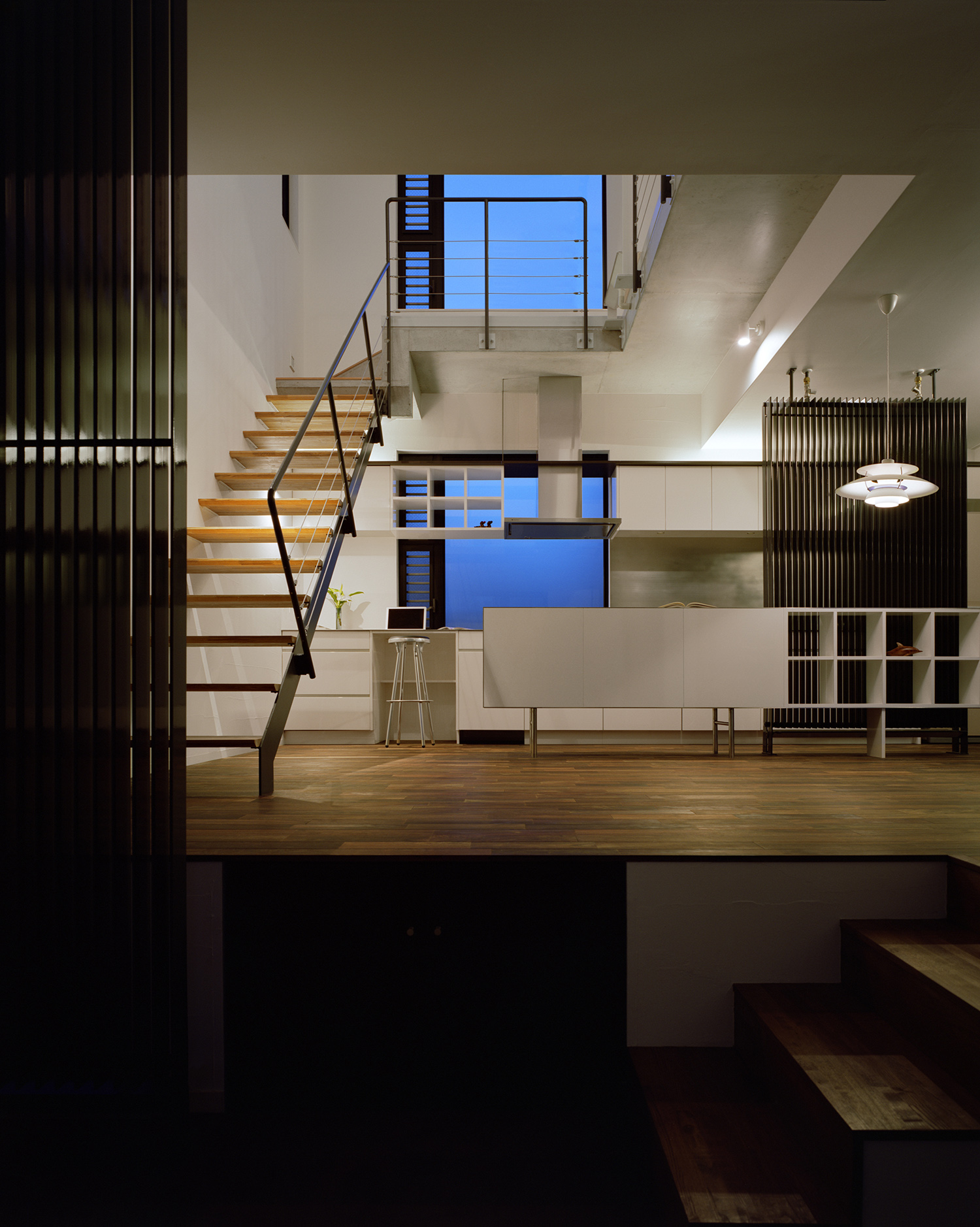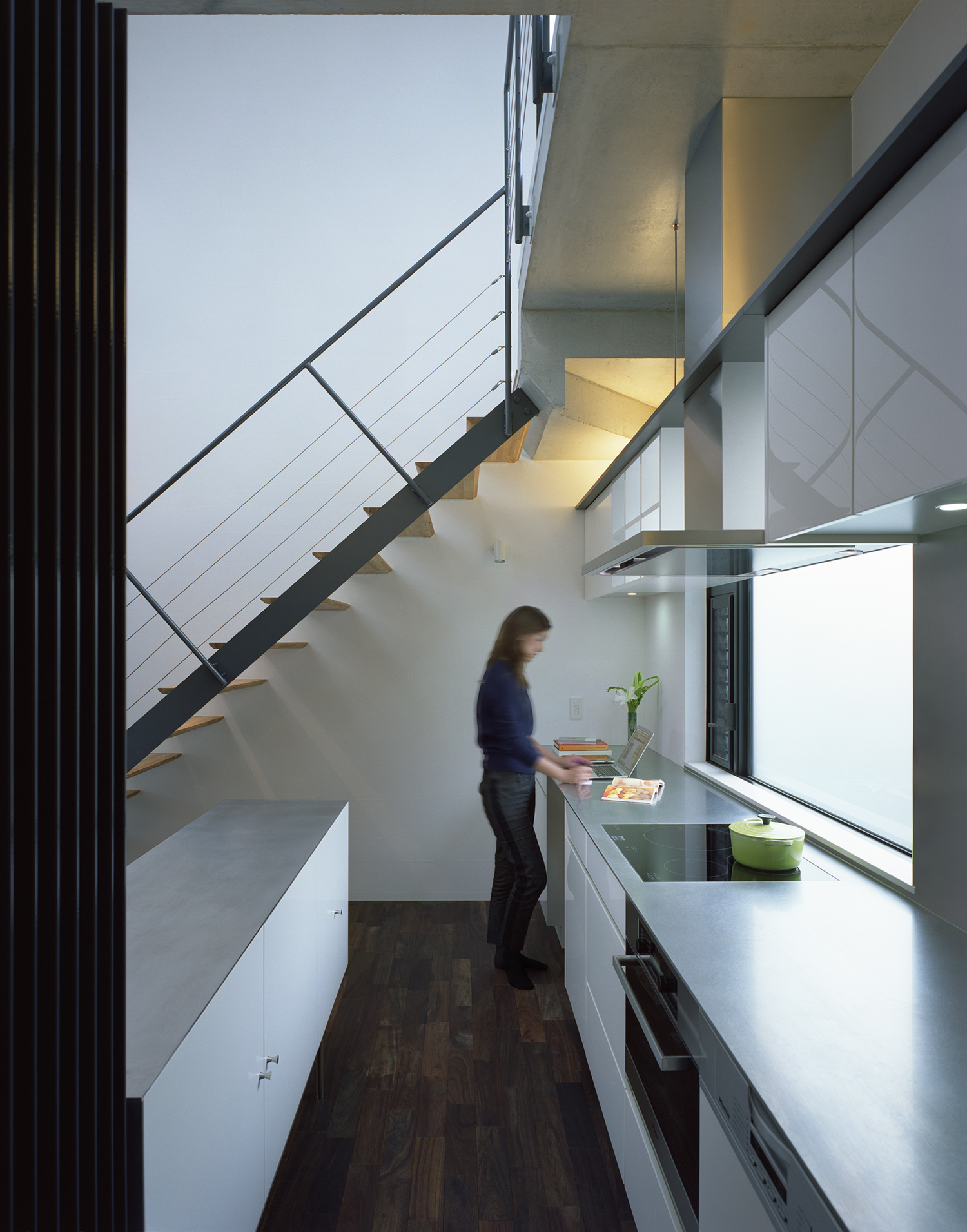 インテリアではエアコンは一台も設置せず、空調設備として家全体にPS設備を完備。大きな気積を有した間仕切りのない快適な空間が可能となった。ひとつながりの空間でありながら、リビングは少しだけ床レベルを下げ開口部を絞ることで落ち着いた雰囲気とする一方、ダイニングは大きなガラス面から光をとりこんだ明るい吹抜空間となっており、場所によって空間の性格を変えている。階段と廊下は吹抜空間を回るようにレイアウト。人の動きをデザインすることで日常生活の中での変化を演出している。床は1階を無垢のウォルナット、2階はチェリーと階によって色味を使い分けている。壁は統一して少しだけグレーを入れたホワイトに調色した内装用の漆喰をコテで塗り、職人の手跡が感じられる上質な仕上げとしている。
