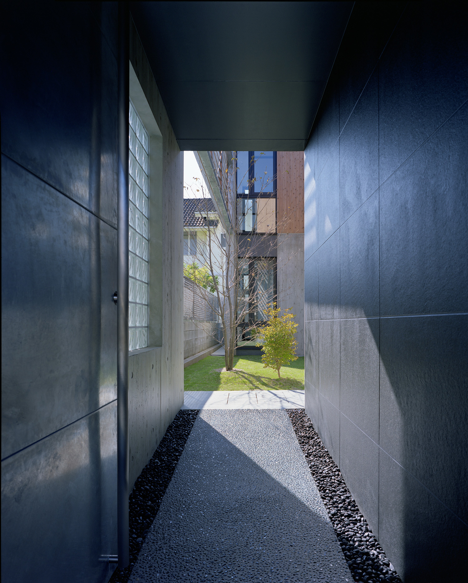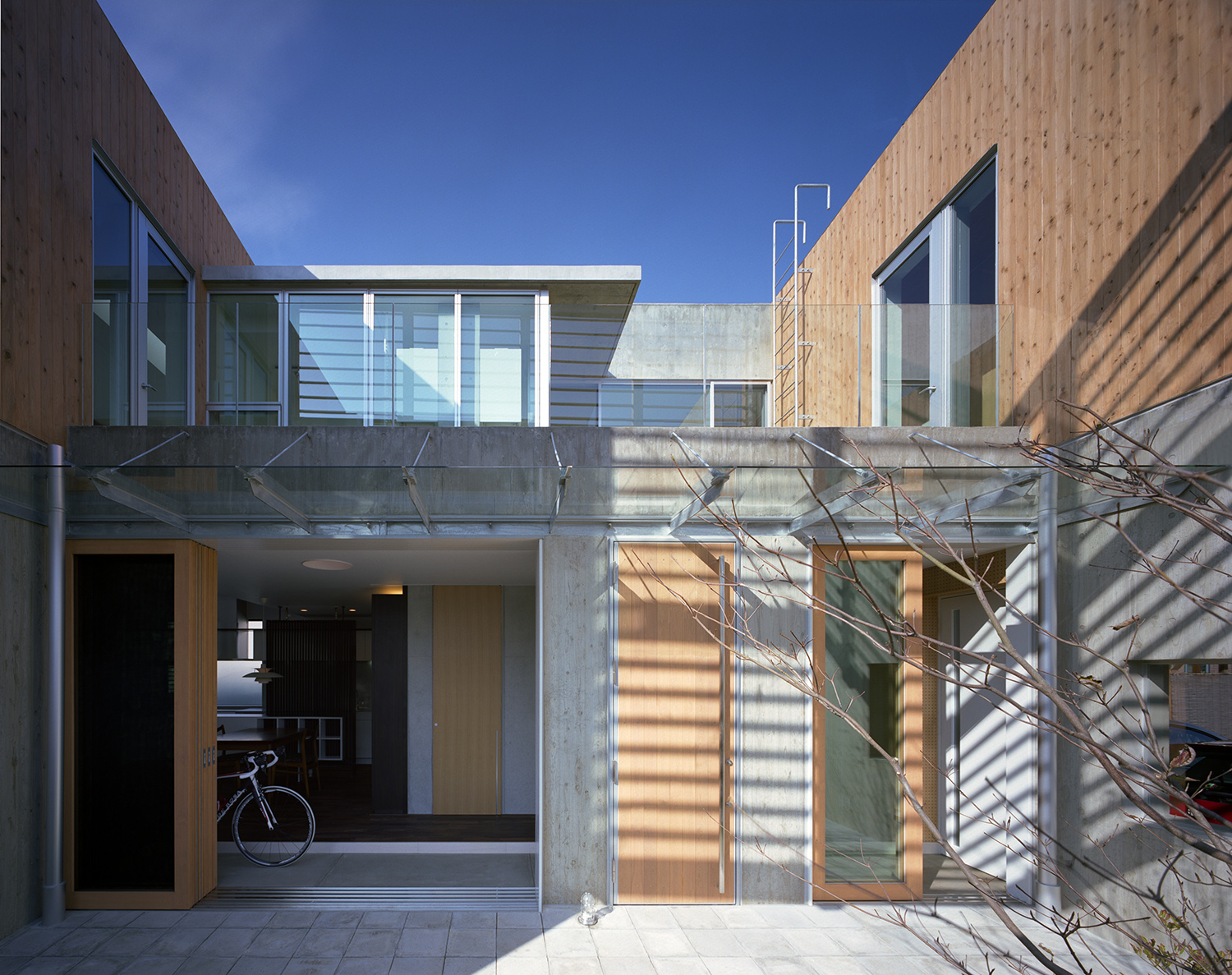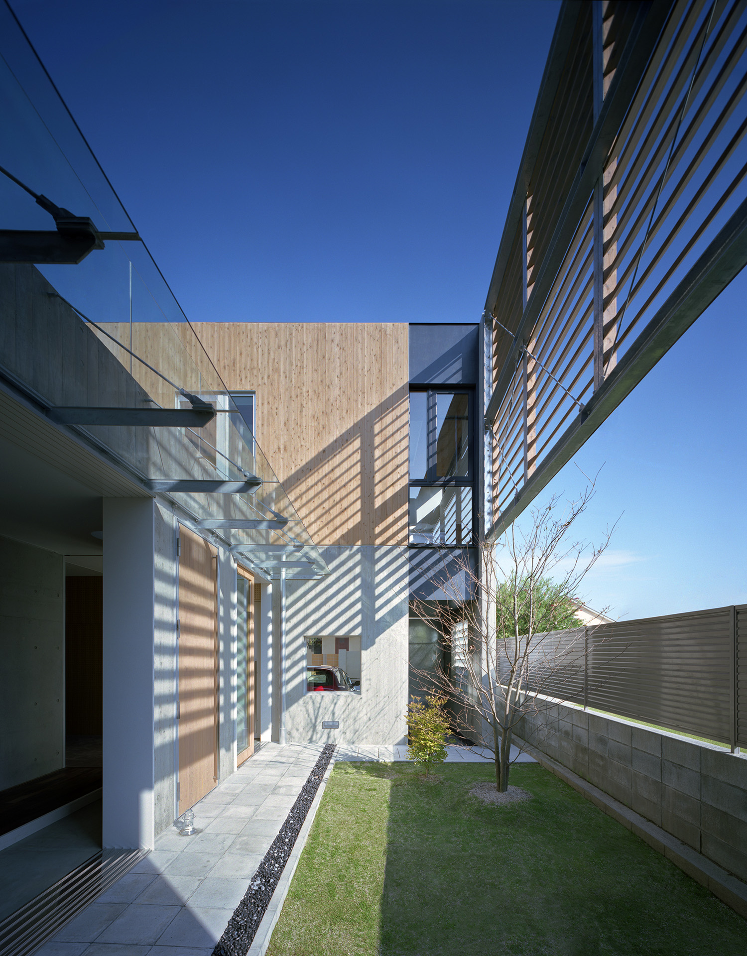 中庭よりアプローチを見る。杉板仕上げと杉板コンクリート打放し壁の仕上げを使い分けている。ルーバーの陰が彩る。