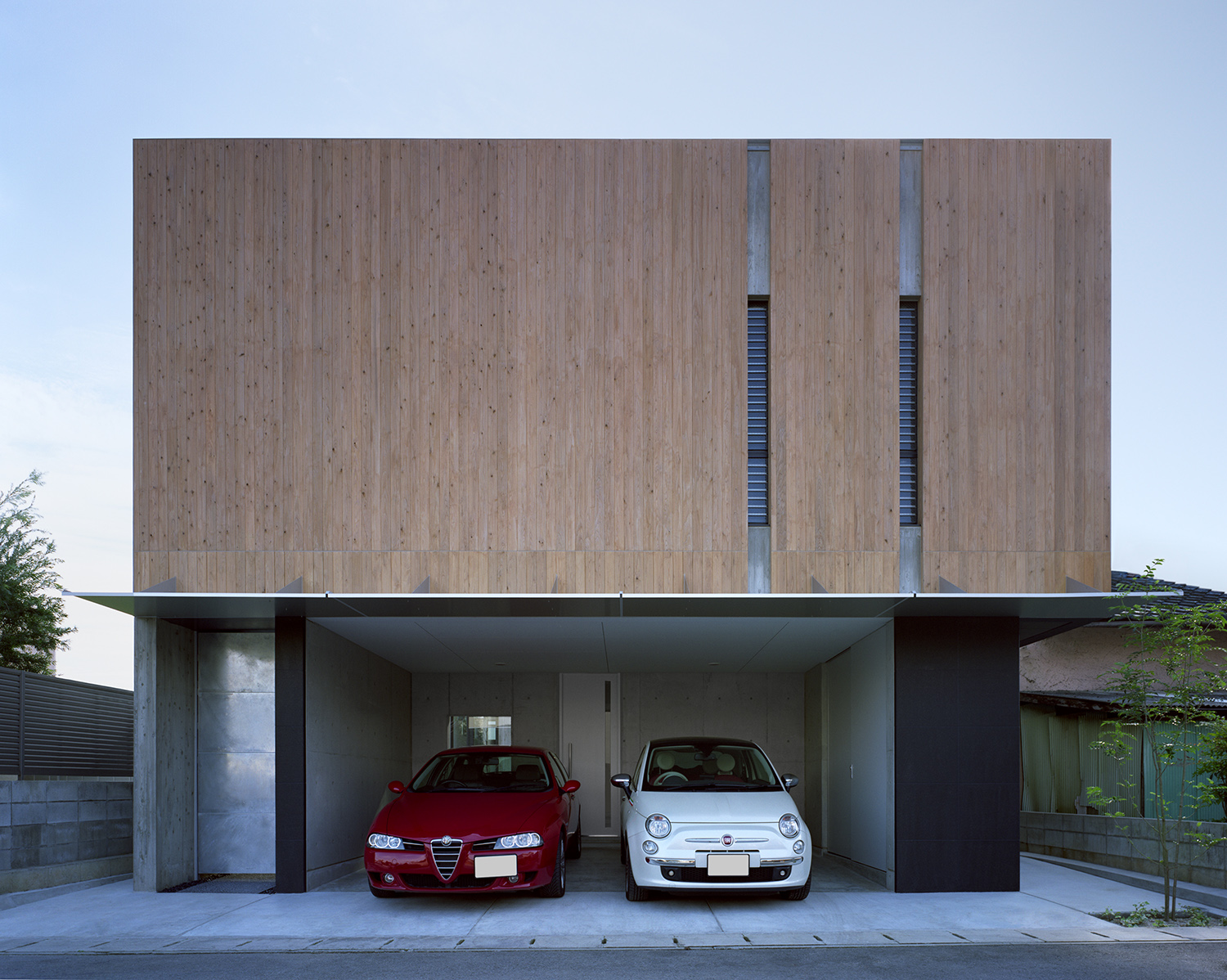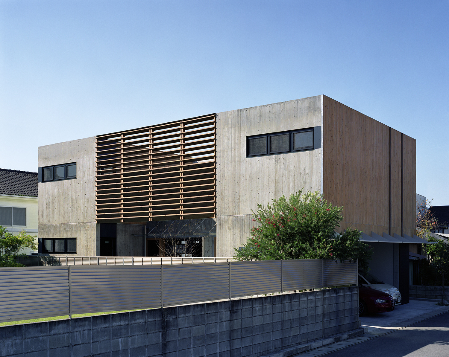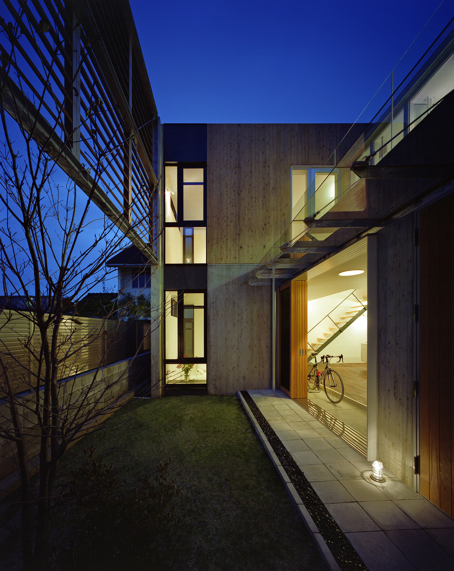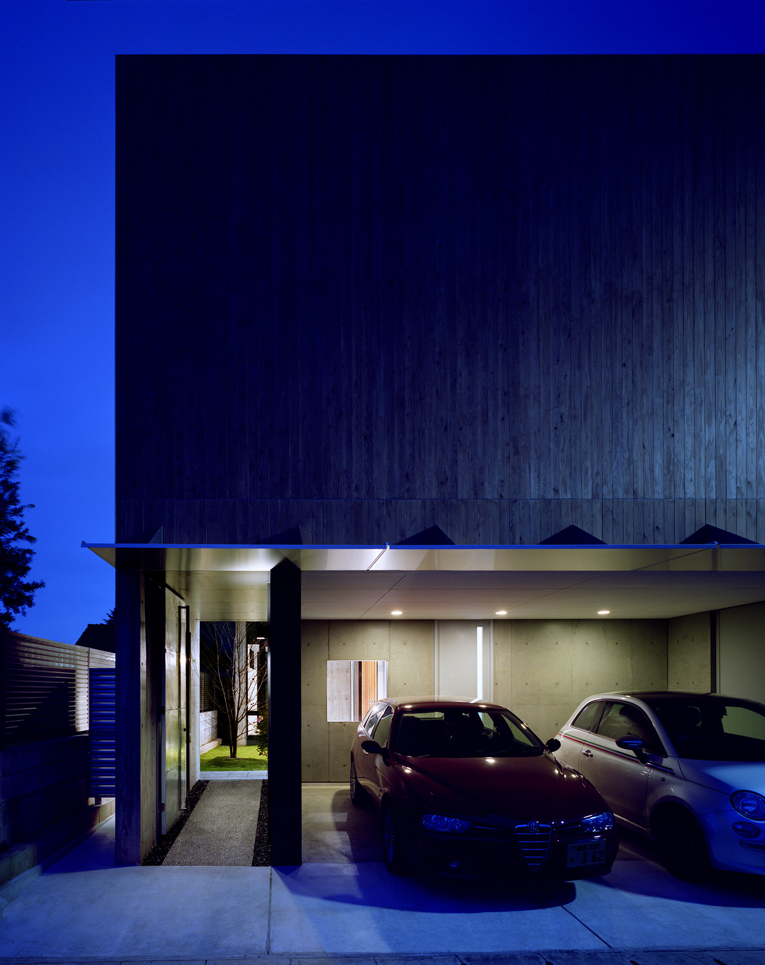 中庭よりアプローチを見る。杉板仕上げと杉板コンクリート打放し壁の仕上げを使い分けている。ルーバーの陰が彩る。