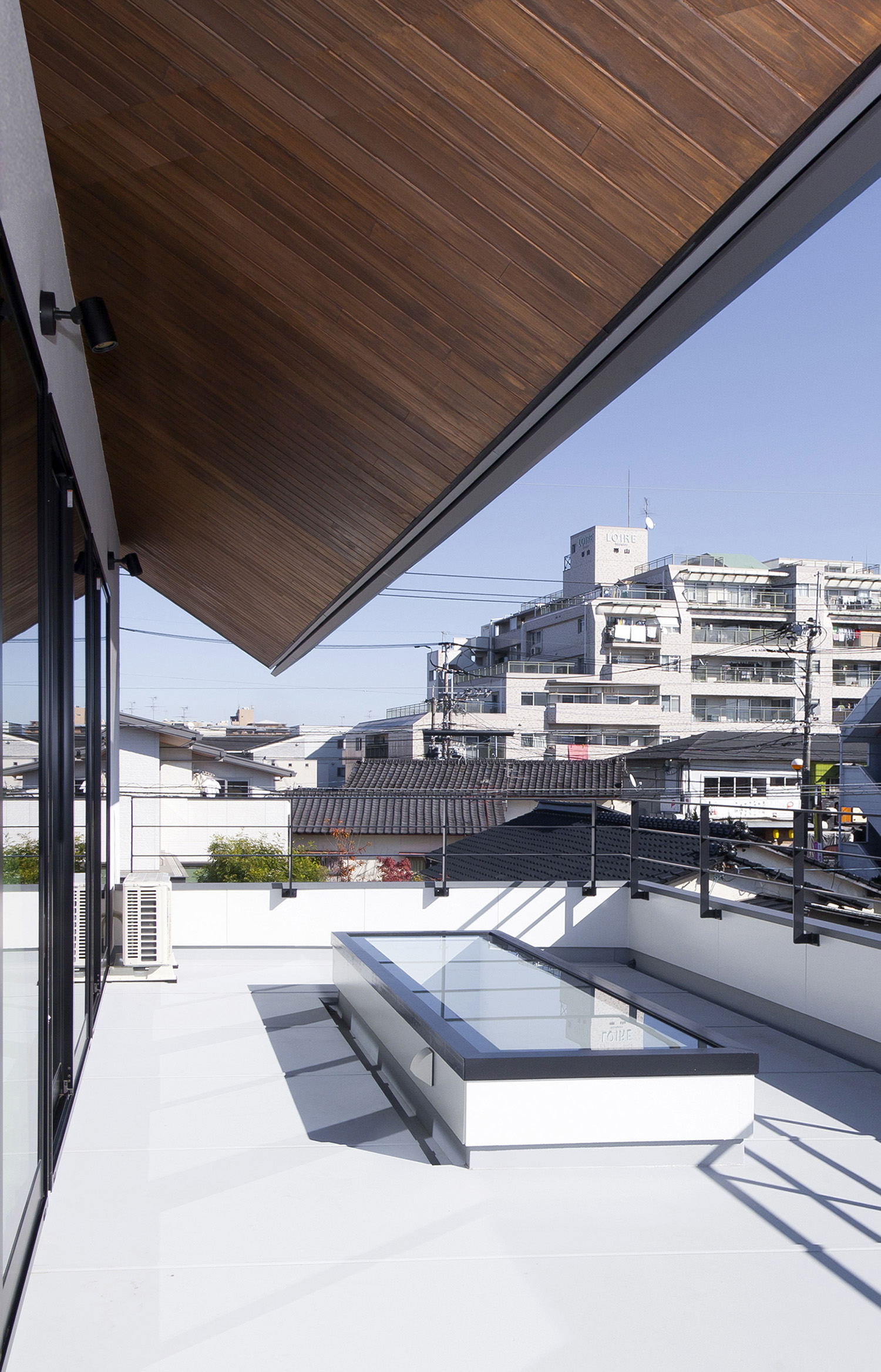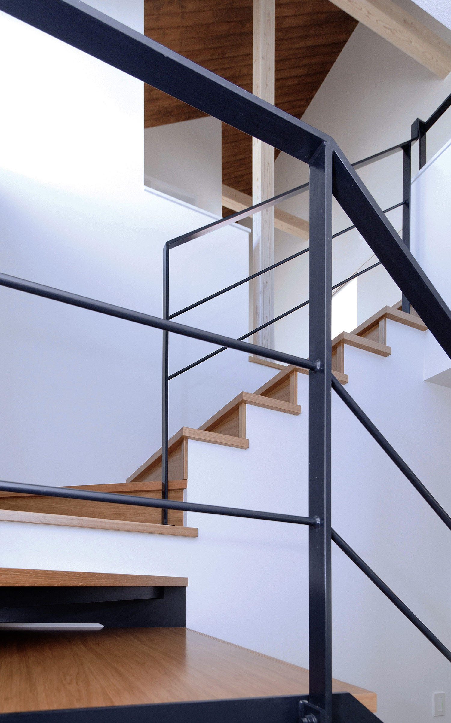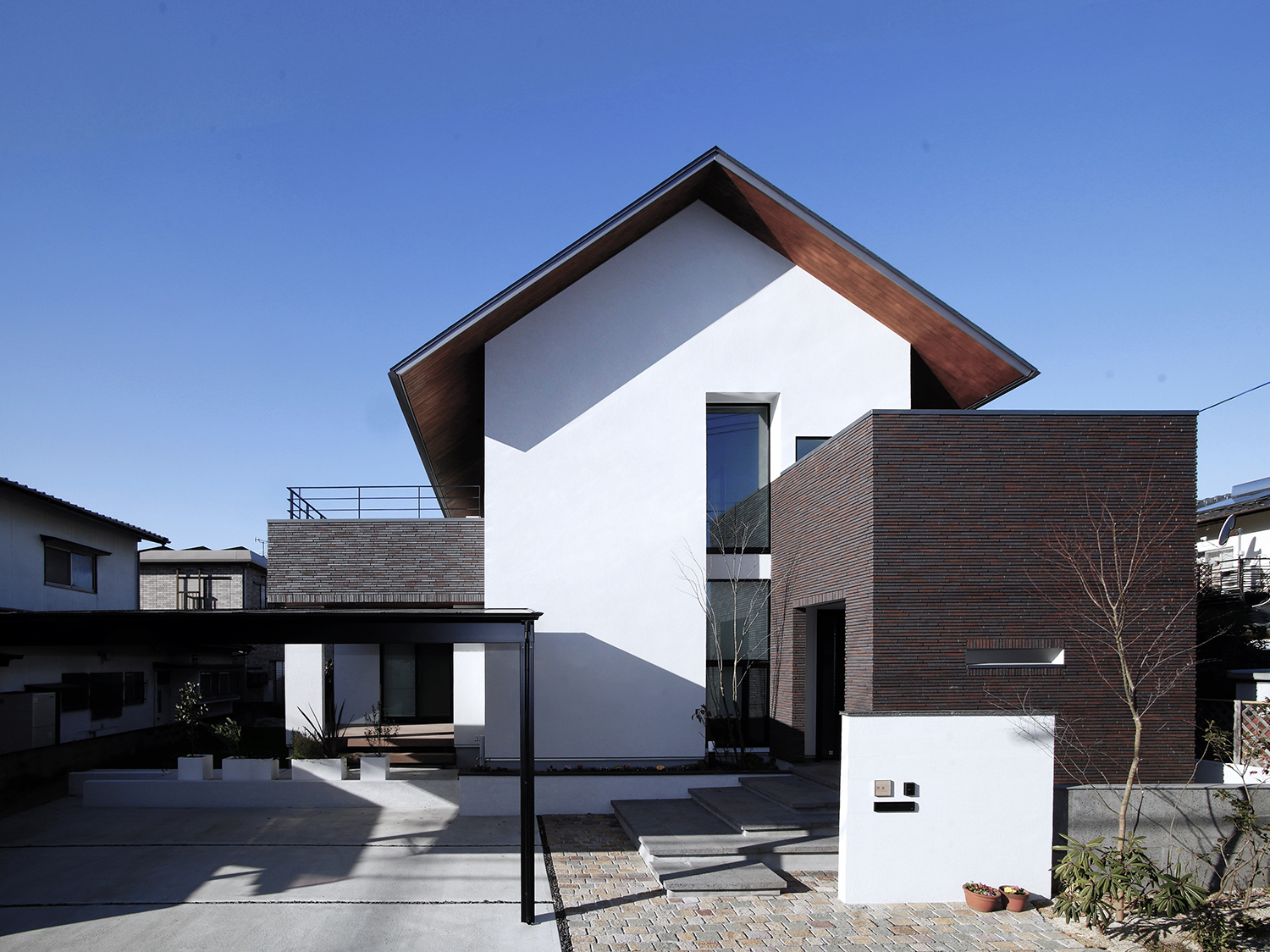 建物外観は、勾配の大きな切妻屋根とボックス状のボリュームを組み合わせ、軒を大きく張り出したデザインとし、どこか見慣れた雰囲気ながらも落ち着いたモダンな印象となるよう意図している。屋根はその大きさゆえに重たい印象とならないようディテールを検討。雨樋との寸法関係に注意しながら軒先を薄く納めている。切妻屋根部分の外壁はモルタルでフラットに仕上げ、しっくい塗り風の白い塗装とし、ボックス状部分の外壁はタイル貼りとし、目地底が深く荒いガサガサとしたレンガイメージのテクスチャで濃い赤茶色のタイルをセレクト。外壁の仕上げの対比を際立たせている。