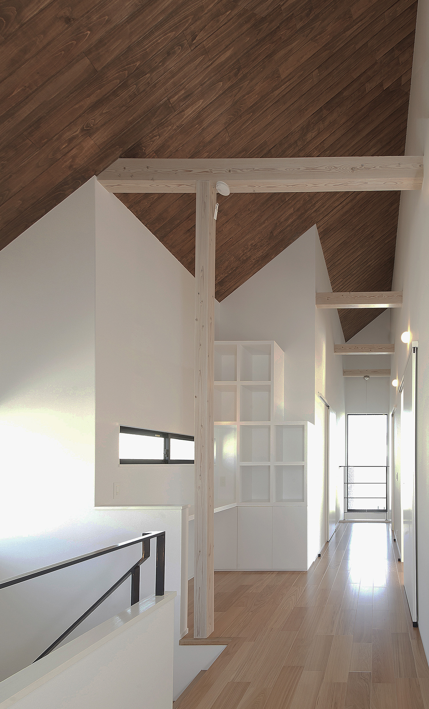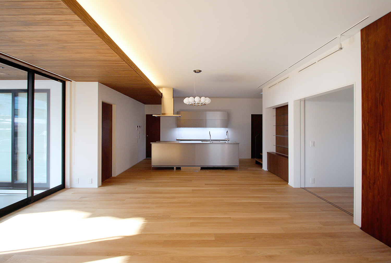 エントランスは正面の壁一面をライムストーンという上品な色合いの石で仕上げている。壁面には間接照明を仕込んだニッチをもうけ、エントランスの照明としている。メインのリビングダイニングキッチン空間はひとつながりの水平に繋がる空間で、南側にはアウトドアリビングとしてのピロティ空間が広がっている。ピロティまでつながっている板張りの天井は、その段差部分に間接照明が仕込まれ印象的な照明計画としている。また、部分的に吹き抜けをもうけ縦方向にも空間が広がっている。吹抜上部には屋根の形状を反映させた板貼りの傾斜天井が覗き広がりを演出している。