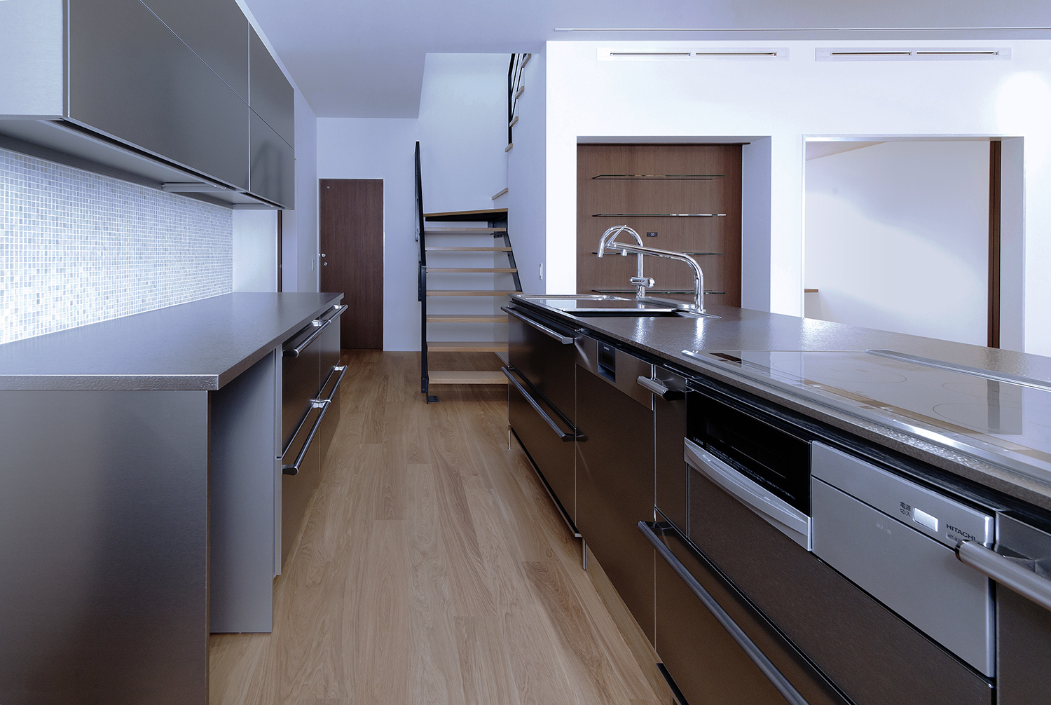 オープンキッチン。ワンポイントに光沢のあるモザイクタイルが貼られる。