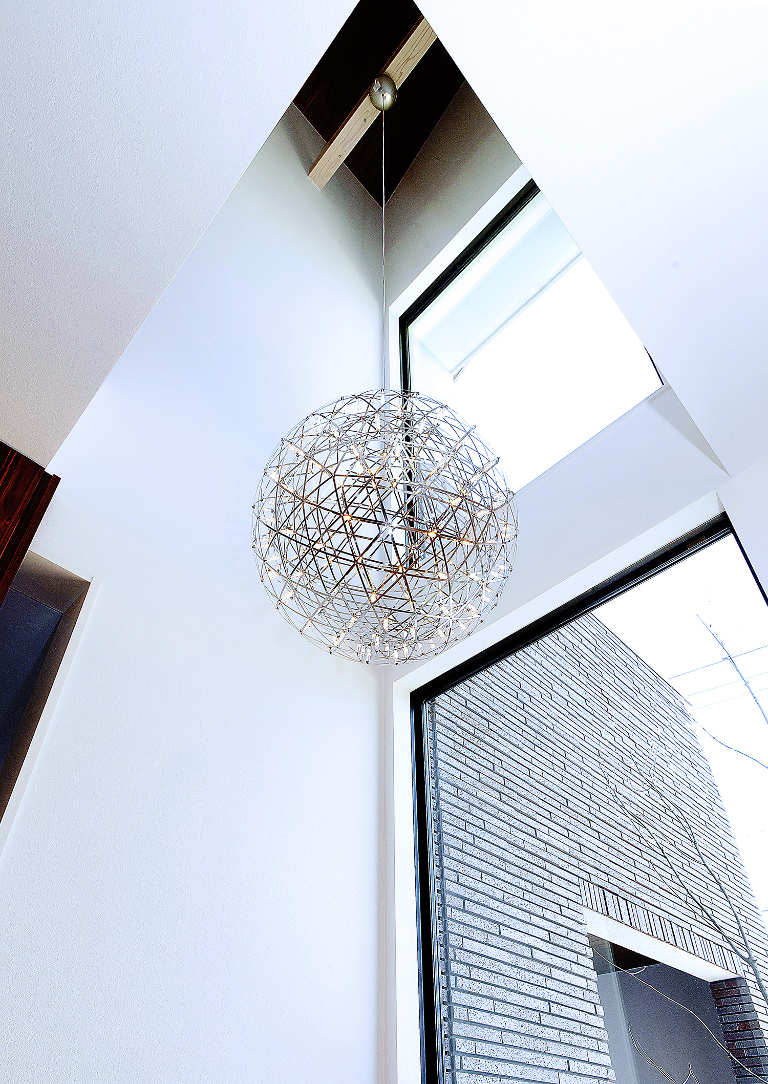 吹き抜けに吊される照明(mooiレイモンドR61)。