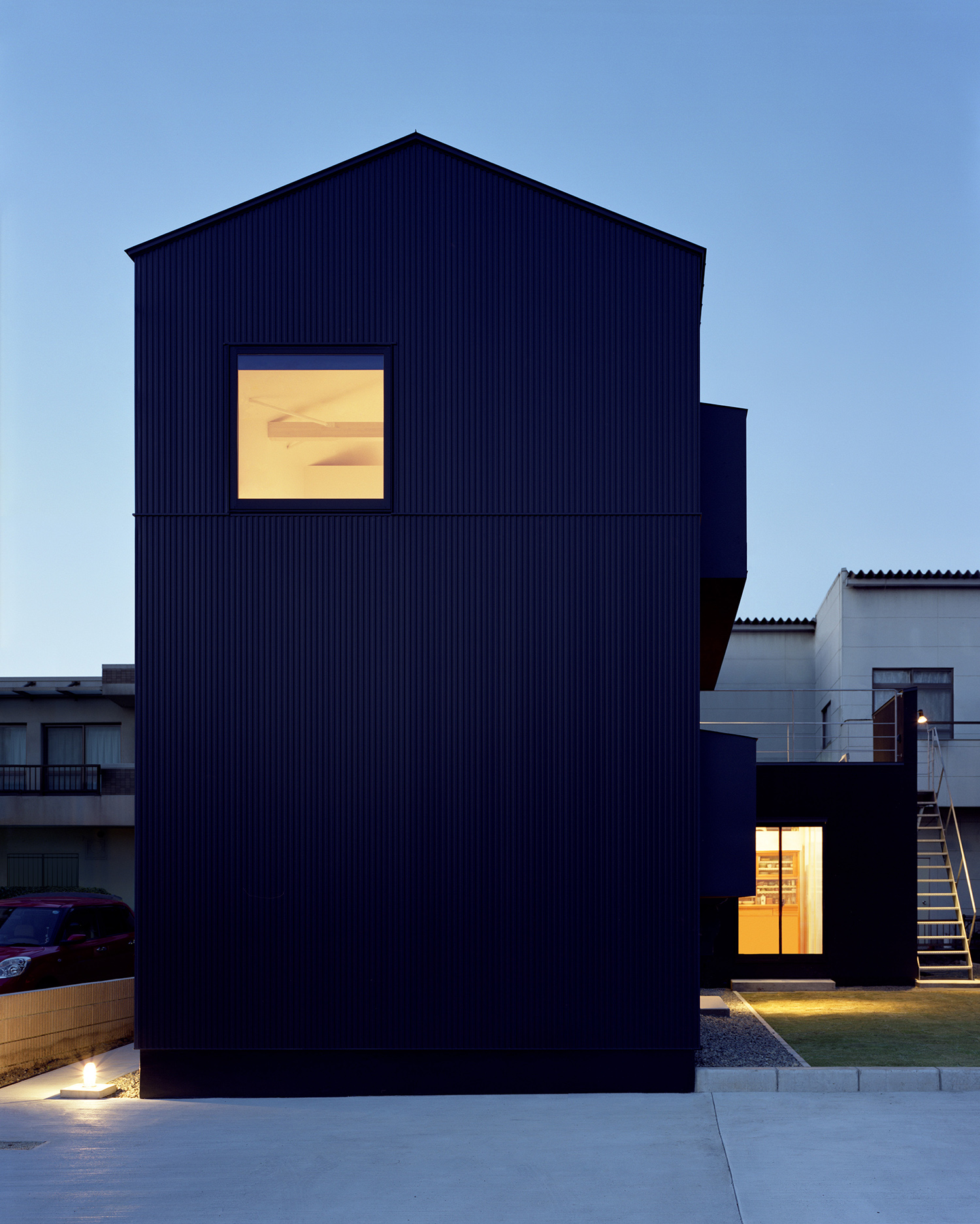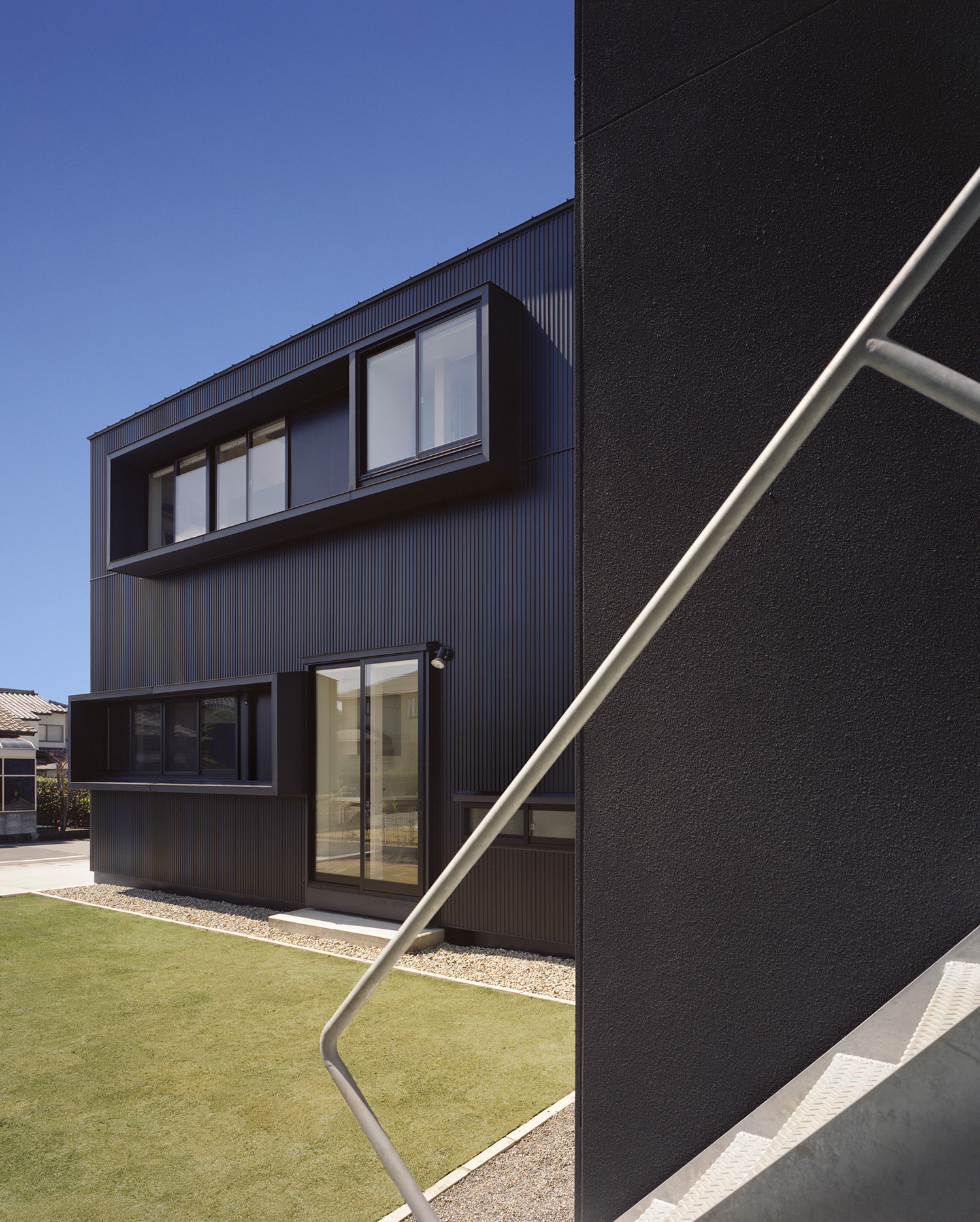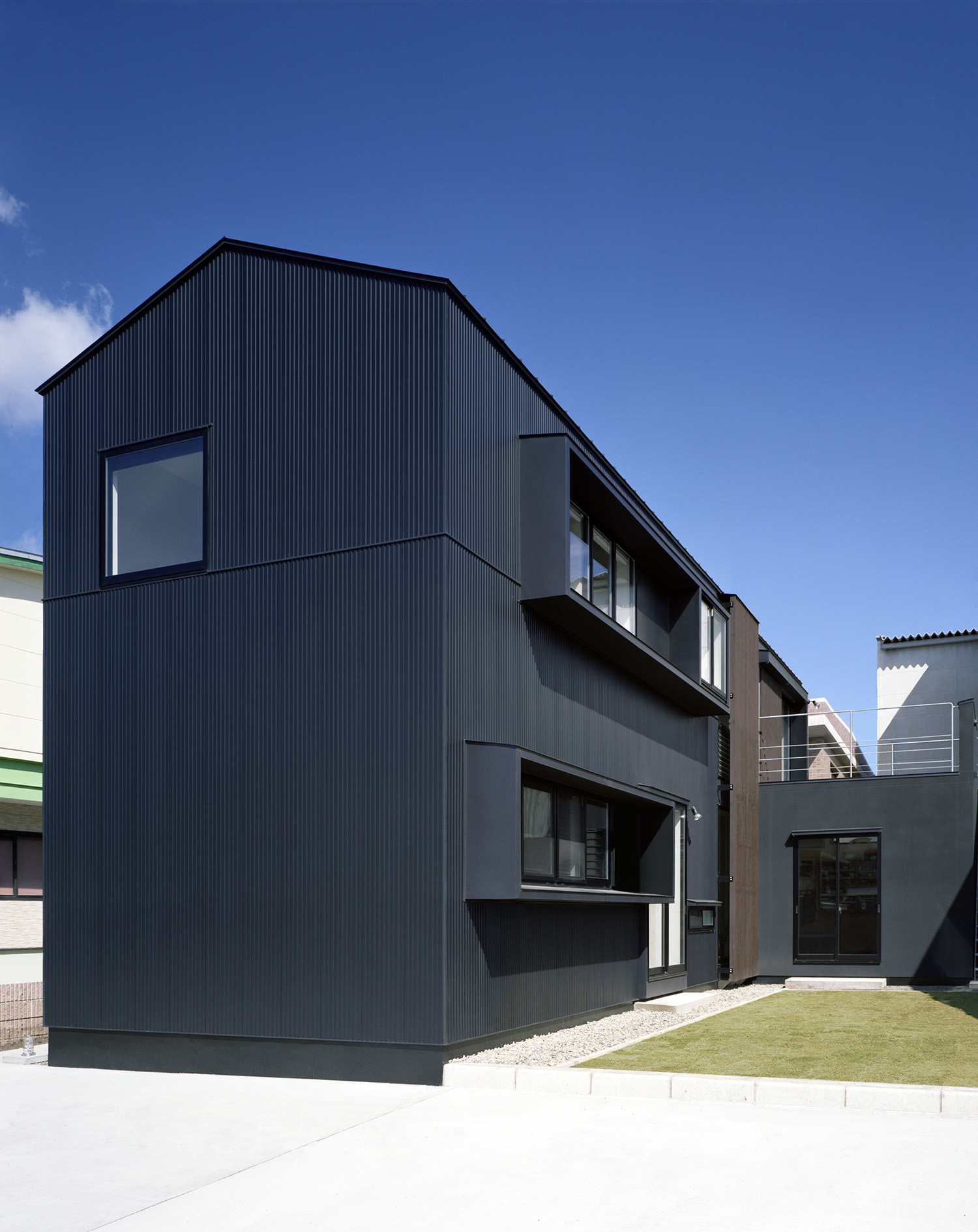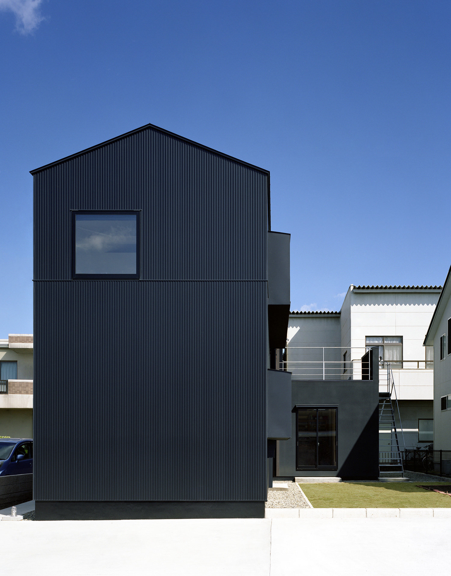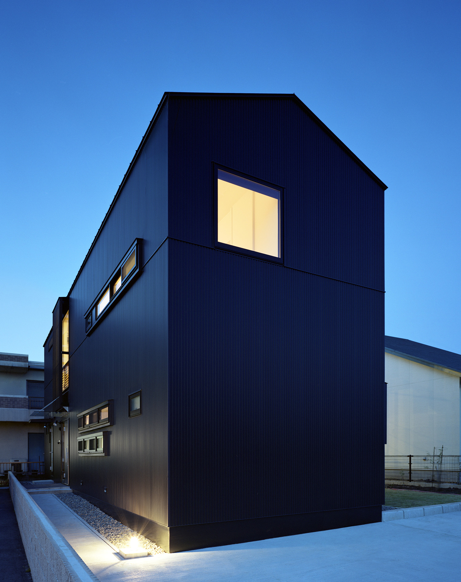 外観は黒のガルバリウム鋼板でまとめられ、デザイン的に軒を切り落としたディテールの三角屋根としてモダンにアレンジしている。道路に面した切妻には極力開口部をなくし、ワンポイントの正方形窓をレイアウトしている。