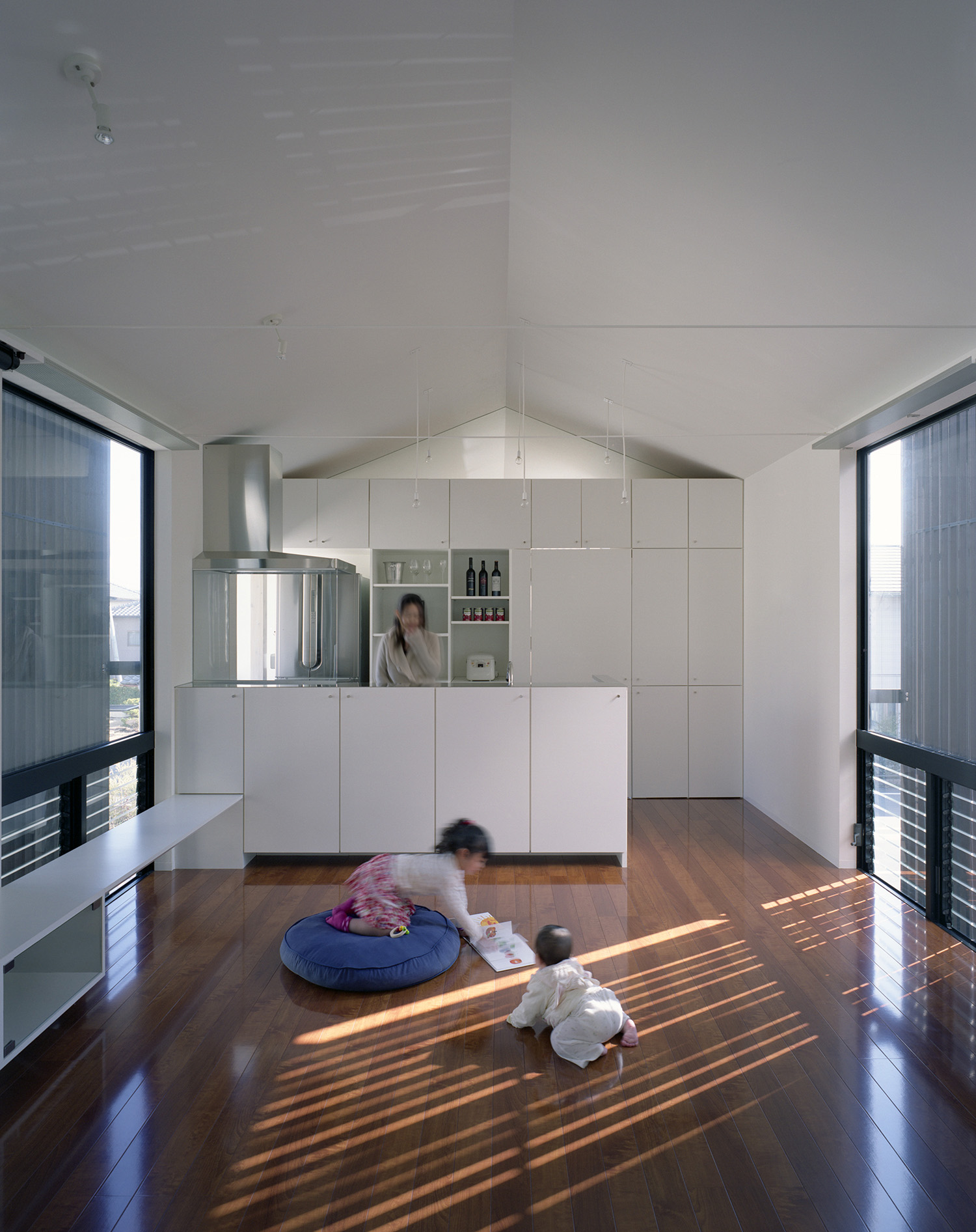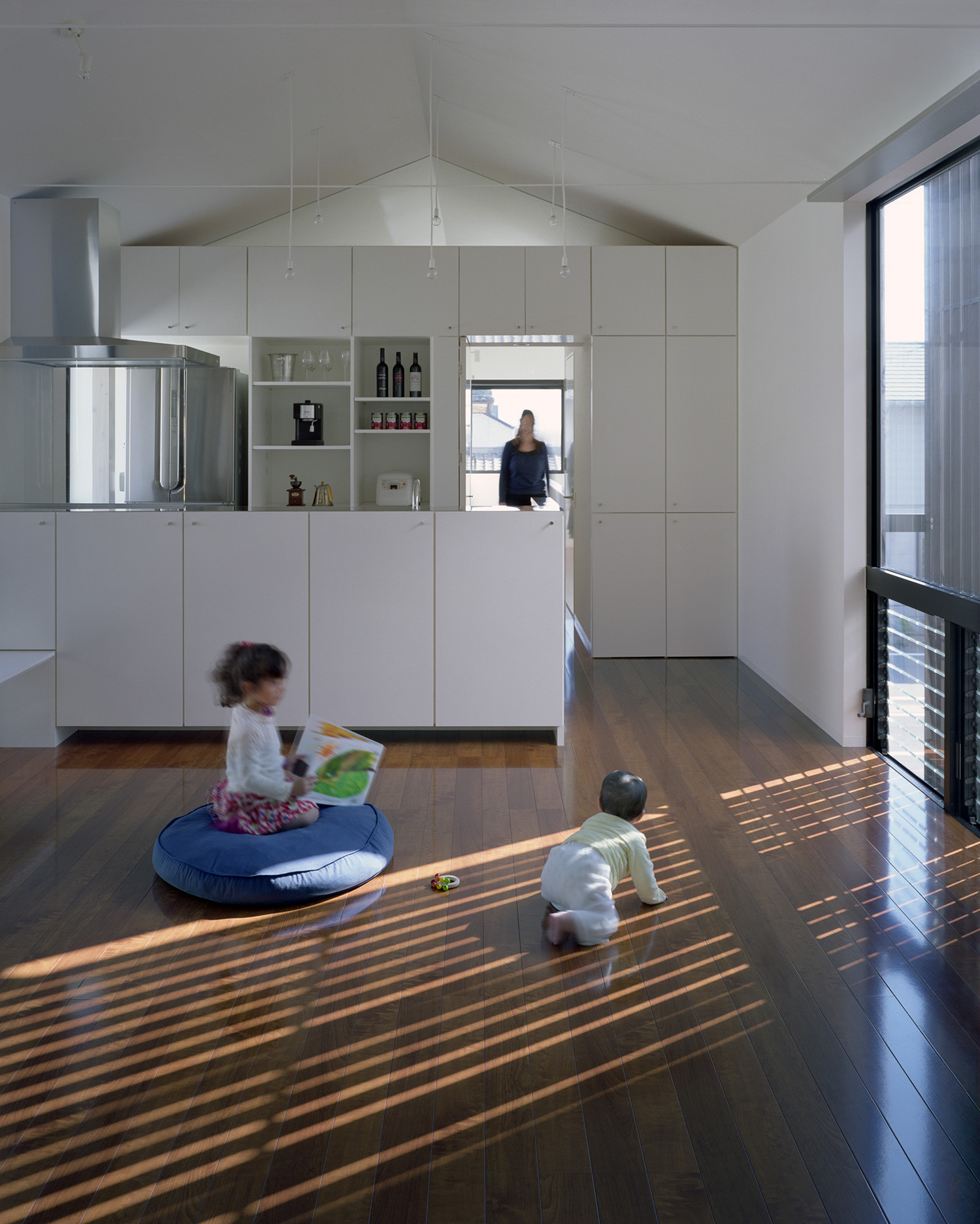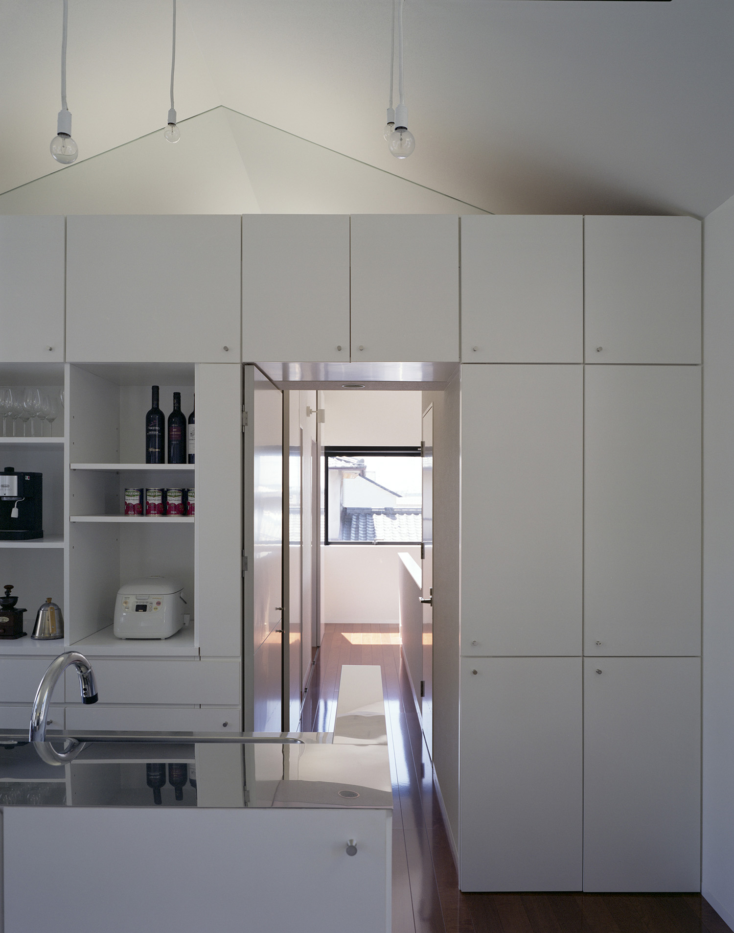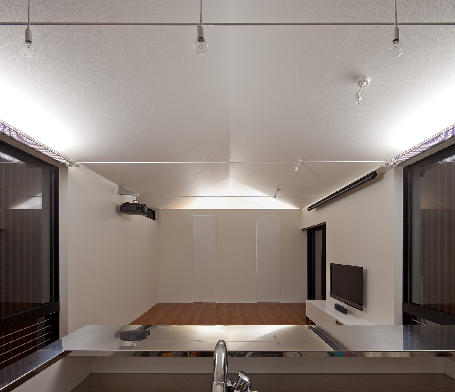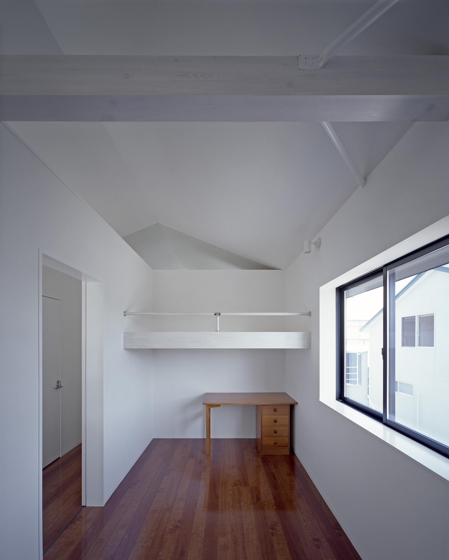 メインとなる子世帯のビングダイニングは2Fにレイアウトされている。建物の長さを生かした平面となっており、特徴的な三角屋根の形状はそのまま2階の各室をつなぐよう内部に現れている。山形の天井が2階空間全体をつないで空間を広く確保し視線の抜けを作ることで、コンパクトな住宅ながらも伸びやかな空間をつくっている。