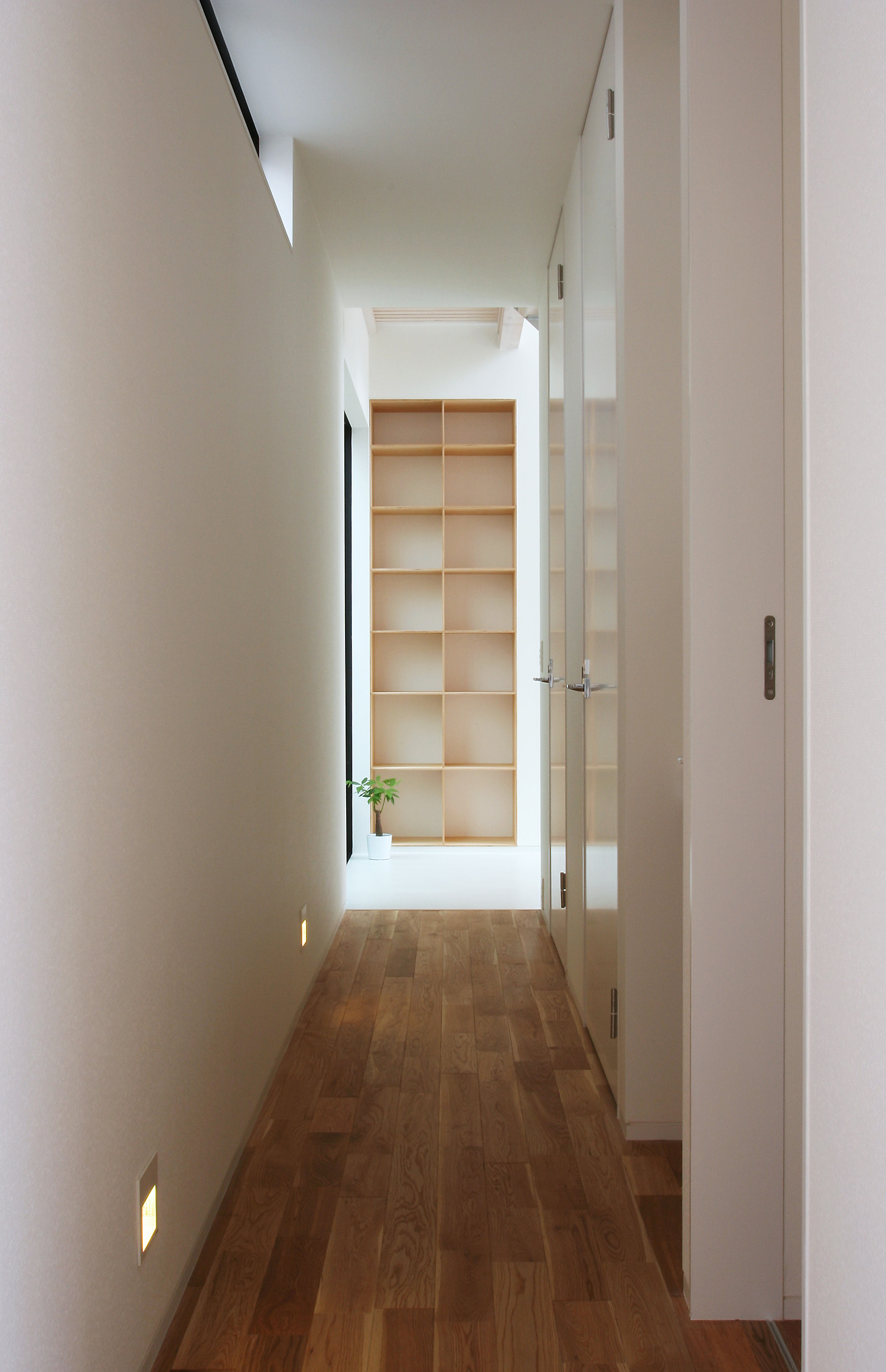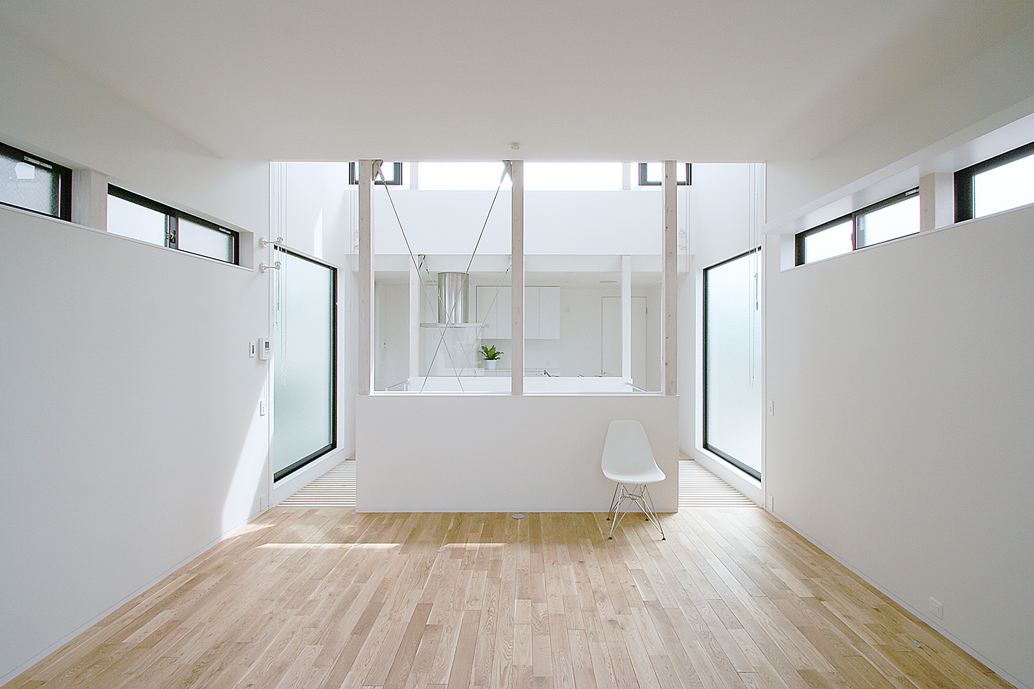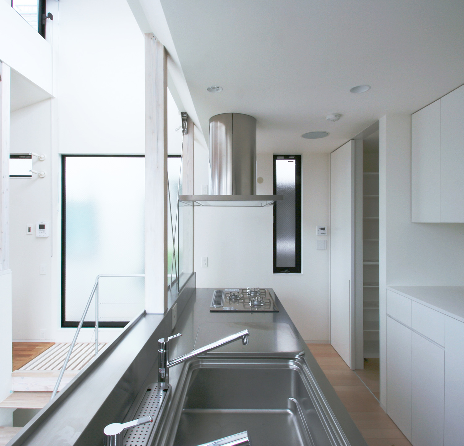 子供室や寝室などの個室は必然的に1階に配置することになるのだが、子供たちが玄関からすぐ自分の部屋に行けてしまうような計画はなるべく避けたい。そこで、玄関から常に光の井戸である吹抜ホールを通過して個室にアプローチするような配置とし、2階のキッチンを吹抜に面したレイアウトとした。子供たちが帰宅後、吹抜を通る気配をキッチンで感じることができるようになっている。リビングダイニングとキッチンは吹抜けを挟んでいるが、その間に壁はなくひとつの空間の中にあり。キッチンが隔離されるようなことはない。