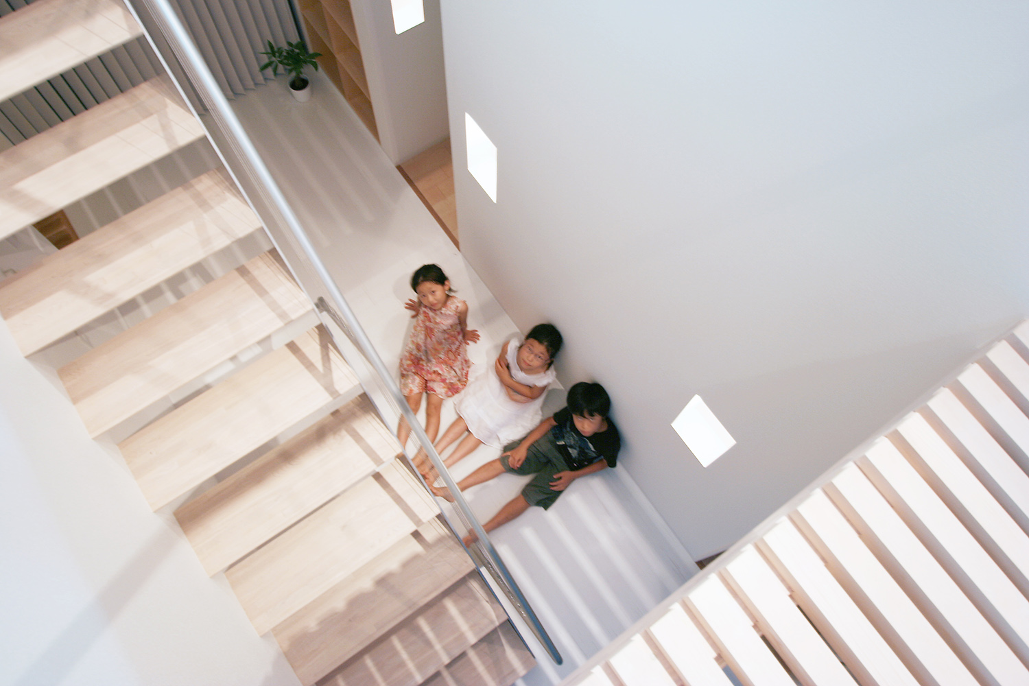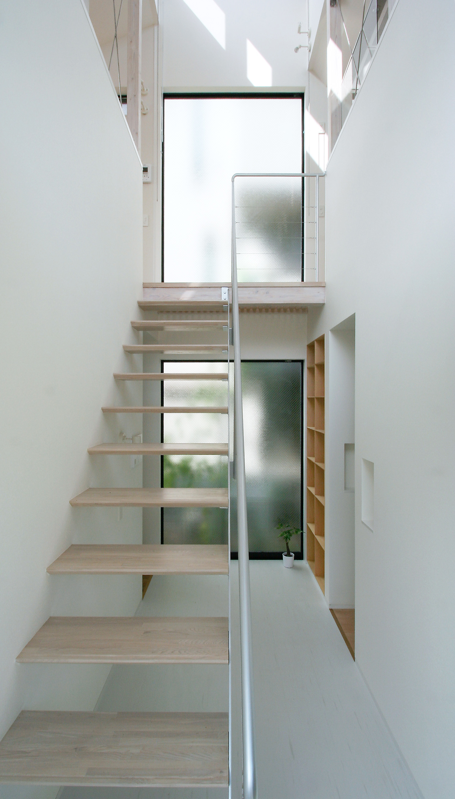 光の井戸となる吹き抜け空間の階段ホール。ハイサイドライトから1階まで自然光を導く。