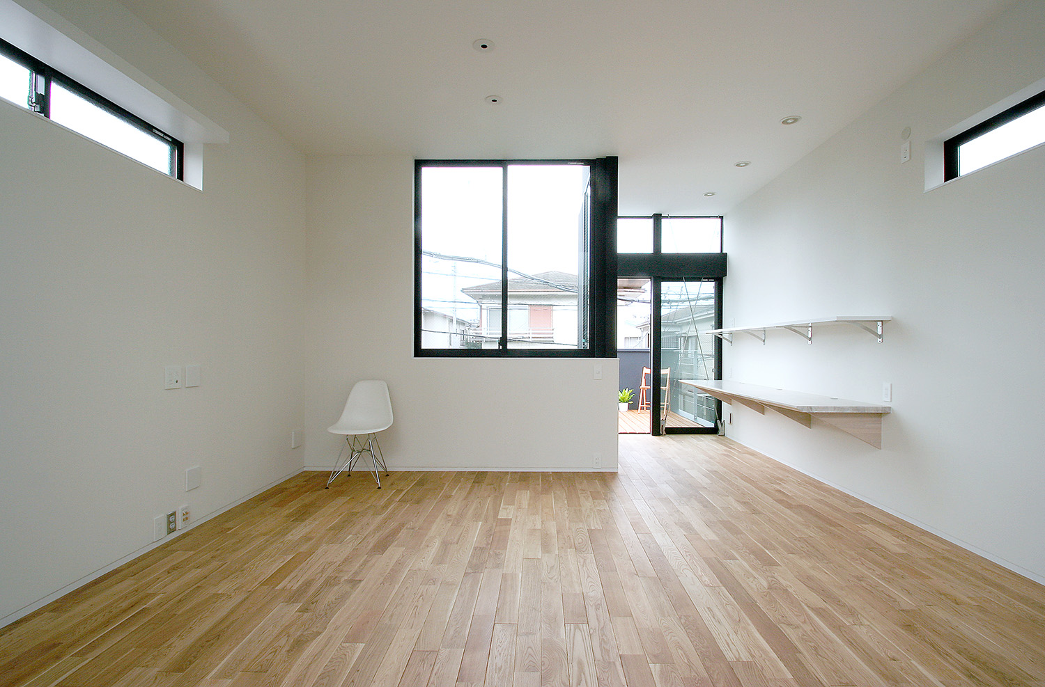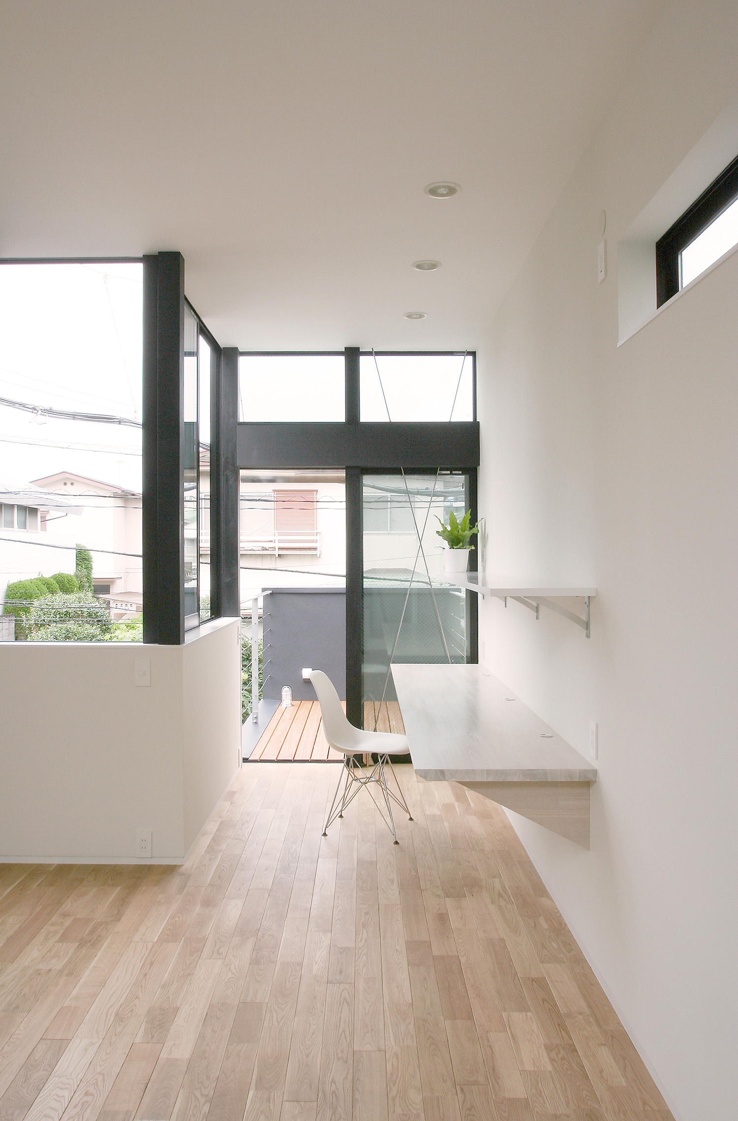 奥行きの長い建物の中心に光の井戸として背の高い吹き抜けた階段ホールを配置。最上部に設けた大きなハイサイドライトから1階まで自然光を導きます。2階リビングからは、さまざまな方向に空を臨むことができるよう開口の位置を工夫。密集した住宅地でありながらプライバシーを確保しつつ光と風を獲得し、自然の変化を敏感に感じることができる生活を演出している。階段ホール上部のハイサイド窓はリビングからでも直接空が見えるよう天井高さや枠の隅切りした形状など細かな検討をしている。道路側に向いては逗子の美しい夕焼けや逗子海岸での花火が見える方向でもあるので、大きな開口部をもうけている。